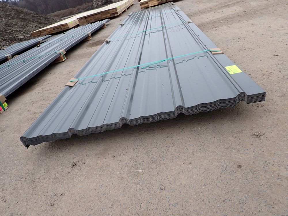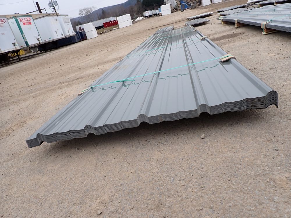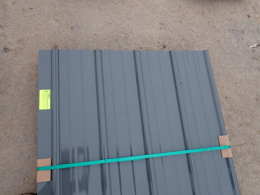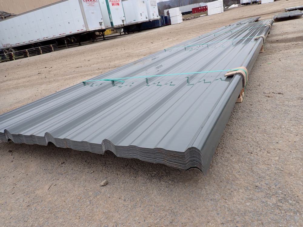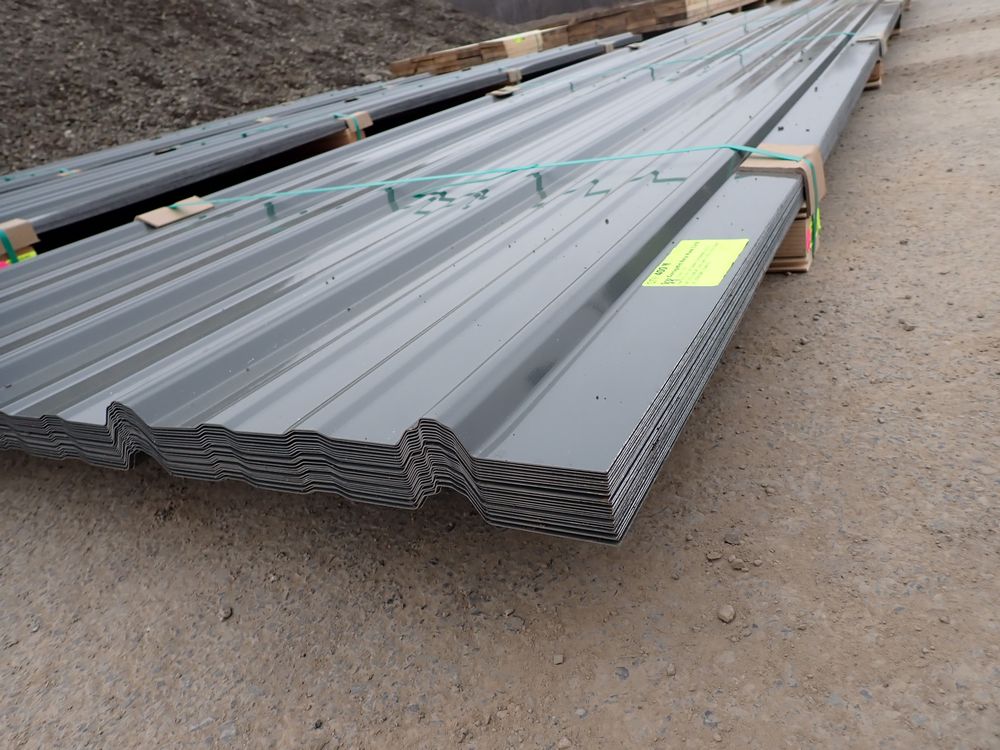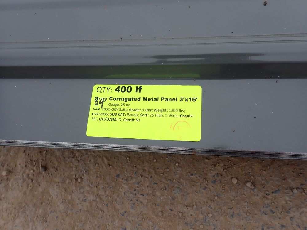 Gray Corrugated Metal Panel 3'x16'. 24 Guage, 25 Piece. Grade: B *Any manufacturer warranties are NOT VALID with any purchase at our Auctions unless stated otherwise.. Weight: 1300 lbs.. Sold by: Linear Foot. Sold as: Quantity x Price.