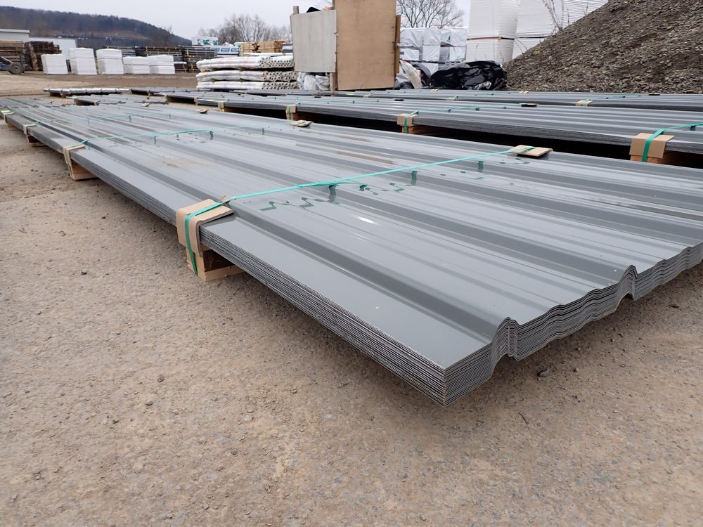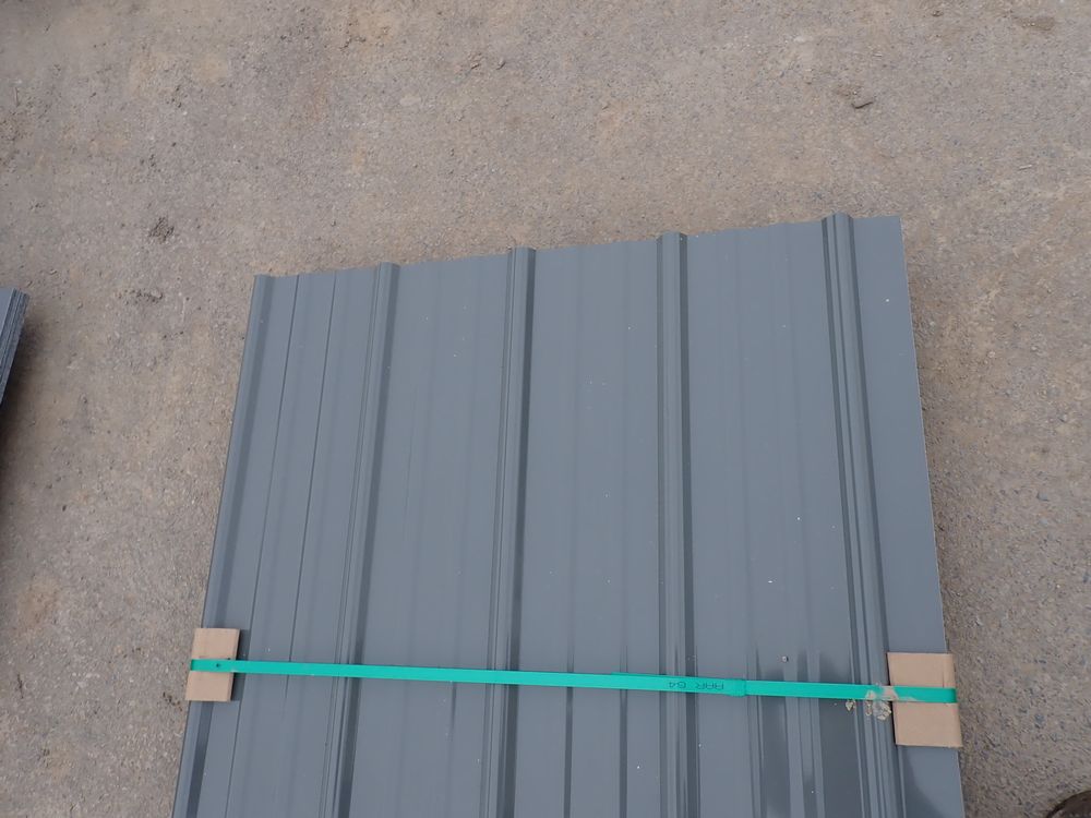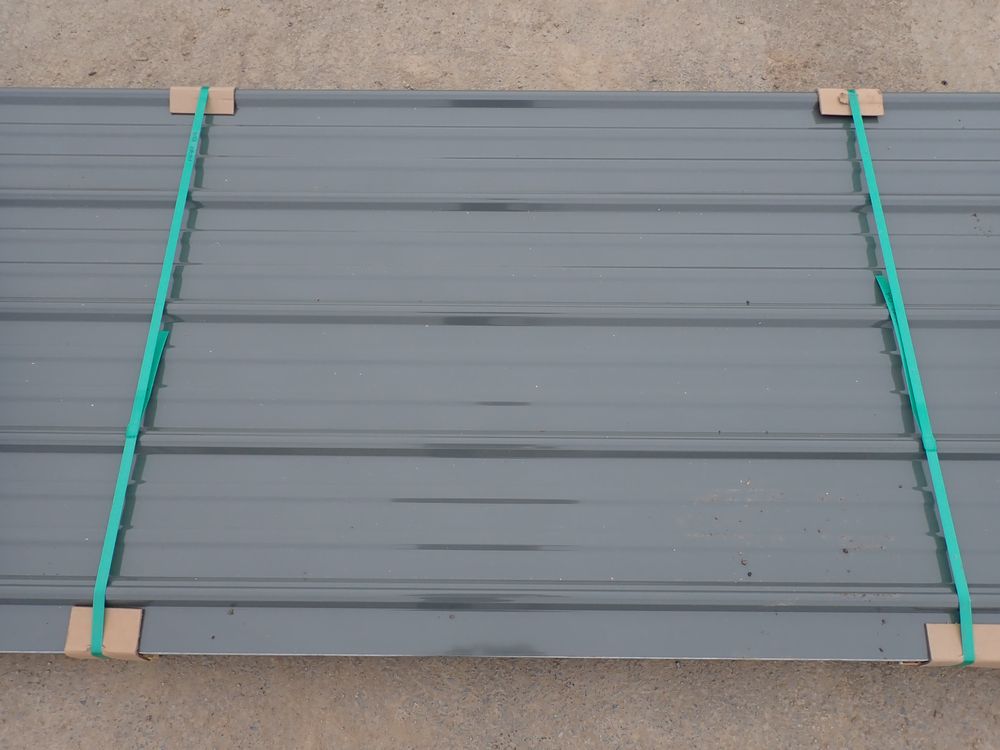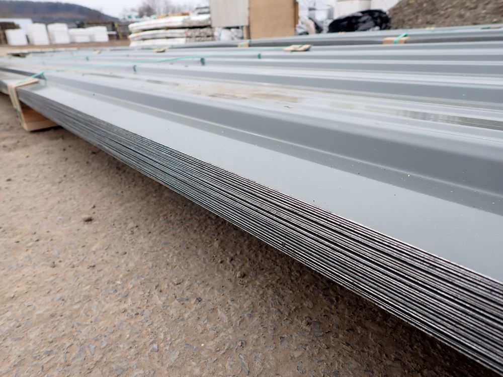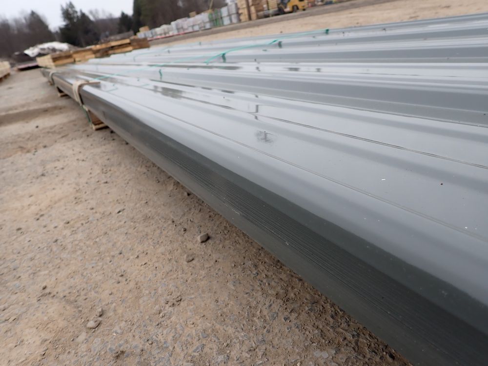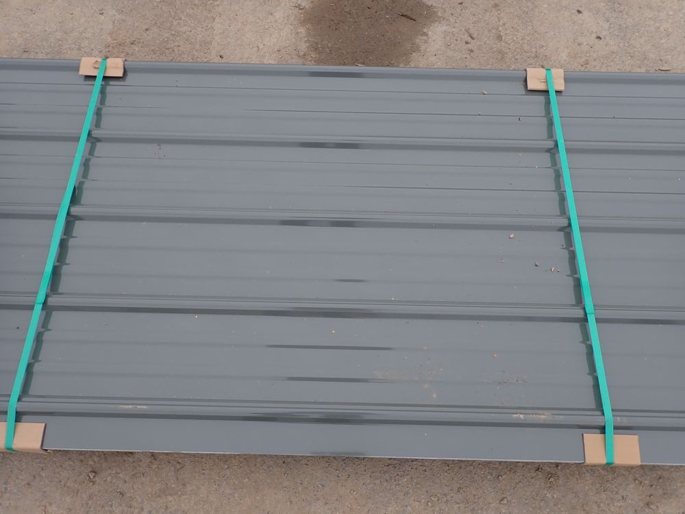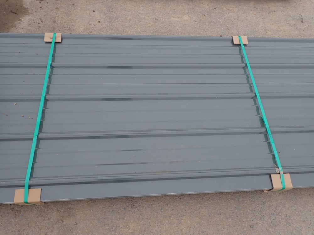 Gray Corrugated Metal Panel 3'x16'. 24 Guage, 25 Piece. Grade: B *Any manufacturer warranties are NOT VALID with any purchase at our Auctions unless stated otherwise.. Weight: 1300 lbs.. Sold by: Linear Foot. Sold as: Quantity x Price.