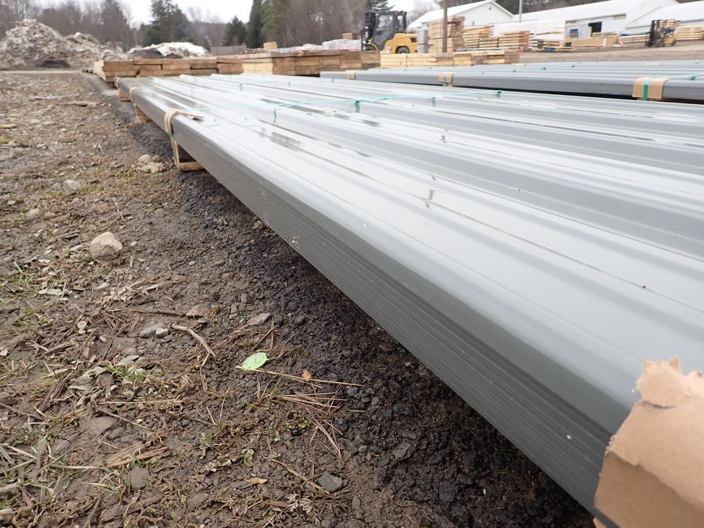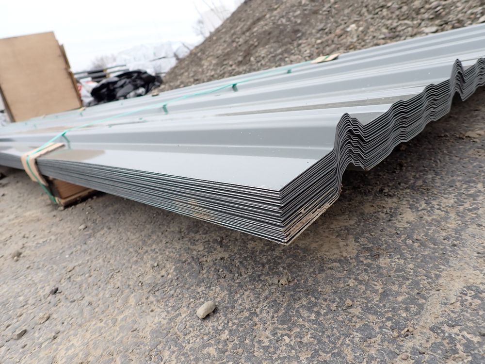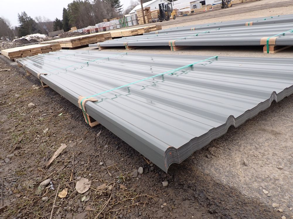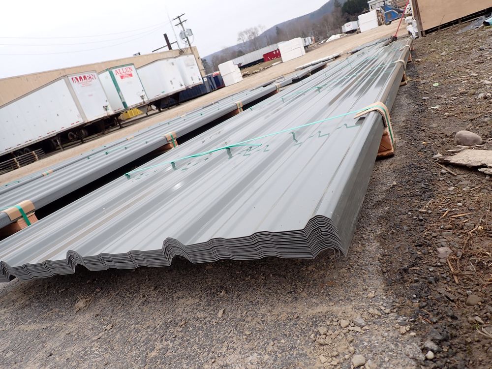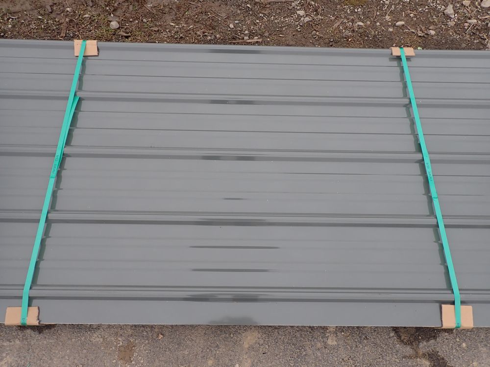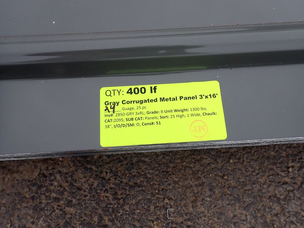 Gray Corrugated Metal Panel 3'x16'. 24 Guage, 25 Piece. Grade: B *Any manufacturer warranties are NOT VALID with any purchase at our Auctions unless stated otherwise.. Weight: 1300 lbs.. Sold by: Linear Foot. Sold as: Quantity x Price.