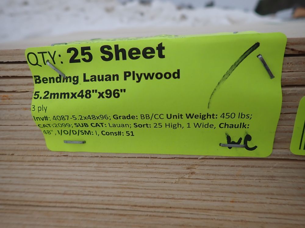 Bending Lauan Plywood 5.2mm x 48" x 96". 3 ply, Grade: BB/CC *Any manufacturer warranties are NOT VALID with any purchase at our Auctions unless stated otherwise.. Weight: 450. Sold by: Sheet. Sold as: Quantity x Price.
