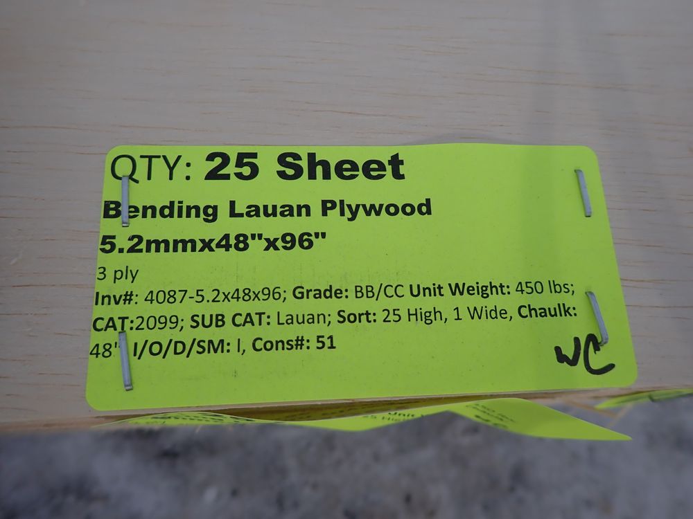 Bending Lauan Plywood 5.2mm x 48" x 96". 3 ply, Grade: BB/CC *Any manufacturer warranties are NOT VALID with any purchase at our Auctions unless stated otherwise.. Weight: 450. Sold by: Sheet. Sold as: Quantity x Price.