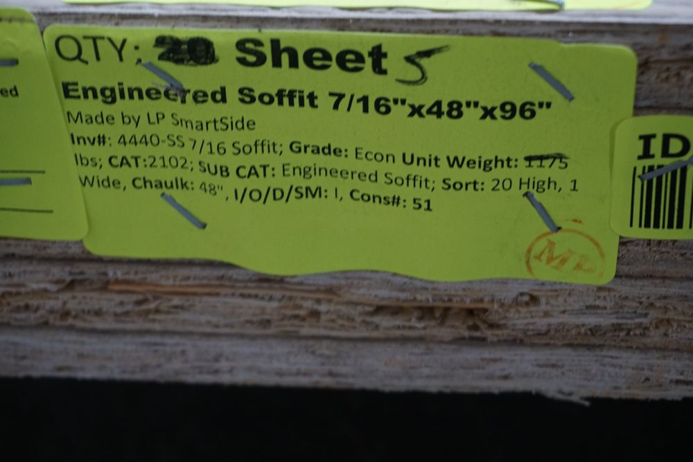 Engineered Soffit, 7/16" x 48" x 96" *See Desc. Made by LP SmartSide. *Delaminated. All Sheets.* Grade: ECON. *Any manufacturer warranties are NOT VALID with any purchase at our Auctions unless stated otherwise.. Weight: x. Sold by: Sheet. Sold as: Quantity x Price.