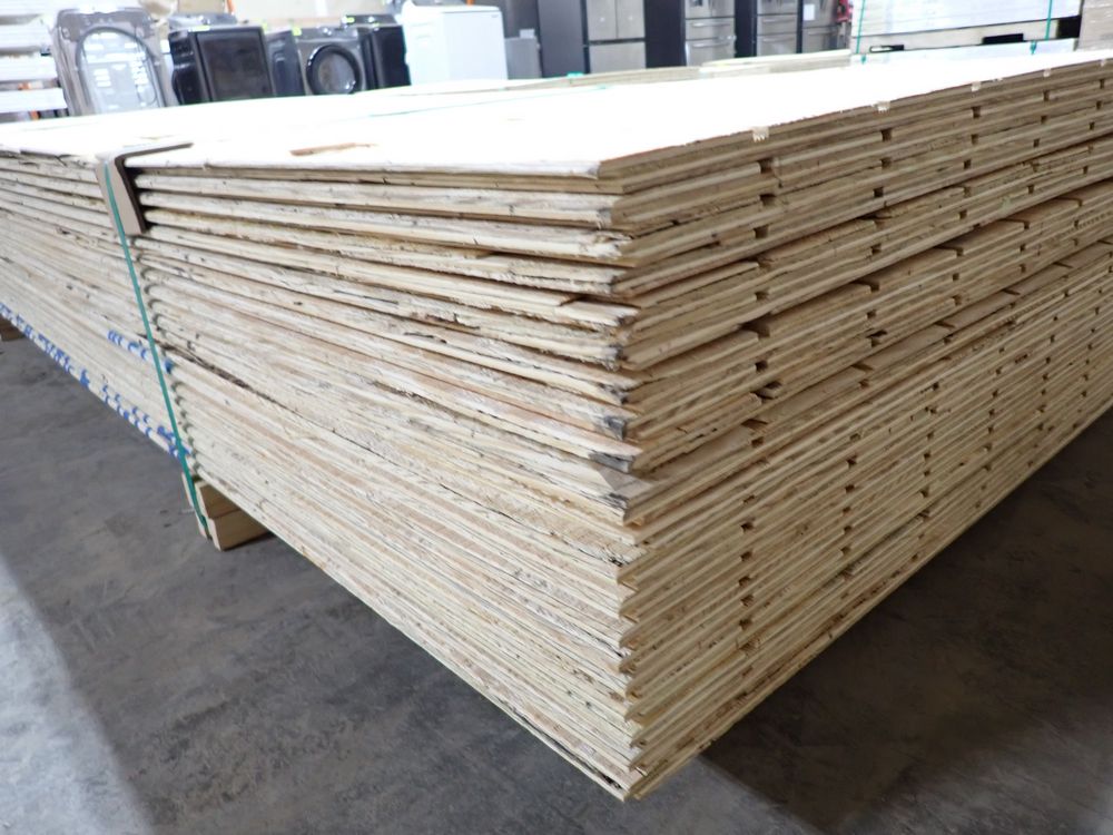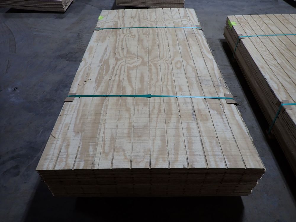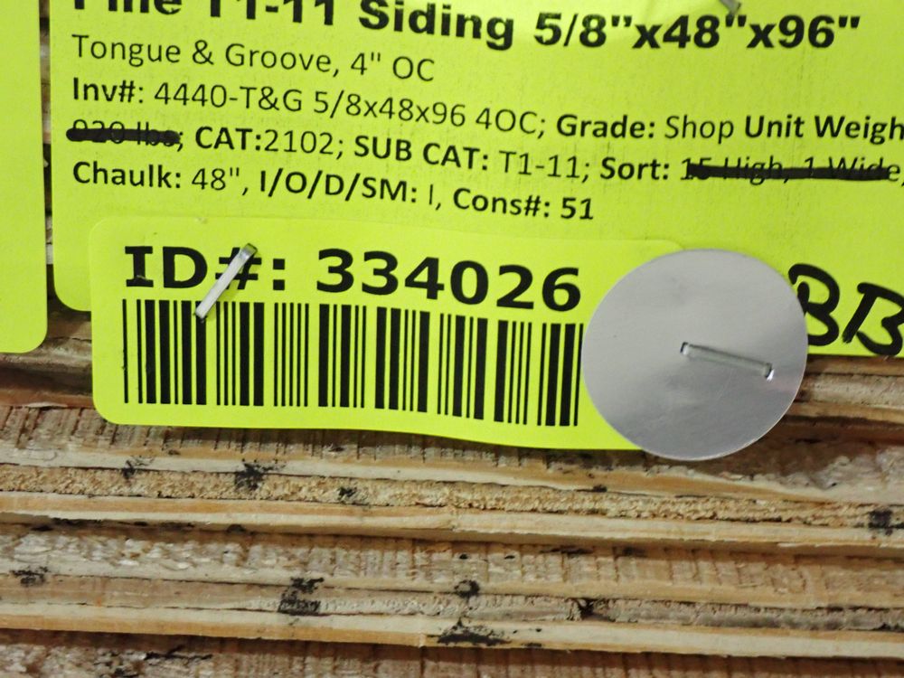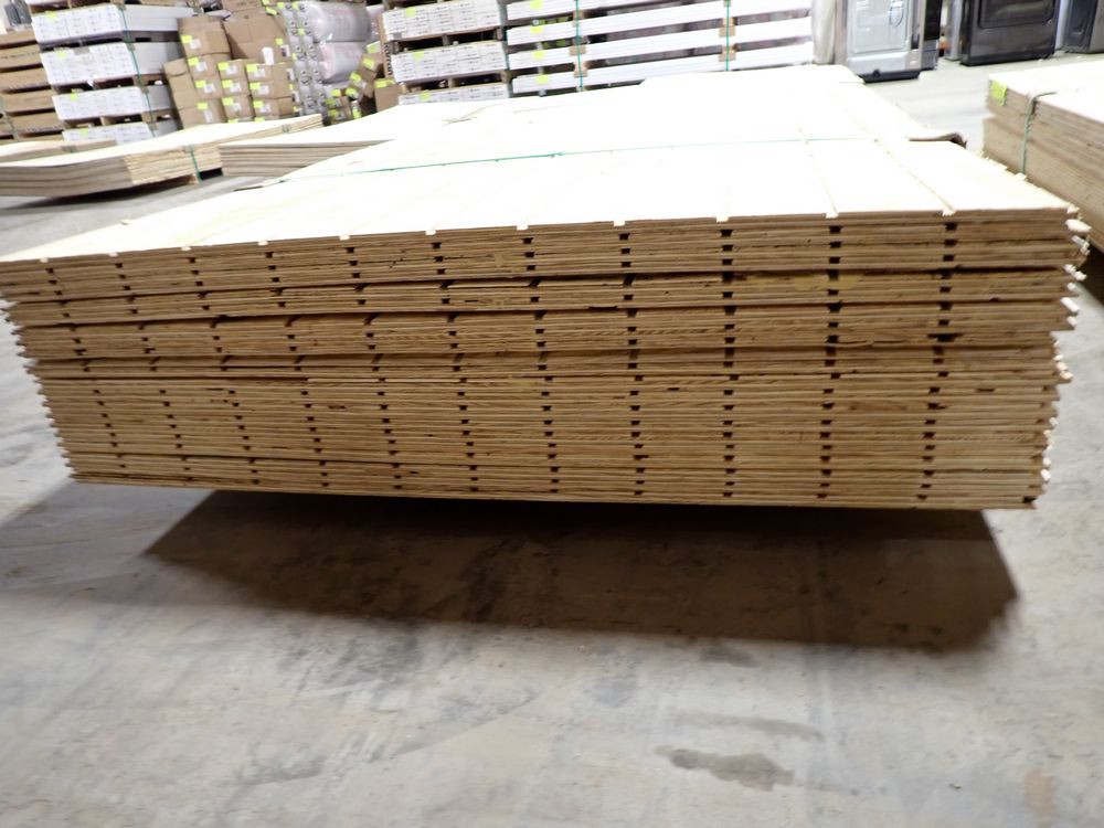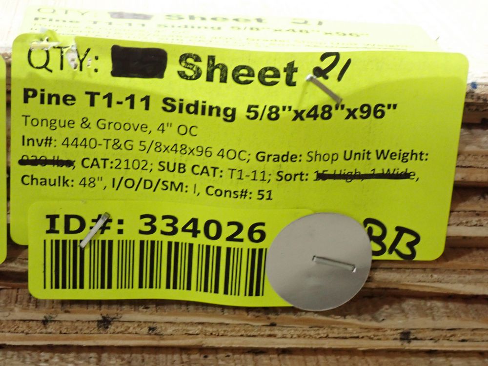 Pine T1-11 Siding 5/8" x 48" x 96" *See Desc. Tongue And Groove, 4" OC, Grade: Shop, Delaminated, Heavy Splits/Cracks, All Sheets, Face Side Has All Edge And Center Bead, Back Of Board Profile Varies *Any manufacturer warranties are NOT VALID with any purchase at our Auctions unless stated otherwise.. Weight: X. Sold by: Sheet. Sold as: Quantity x Price.