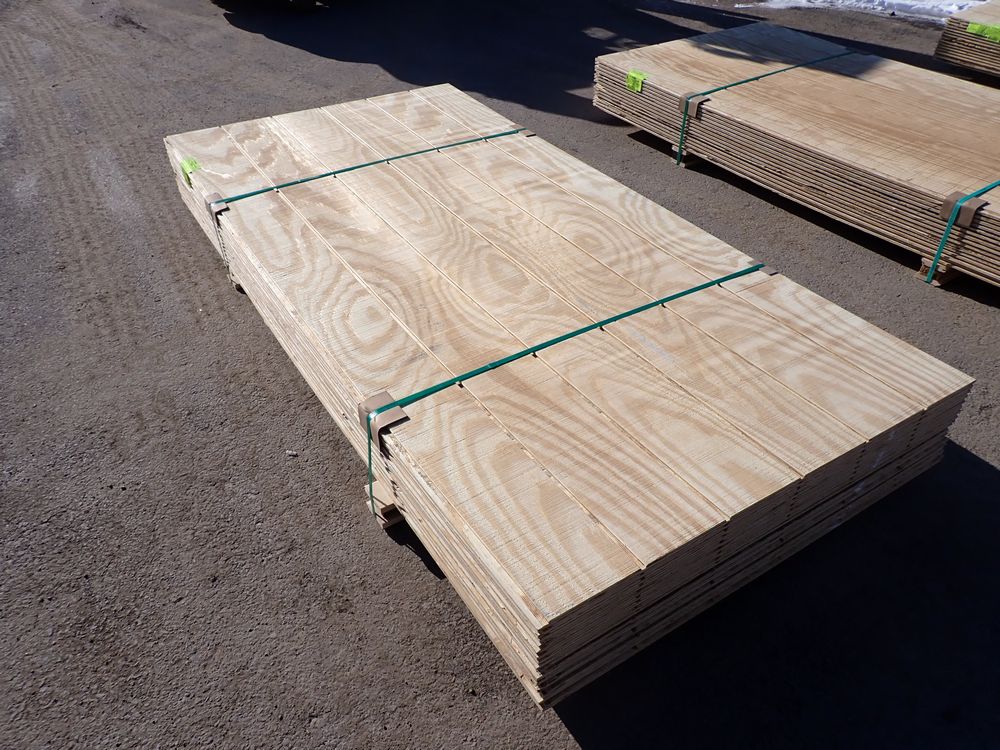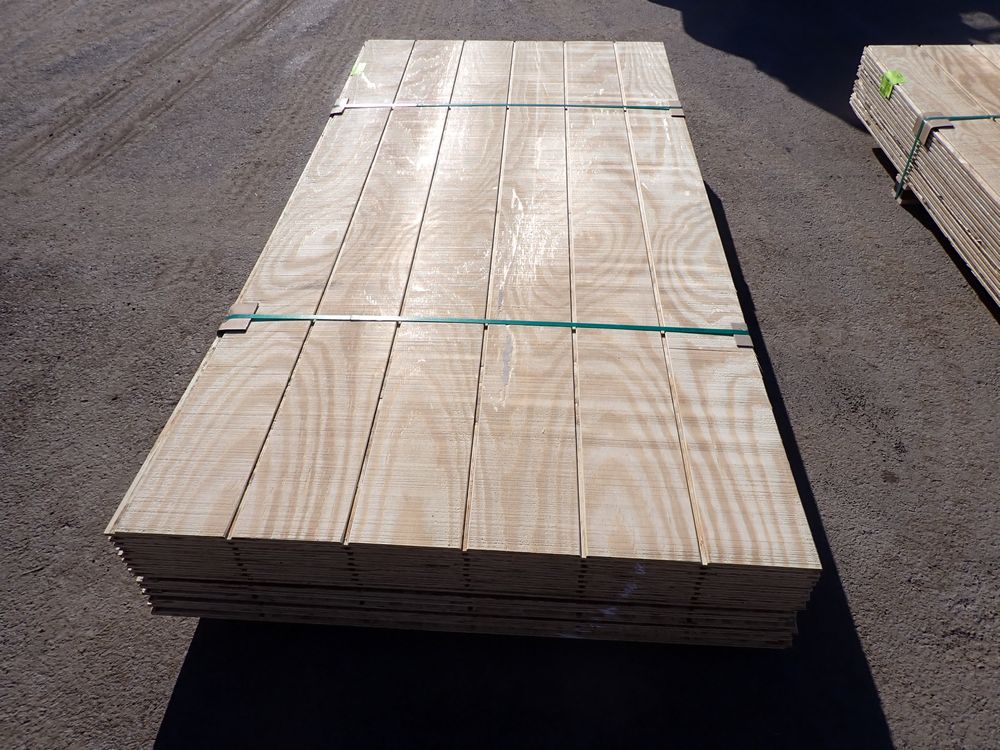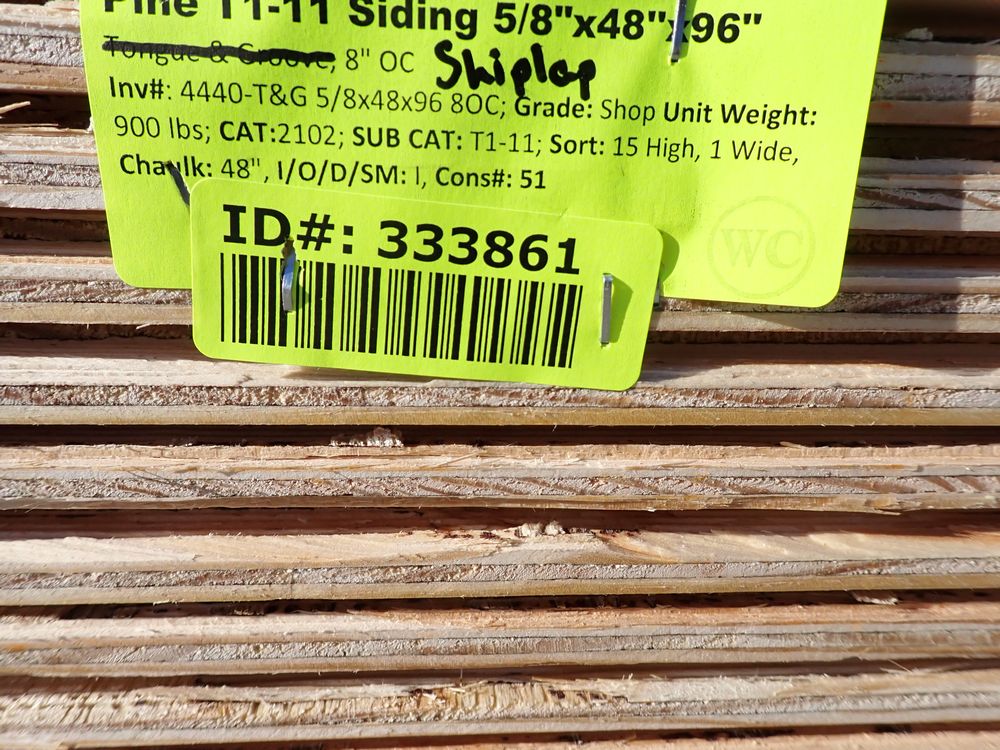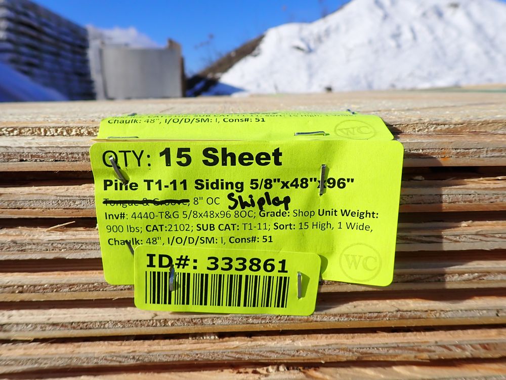 Pine T1-11 Siding 5/8" x 48" x 96". Shiplap, 8" OC, Grade: Shop, Face Side Has All Edge And Center Bead, Back Of Board Profile Varies *Any manufacturer warranties are NOT VALID with any purchase at our Auctions unless stated otherwise.. Weight: 900. Sold by: Sheet. Sold as: Quantity x Price.