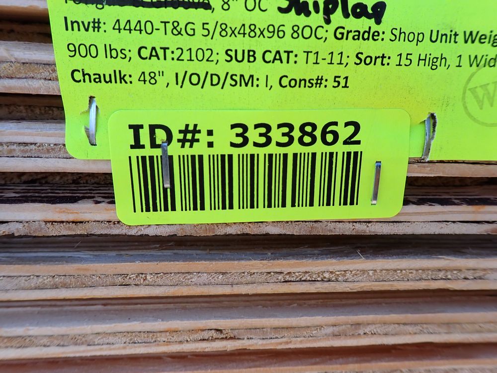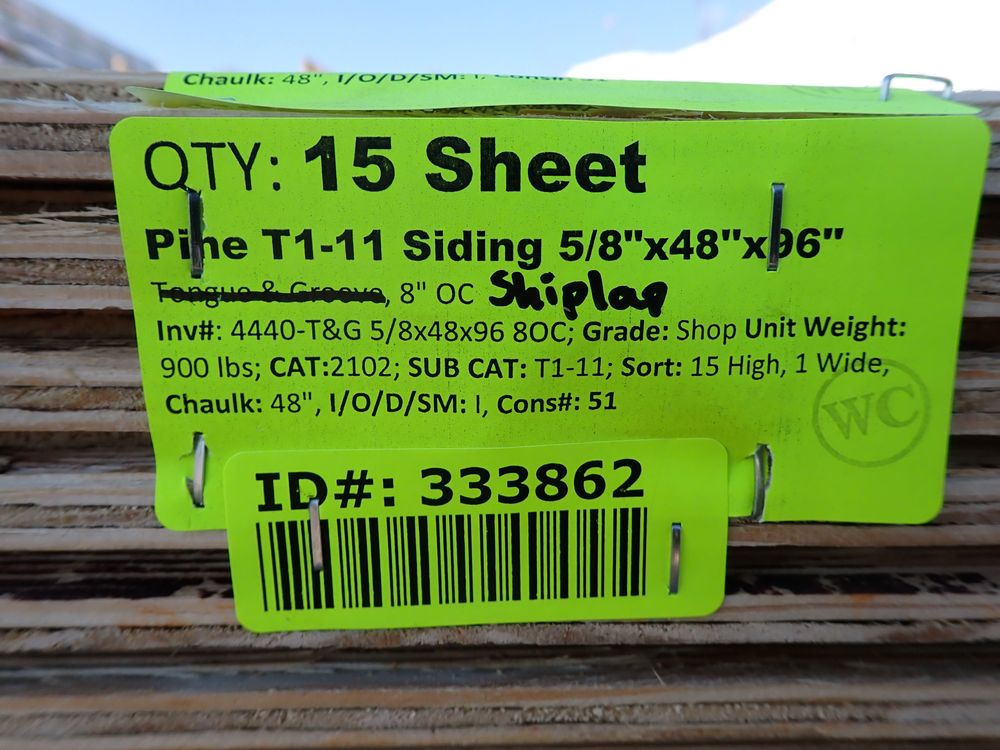 Pine T1-11 Siding 5/8" x 48" x 96" *See Desc. Shiplap, 8" OC, Grade: Shop, Face Side Has All Edge And Center Bead, Back Of Board Profile Varies *Any manufacturer warranties are NOT VALID with any purchase at our Auctions unless stated otherwise.. Weight: 900. Sold by: Sheet. Sold as: Quantity x Price.