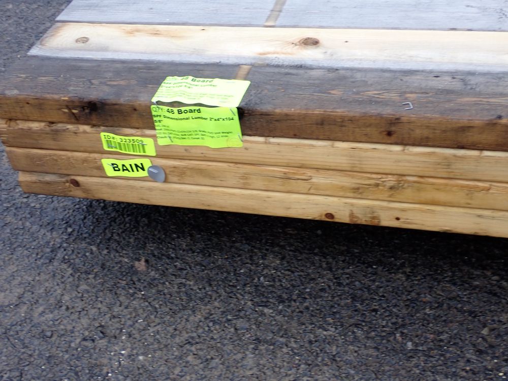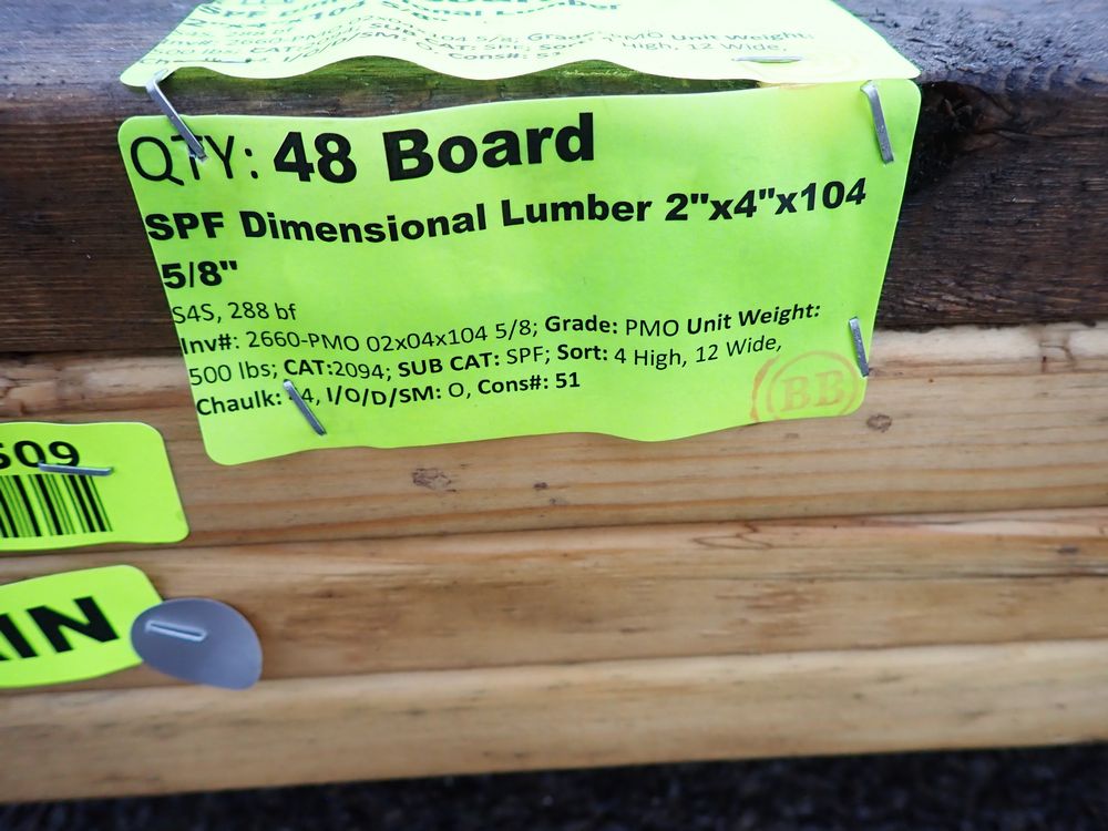 SPF Dimensional Lumber 2" x 4" x 104 5/8". S4S, 288 bf. Grade: PMO *Any manufacturer warranties are NOT VALID with any purchase at our Auctions unless stated otherwise.. Weight: 1500. Sold by: Board. Sold as: Quantity x Price.