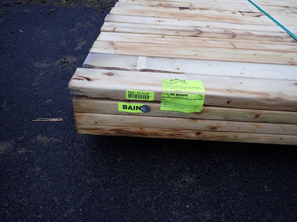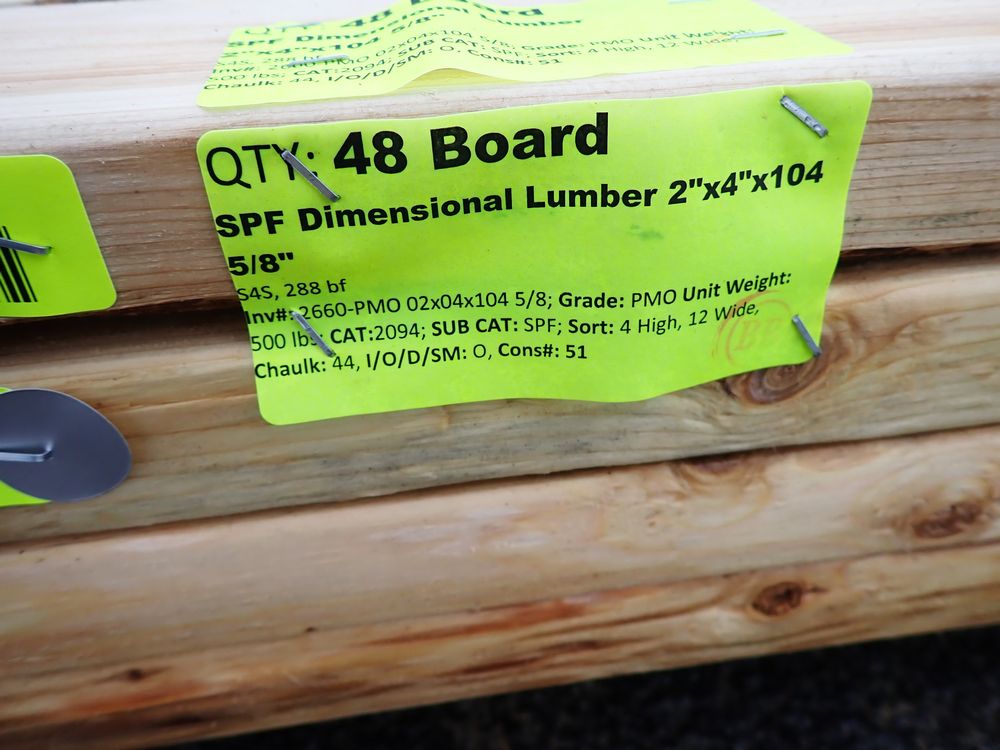 SPF Dimensional Lumber 2" x 4" x 104 5/8". S4S, 288 bf. Grade: PMO *Any manufacturer warranties are NOT VALID with any purchase at our Auctions unless stated otherwise.. Weight: 1500. Sold by: Board. Sold as: Quantity x Price.