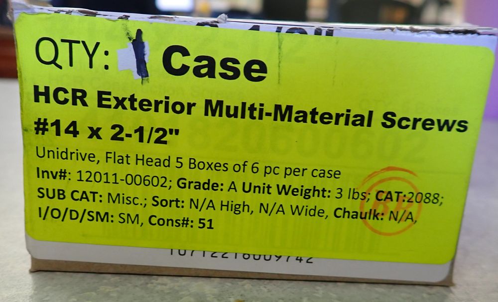 HCR Exterior Multi-Material Screws #14 x 2-1/2". Unidrive, Flat Head 5 Boxes of 6 Pieces Per Case. Grade: A. REID 305231 *Any manufacturer warranties are NOT VALID with any purchase at our Auctions unless stated otherwise.. Weight: 1. Sold by: Case. Sold as: Quantity x Price.