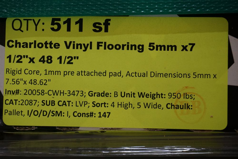 Charlotte Vinyl Flooring 5mm x 7 1/2" x 48 1/2". Rigid Core, 1mm Pre-attached pad, Actual Dimensions: 5mm x 7.56" x 48.62", 20 Boxes, 10 Pcs Per Box, 25.521 SF Per Box. *Any manufacturer warranties are NOT VALID with any purchase at our Auctions unless stated otherwise.. Weight: 950. Sold by: Square Foot. Sold as: Quantity x Price.