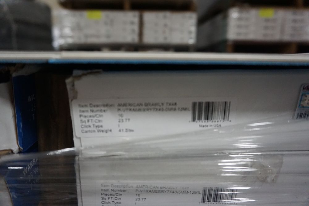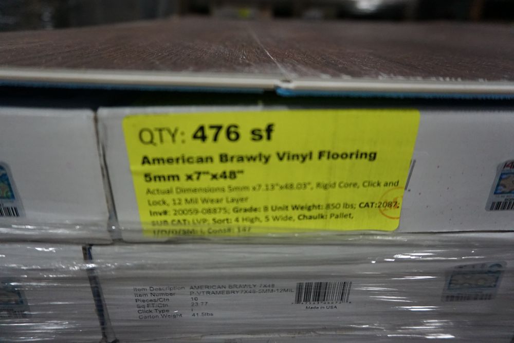 American Brawly Vinyl Flooring 5mm x 7" x 48". Rigid Core,20 Boxes, 10 Pc Per Box, 23.77 Per Box, Actual Dimensions: 5mm x 7.13" x 48.03", Click & Lock, 12 Mil Wear Layer *Any manufacturer warranties are NOT VALID with any purchase at our Auctions unless stated otherwise.. Weight: 850. Sold by: Square Foot. Sold as: Quantity x Price.