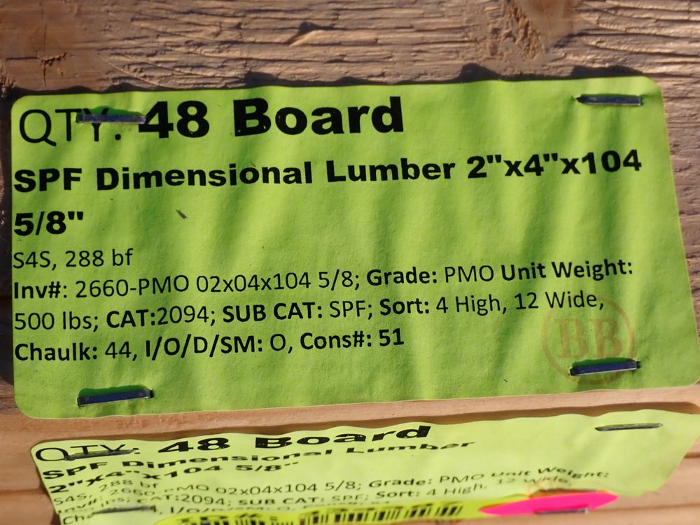 SPF Dimensional Lumber 2" x 4" 104 5/8". S4S, 288 bf, Grade: PMO *Any manufacturer warranties are NOT VALID with any purchase at our Auctions unless stated otherwise.. Weight: 500. Sold by: Board. Sold as: Quantity x Price.