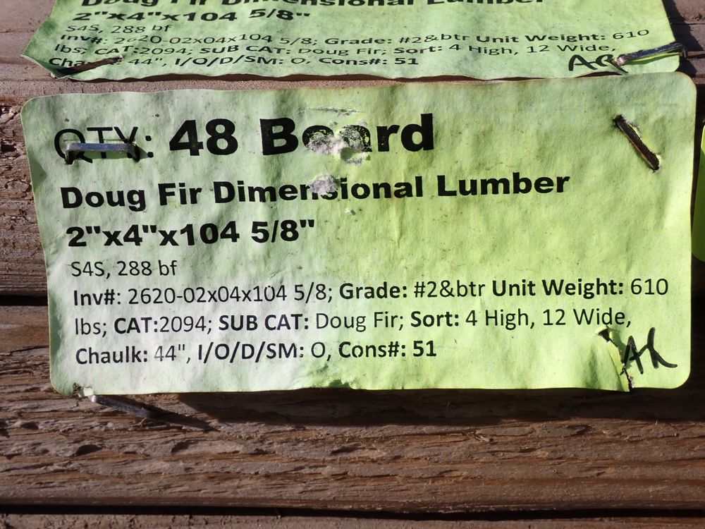 Doug Fir Dimensional Lumber 2" x 4" x 104 5/8". S4S 288 bf, Grade: #2&btr *Any manufacturer warranties are NOT VALID with any purchase at our Auctions unless stated otherwise.. Weight: 610. Sold by: Board. Sold as: Quantity x Price.