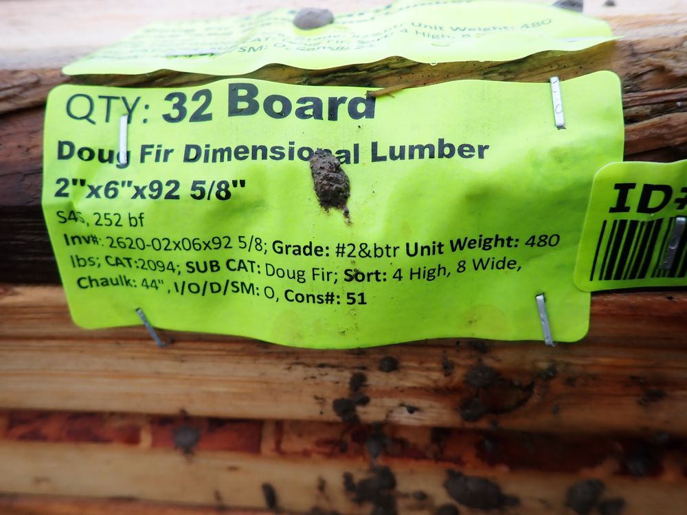 Doug Fir Dimensional Lumber 2" x 6" 92 5/8. S4S, 252 bf, Grade: #2&btr, *Any manufacturer warranties are NOT VALID with any purchase at our Auctions unless stated otherwise.. Weight: 480. Sold by: Board. Sold as: Quantity x Price.
