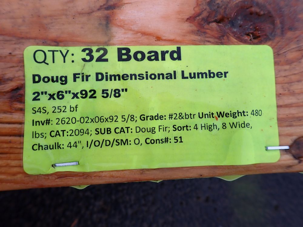 Doug Fir Dimensional Lumber 2" x 6" 92 5/8. S4S, 252 bf, Grade: #2&btr, *Any manufacturer warranties are NOT VALID with any purchase at our Auctions unless stated otherwise.. Weight: 480. Sold by: Board. Sold as: Quantity x Price.