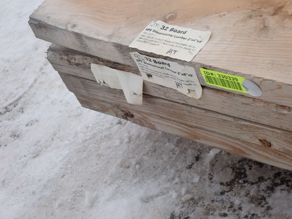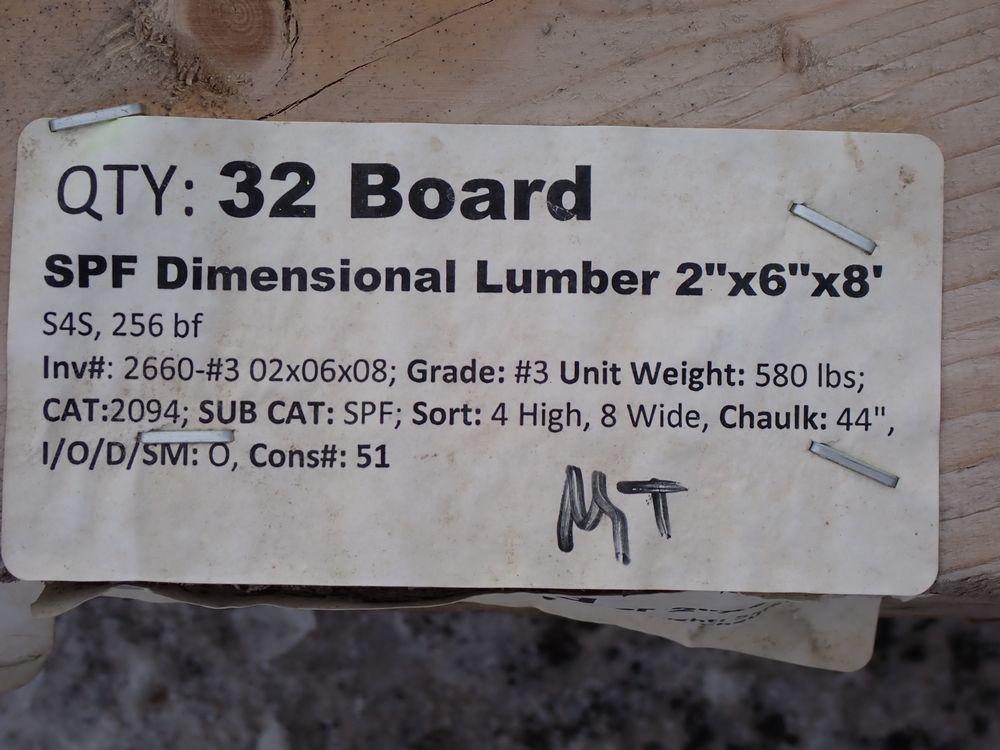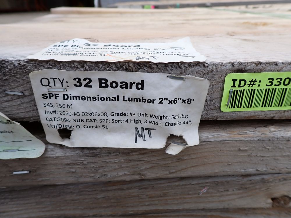 SPF Dimensional Lumber 2" x 6" x 8' *SEE DESCRIPTION*. S4S, 256 bf. Grade: #3. *All boards are weathered, and light mold. * *Any manufacturer warranties are NOT VALID with any purchase at our Auctions unless stated otherwise.. Weight: 580. Sold by: Board. Sold as: Quantity x Price.