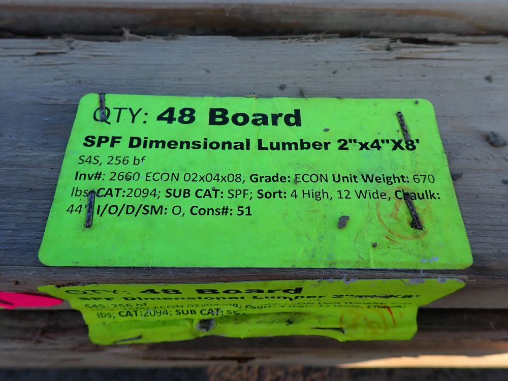 SPF Dimensional Lumber 2" x 4" x 8'. S4S 256 bf, Grade: ECON *Any manufacturer warranties are NOT VALID with any purchase at our Auctions unless stated otherwise.. Weight: 670. Sold by: Board. Sold as: Quantity x Price.