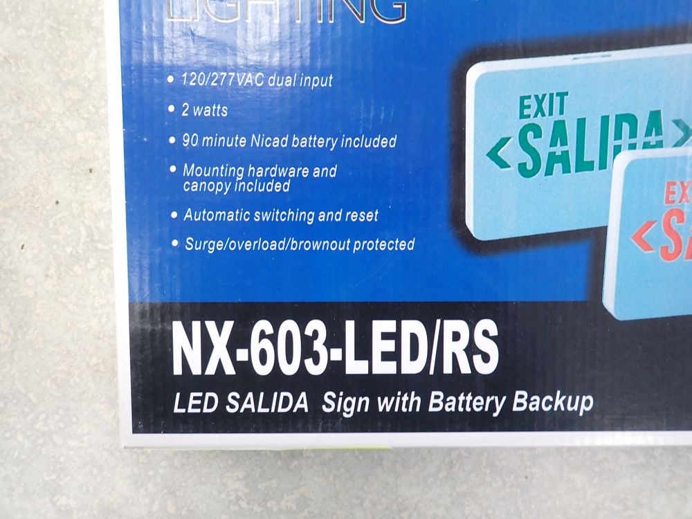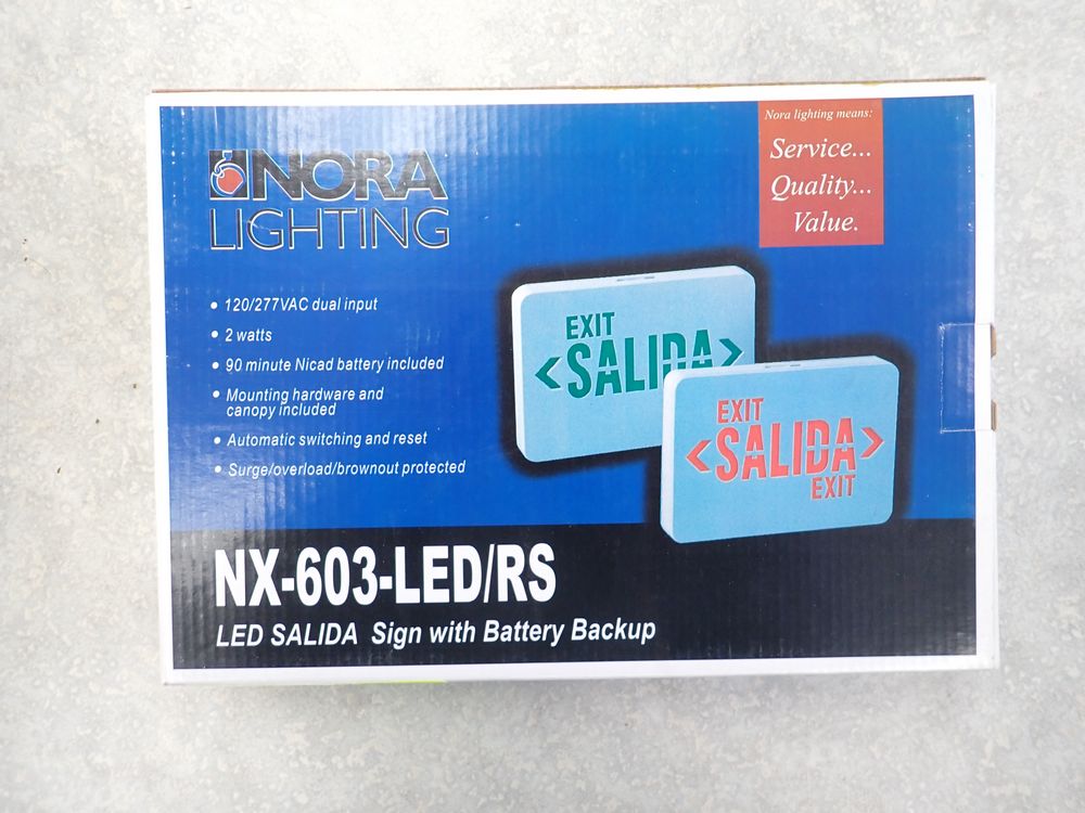 LED Red Exit SALIDA Single Face Sign with Battery Backup in White Finish. By: Nora Lighting. Model # NX-603-LED/RS. Grade: A *Any manufacturer warranties are NOT VALID with any purchase at our Auctions unless stated otherwise.. Weight: 8. Sold by: Piece. Sold as: Quantity x Price.