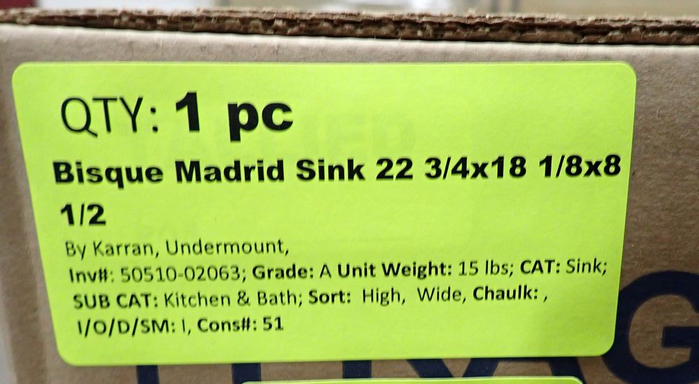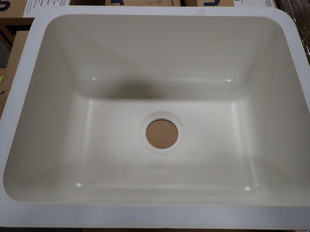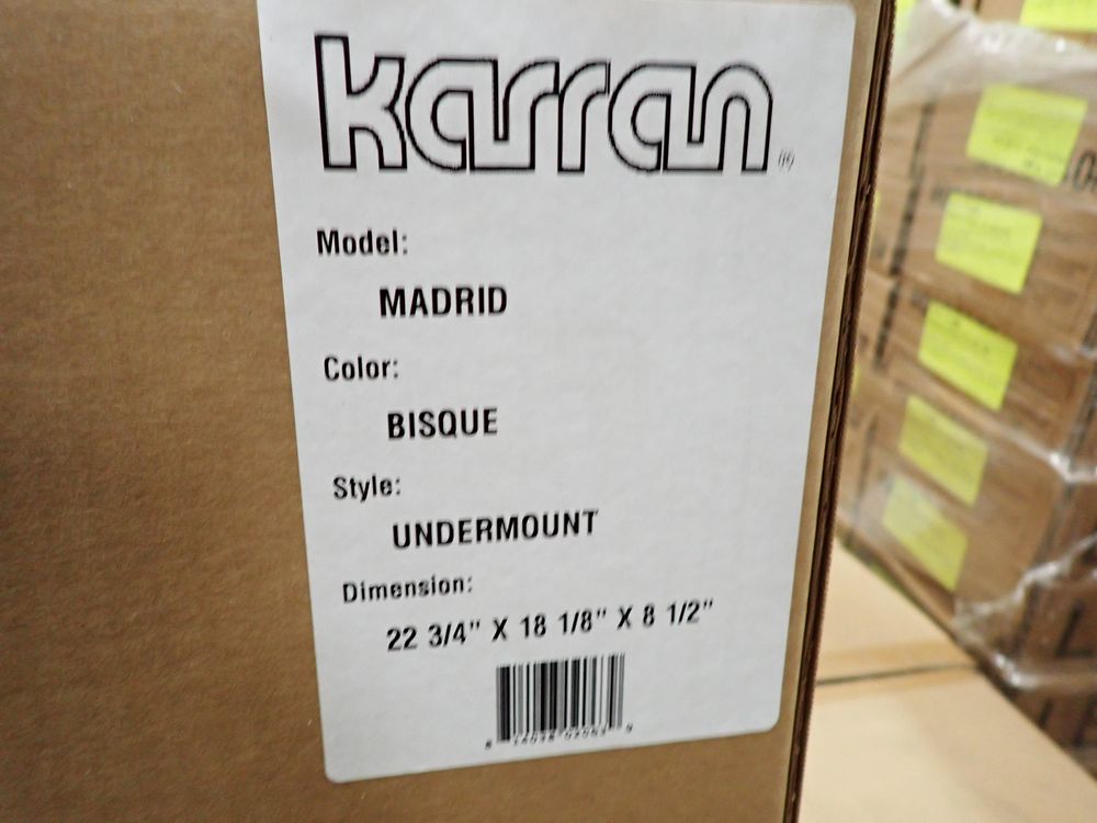 Bisque Madrid Acrylic Sink 23". By Karran, Acrylic Undermount. Actual Dimensions are 22 3/4"(L), 18 1/8"(W), 8 1/2"(D). Grade: A *Any manufacturer warranties are NOT VALID with any purchase at our Auctions unless stated otherwise.. Weight: 15. Sold by: Piece. Sold as: Quantity x Price.