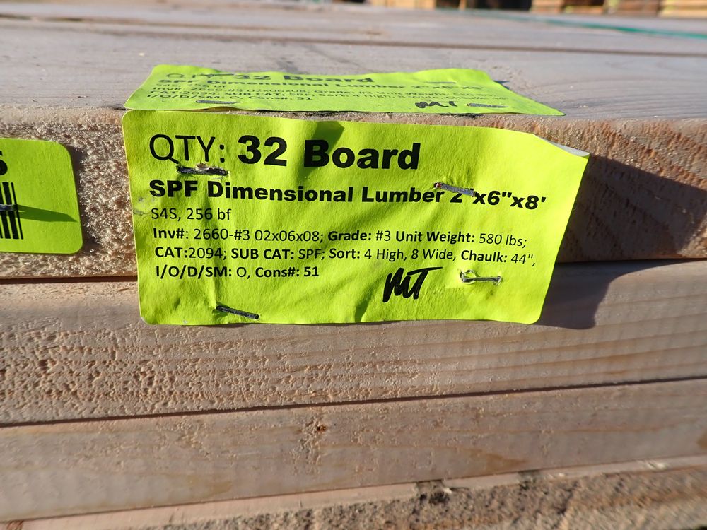 SPF Dimensional Lumber 2" x 6" x 8'. S4S, 256 bf. Grade: #3 *Any manufacturer warranties are NOT VALID with any purchase at our Auctions unless stated otherwise.. Weight: 580. Sold by: Board. Sold as: Quantity x Price.