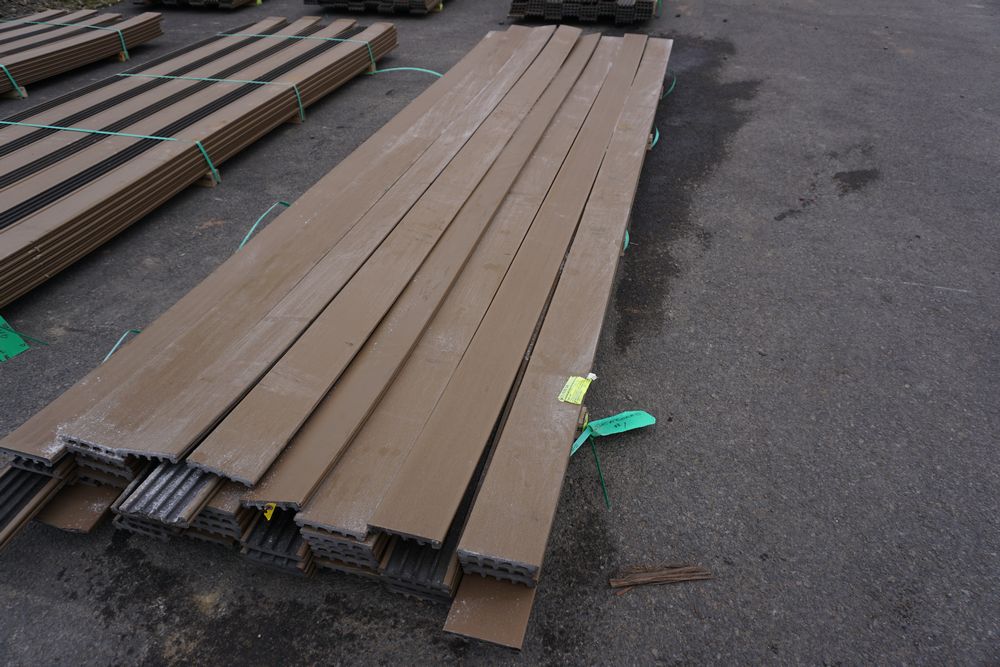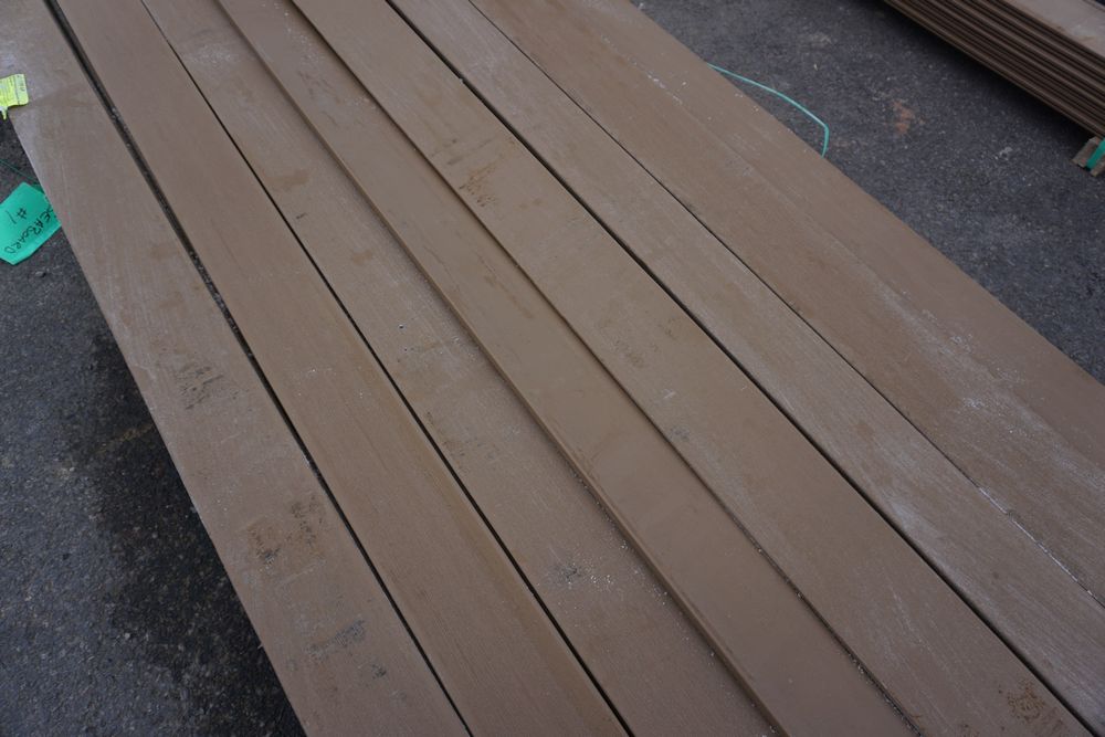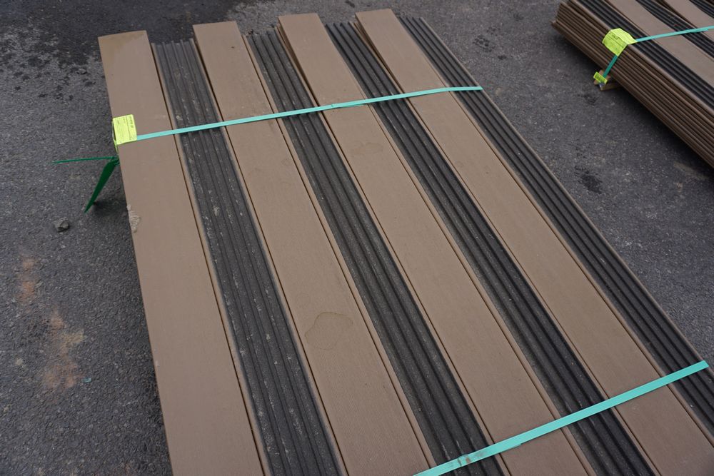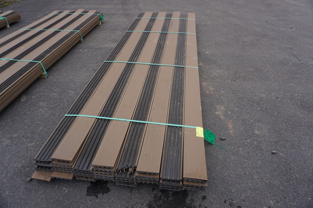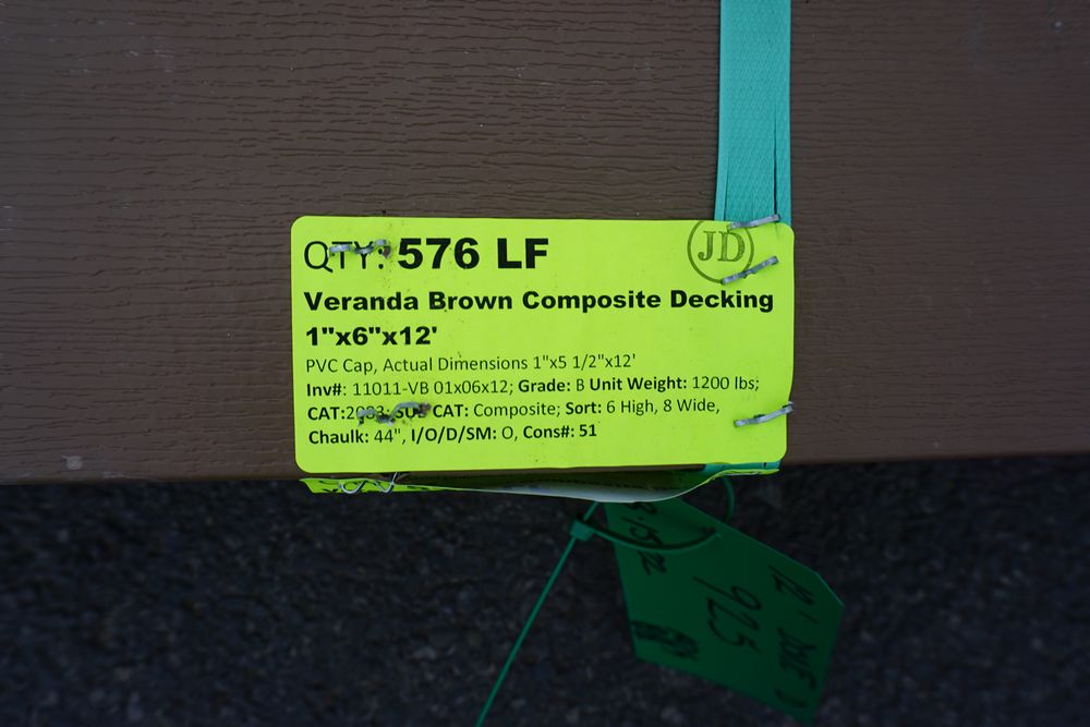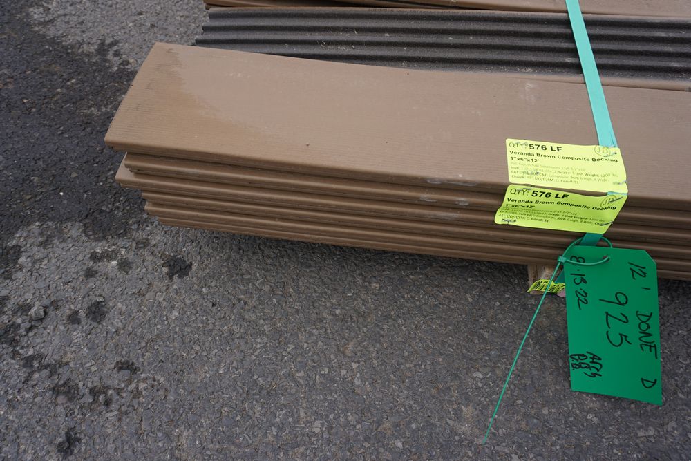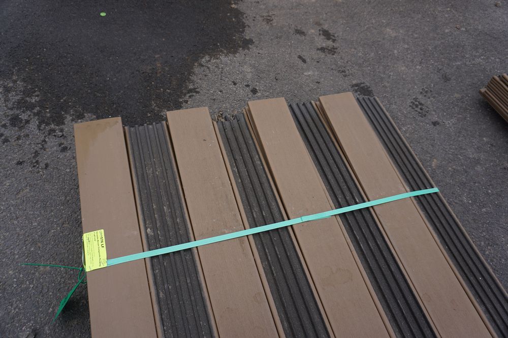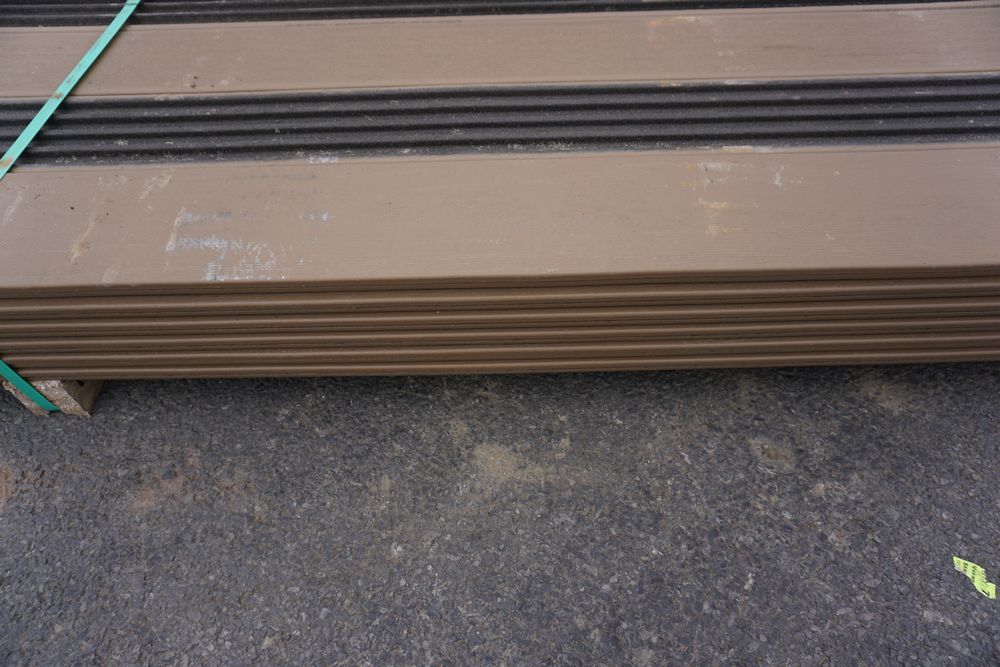 Veranda Brown Composite Decking 1" x 6" x 12'. PVC Cap, Actual Dimensions 1" x 5 1/2" x 12'. Scalloped and Grooved Edges. 48 Boards. Grade: B. *1 board is damaged on end and another has minor imperfections - please pay close attention to photos. *Any manufacturer warranties are NOT VALID with any purchase at our Auctions unless stated otherwise.. Weight: 1200. Sold by: Linear Foot. Sold as: Quantity x Price.