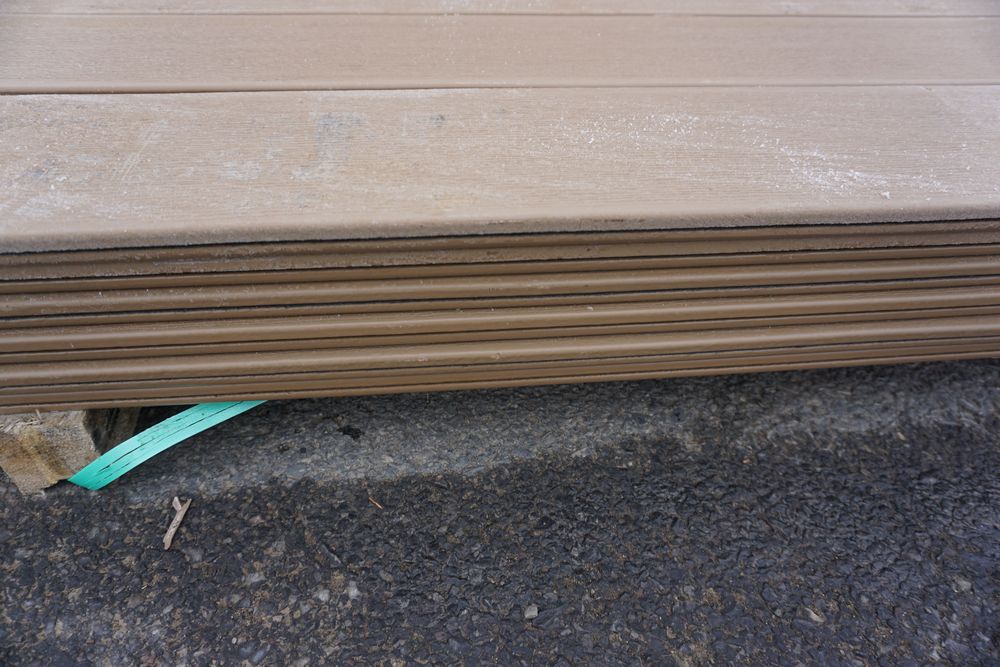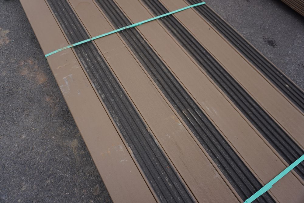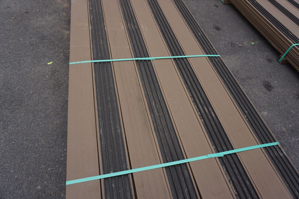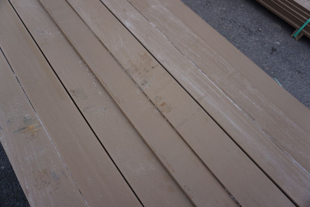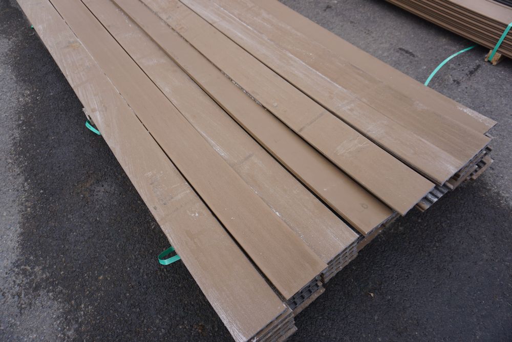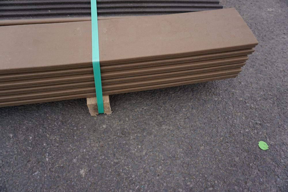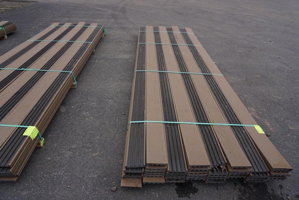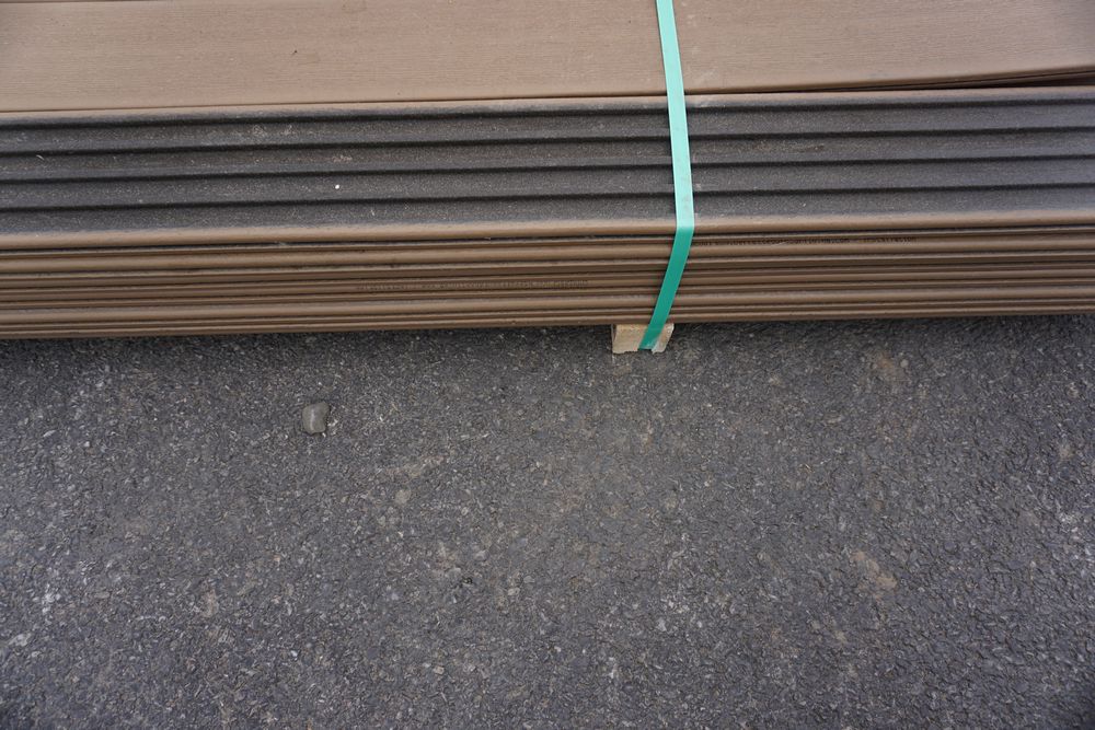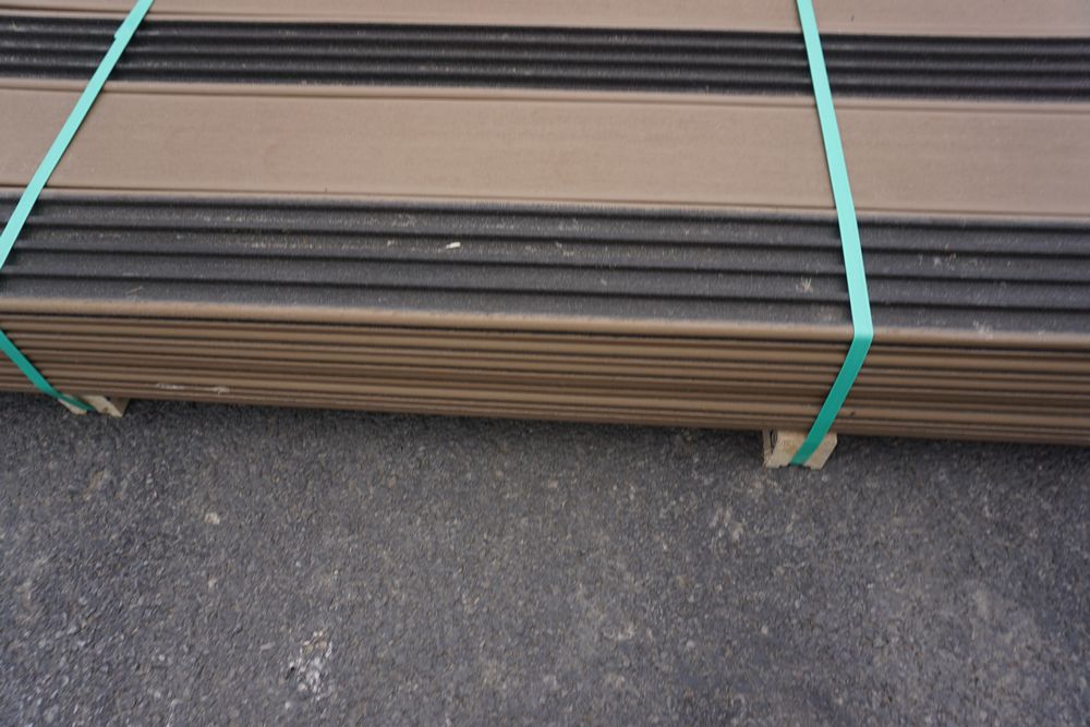 Veranda Brown Composite Decking 1" x 6" x 12'. PVC Cap, Actual Dimensions 1" x 5 1/2" x 12'. Scalloped and Grooved Edges. 48 Boards. Grade: B. *1 board is damaged on end and another has minor imperfections - please pay close attention to photos. *Any manufacturer warranties are NOT VALID with any purchase at our Auctions unless stated otherwise.. Weight: 1200. Sold by: Linear Foot. Sold as: Quantity x Price.