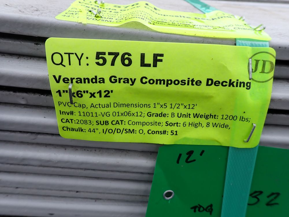Veranda Gray Composite Decking 1" x 6" x 12'. PVC Cap, Actual Dimensions 1" x 5 1/2" x 12', Scalloped Double Grooved, 48 Boards. Grade: B. * A couple boards have scrapes/gouges - please pay close attention to photos. *Any manufacturer warranties are NOT VALID with any purchase at our Auctions unless stated otherwise.. Weight: 1200. Sold by: Linear Foot. Sold as: Quantity x Price.