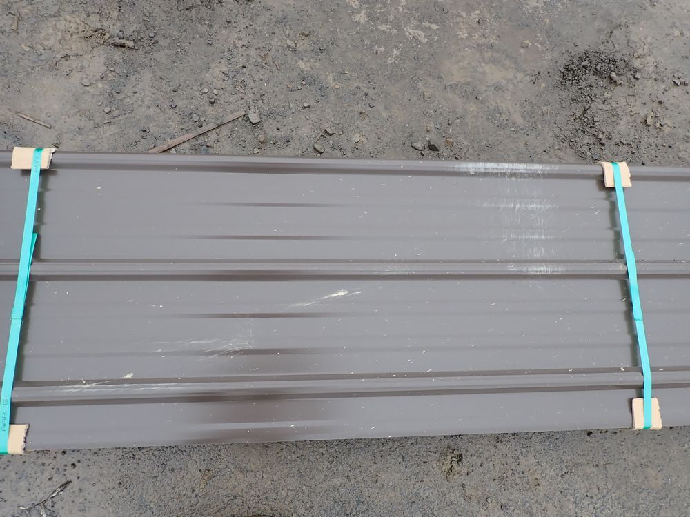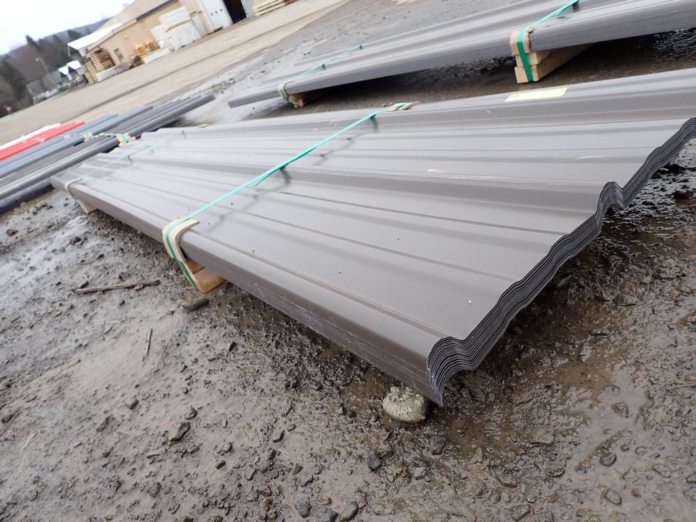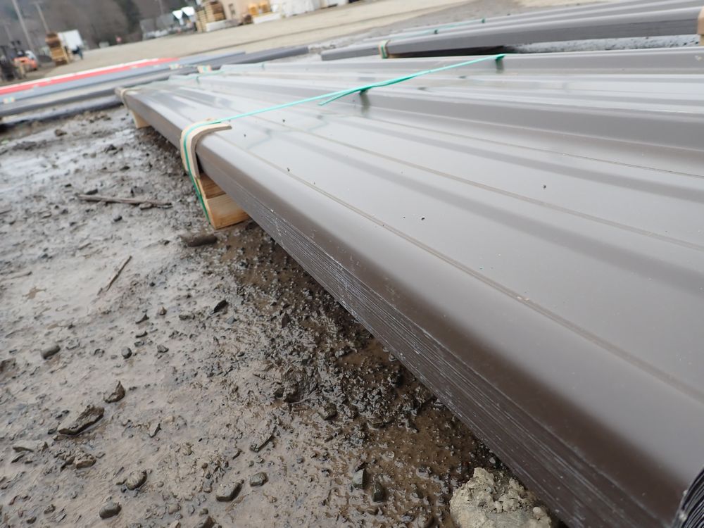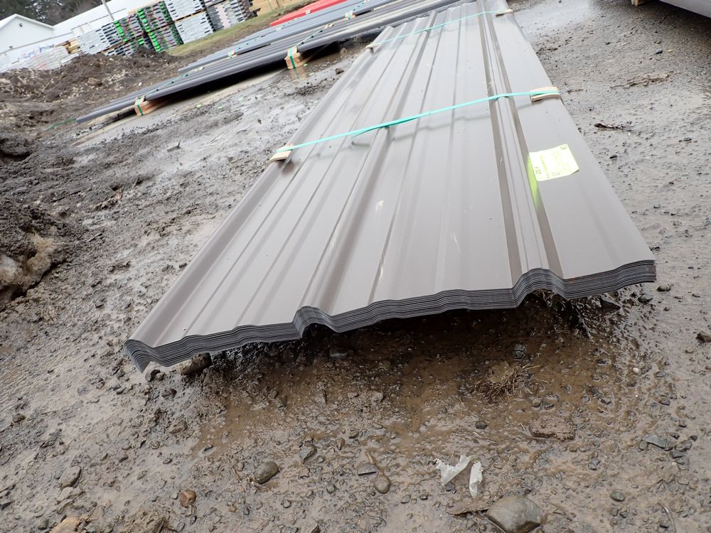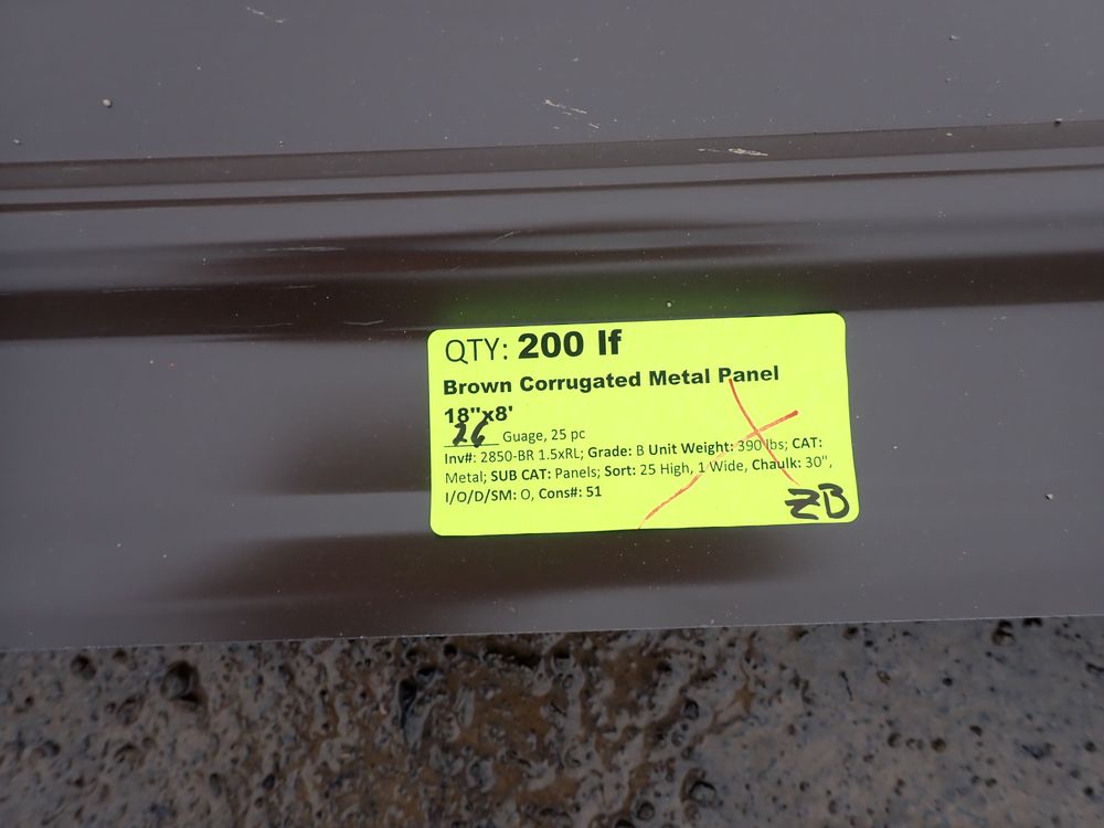 Brown Corrugated Metal Panel 18"x8'. 26 Guage, 25 Piece. Grade: B *Any manufacturer warranties are NOT VALID with any purchase at our Auctions unless stated otherwise.. Weight: 390 lbs.. Sold by: Linear Foot. Sold as: Quantity x Price.