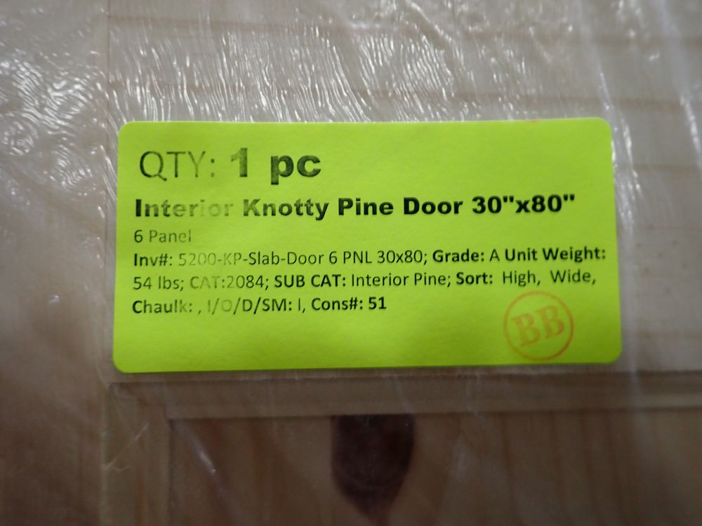 Interior Knotty Pine Door 30" x 80". 6 Panel, Grade: A *Any manufacturer warranties are NOT VALID with any purchase at our Auctions unless stated otherwise.. Weight: X. Sold by: Piece. Sold as: Quantity x Price.
