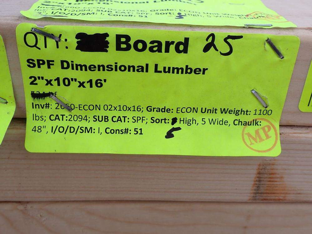 SPF Dimensional Lumber 2" x 10 x 16' *SEE DESCRIPTION*. Grade: ECON *All boards have heavy splits, and cracks.* *Any manufacturer warranties are NOT VALID with any purchase at our Auctions unless stated otherwise.. Weight: x. Sold by: Board. Sold as: Quantity x Price.