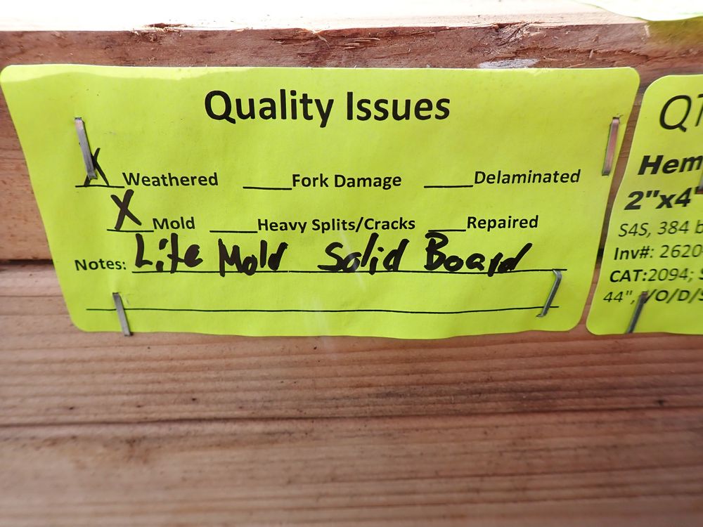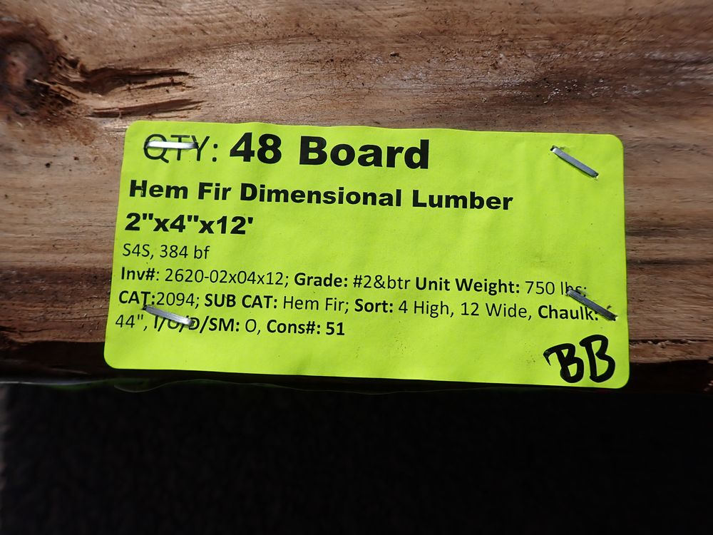 Hem Fir Dimensional Lumber 2" x 4" x 12' *SEE DESCRIPTION*. S4S, 384 bf. Grade: #2&btr *Weathered, Light Mold, Solid boards.* *Any manufacturer warranties are NOT VALID with any purchase at our Auctions unless stated otherwise.. Weight: 750. Sold by: Board. Sold as: Quantity x Price.