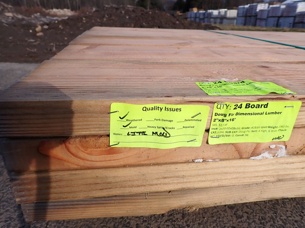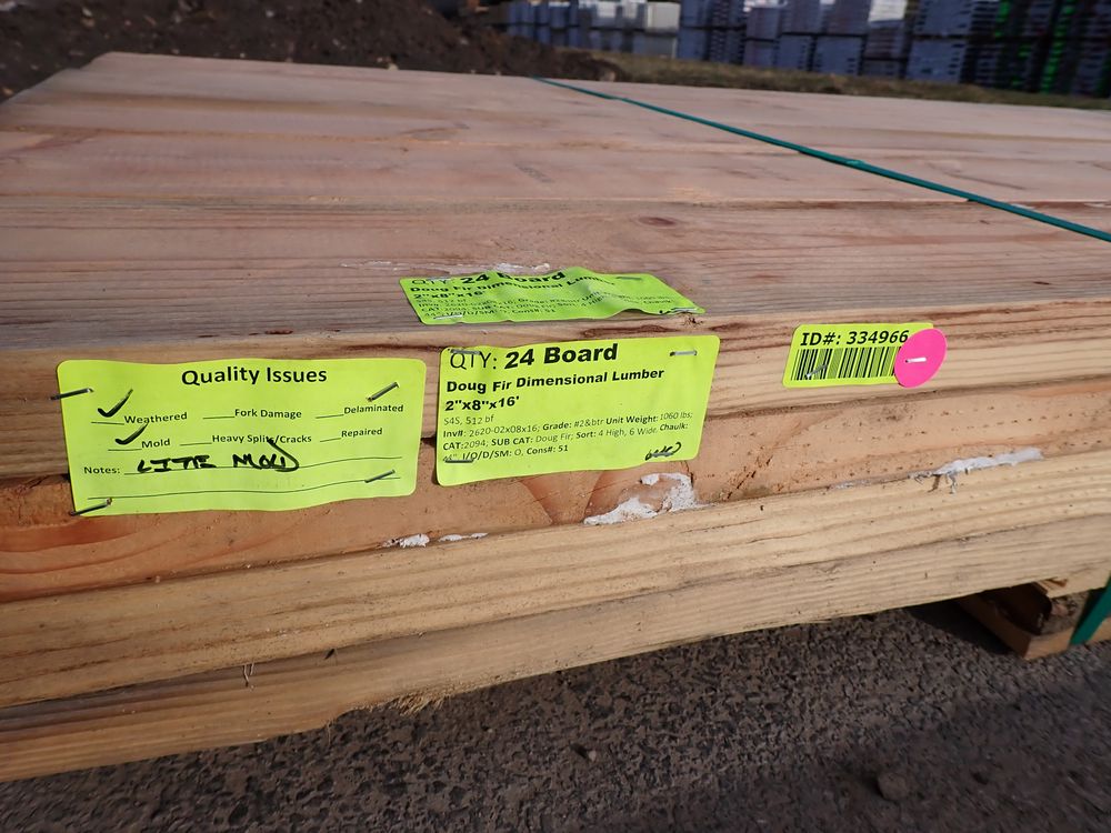 Doug Fir Dimensional Lumber 2" x 8" x 16' *SEE DESCRIPTION*. S4S, 512 bf. Grade: #2&btr *Weathered, light mold.* *Any manufacturer warranties are NOT VALID with any purchase at our Auctions unless stated otherwise.. Weight: 1060. Sold by: Board. Sold as: Quantity x Price.