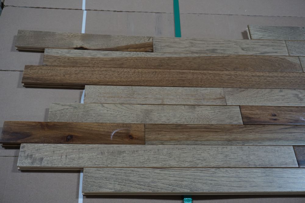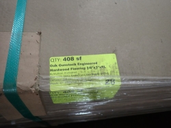 Oak Gunstock Engineered Hardwood Flooring 3/8" x 3" x RL. 18 Boxes, 25.5 SF Per Box, By: Mullican, Prefinished, Grade: Cabin. Chalk marks are from manufacturer and can be wiped off. Cabin/Utility/Tavern Grade: This flooring product will have varying wood characteristics and colors to include streaks, deeper knots and burls, small splits, wormholes, and even marks during the milling process such as machine burns. It may also have a large variance in color and grain patterns. The boards are typically 10” to 30” with an average board length of 16”. It is usually packaged in mini bundles of 18-20 sf per bundle. It is ok for 5” wide to be heavier in shorter pieces. Cabin grade is a stable, installable product but please account up to 10%-20% waste. *Any manufacturer warranties are NOT VALID with any purchase at our Auctions unless stated otherwise.. Weight: x. Sold by: Square Foot. Sold as: Quantity x Price.