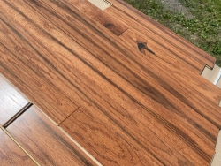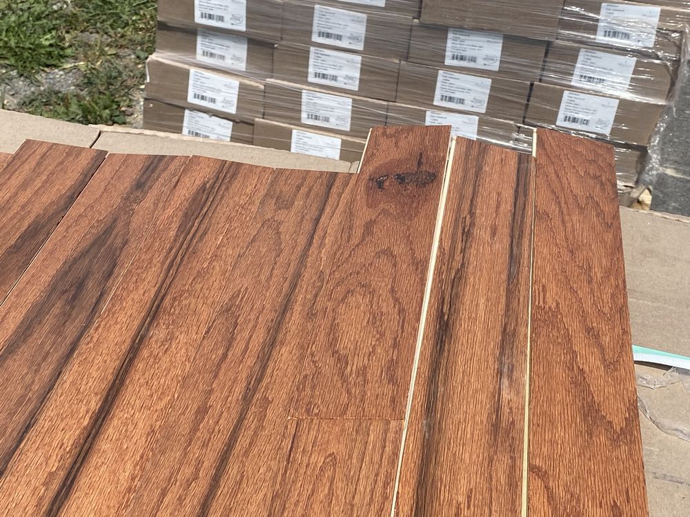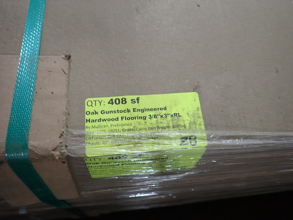 Oak Gunstock Engineered Hardwood Flooring 3/8" x 3" x RL. 16 Boxes, 25.5 SF Per Box, By: Mullican, Prefinished, Grade: Cabin. Chalk marks are from manufacturer and can be wiped off. Cabin/Utility/Tavern Grade: This flooring product will have varying wood characteristics and colors to include streaks, deeper k *Any manufacturer warranties are NOT VALID with any purchase at our Auctions unless stated otherwise.. Weight: 850. Sold by: Square Foot. Sold as: Quantity x Price.