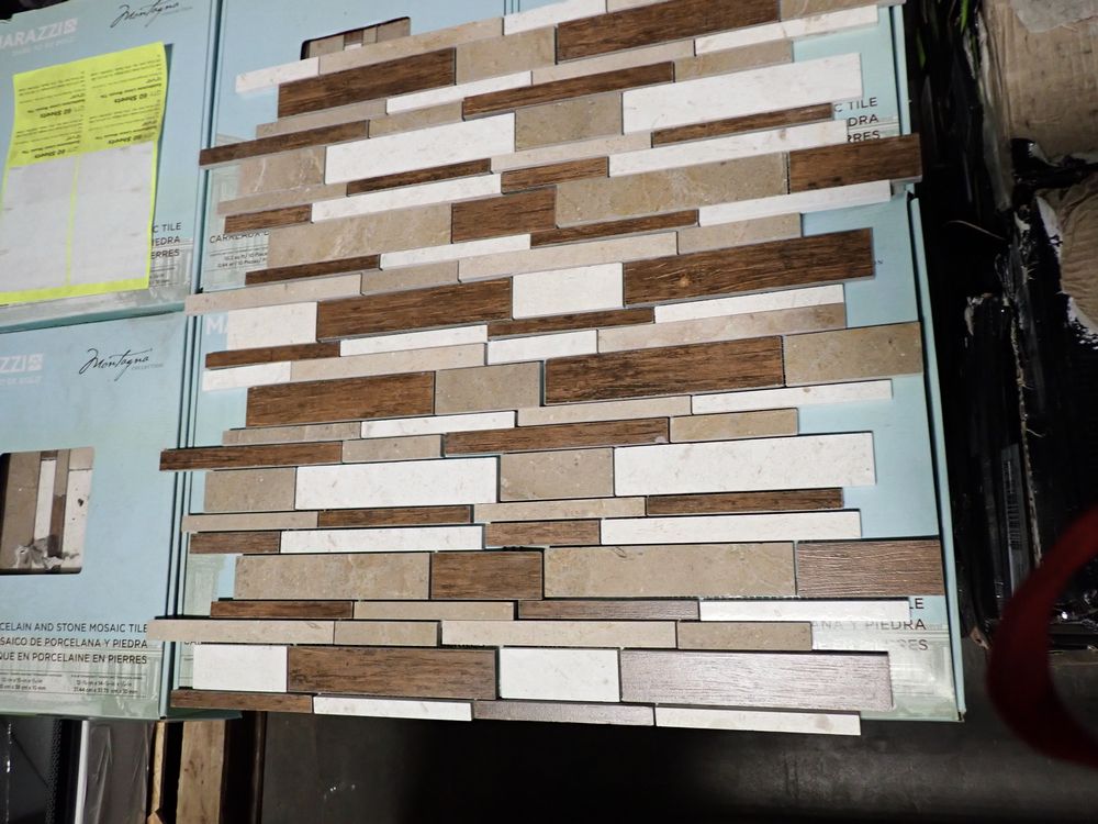 Saddlestone Linear Mosaic Tile 12" x 15". By: Marazzi, Montagna Series, Made in the USA, 10 Pieces per Box. Grade: B *Any manufacturer warranties are NOT VALID with any purchase at our Auctions unless stated otherwise.. Weight: 323. Sold by: Sheet. Sold as: Quantity x Price.