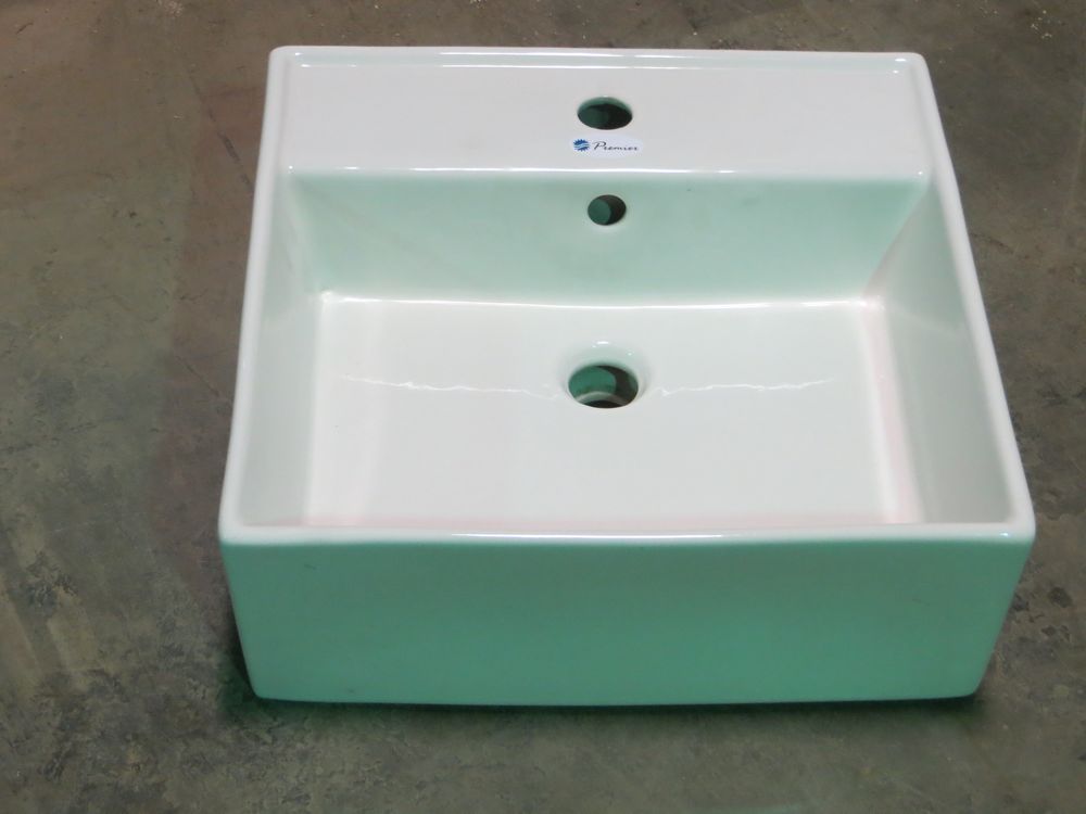 White Lavatory Vessel Sink, Quadrato. By: Premier. 3 hole, 6 1/4" x 17 1/4" x 17 3/4". Grade: A *Any manufacturer warranties are NOT VALID with any purchase at our Auctions unless stated otherwise.. Weight: 34. Sold by: Piece. Sold as: Quantity x Price.