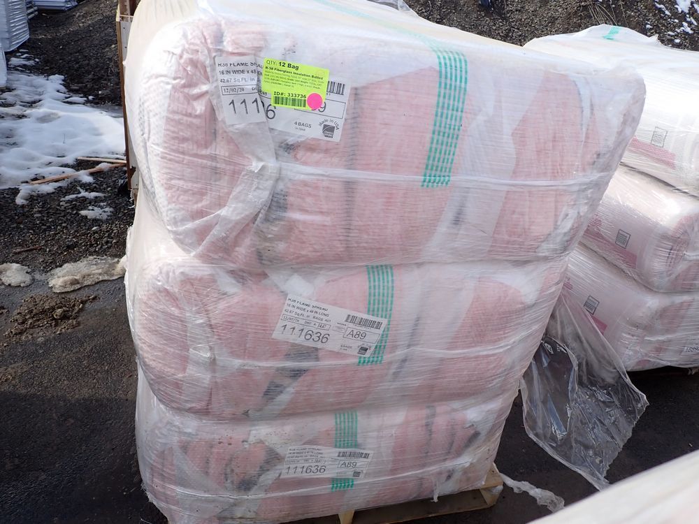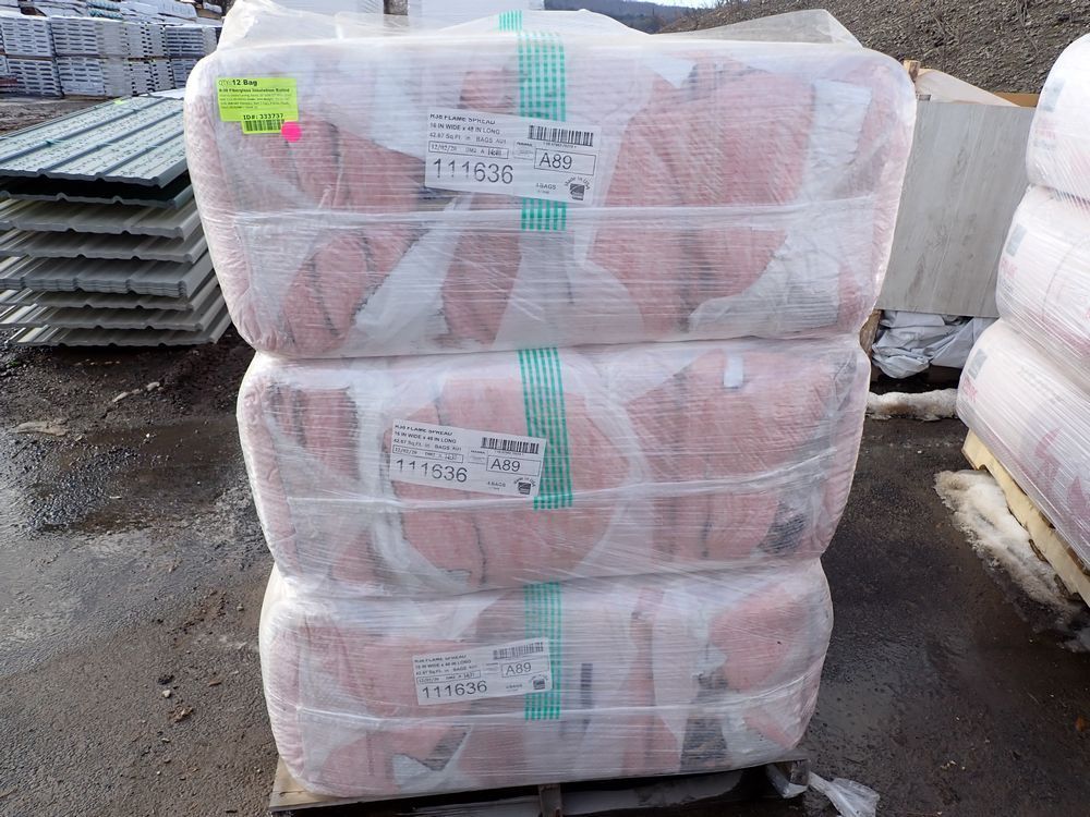 R-38 Fiberglass Insulation Batted. Made by Owens Corning, Faced, 16" wide 12" thick, Grade *Any manufacturer warranties are NOT VALID with any purchase at our Auctions unless stated otherwise.. Weight: 350 lbs.. Sold by: Bag. Sold as: Quantity x Price.