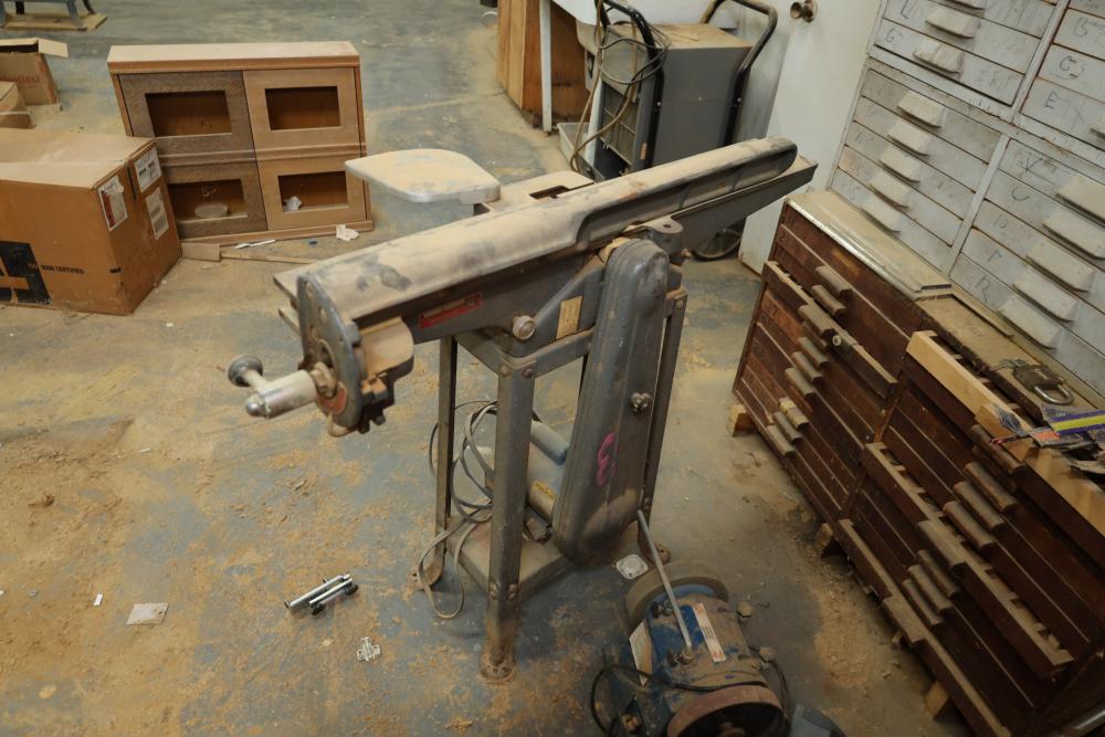 Equipment and tools including Kundig Holzher wide belt sander premium-2 1100-RK, Doucet Inc model CXprs-24 return conveyor, Ingersoll-Rand model T30 air compressor, Power roller table with Getriebebau electric motor, Mepla mat 1500 pneumatic hinge boring and inserting machine, Rockwell power tools jointer, Panto Router machine, Rockwell manufacturing jointer, Speedaire model 4YN50A 26 gallons portable air compressor, Hitachi 15" miter saw, Miller-Moorehead machinery model 310 veneer laminate slitter, Ludell machine tools five speed heavy duty drill press, and more.
