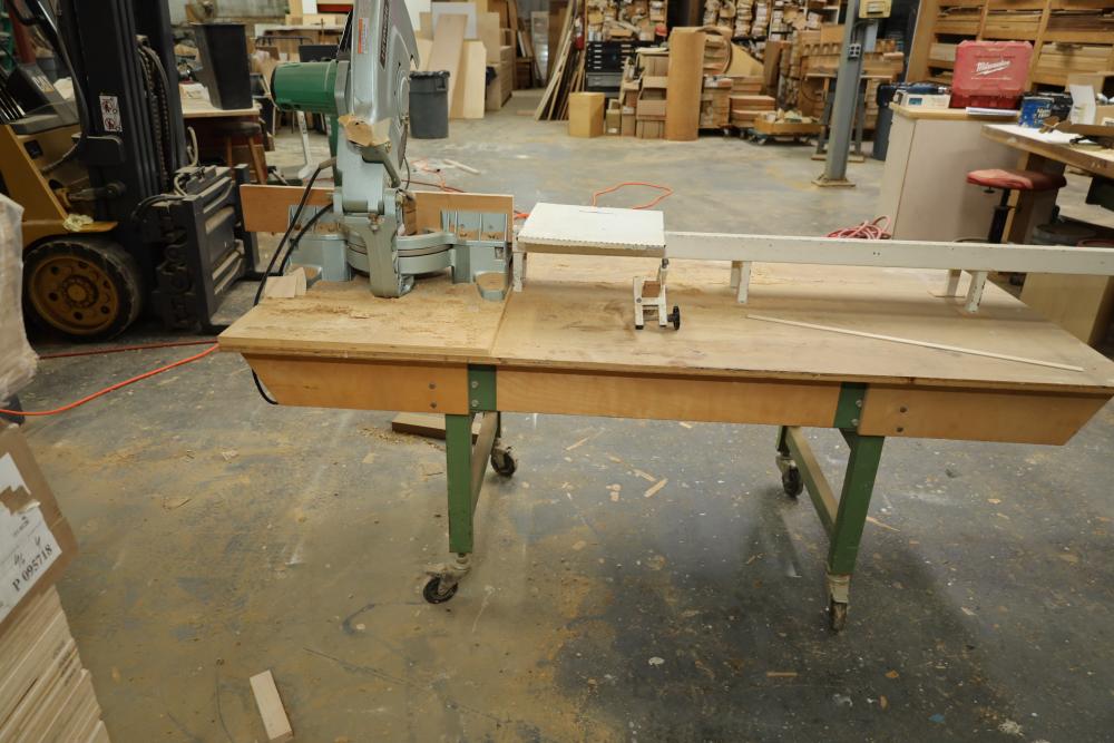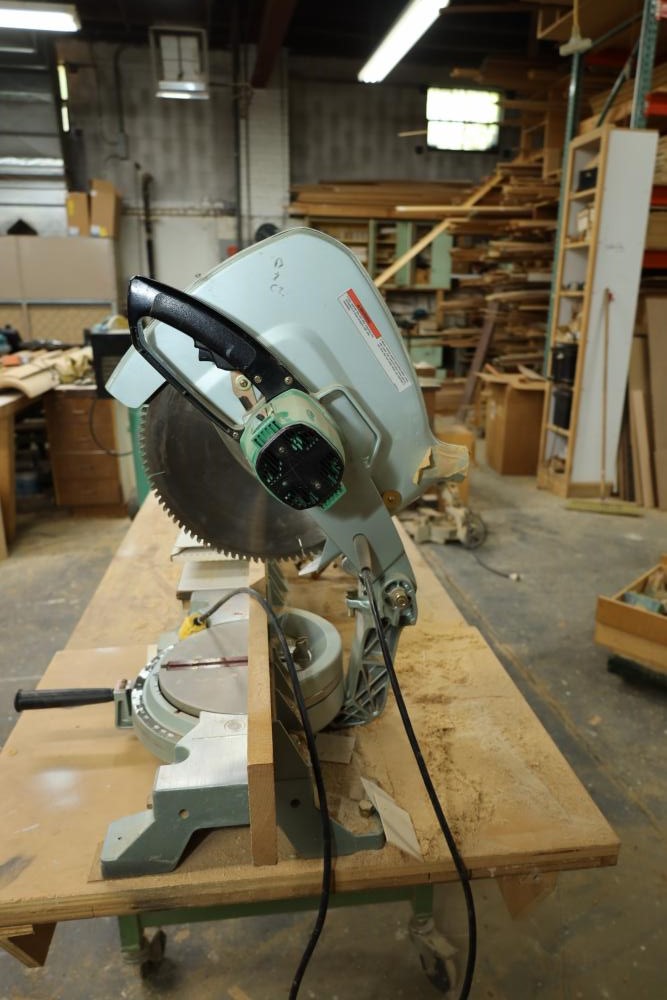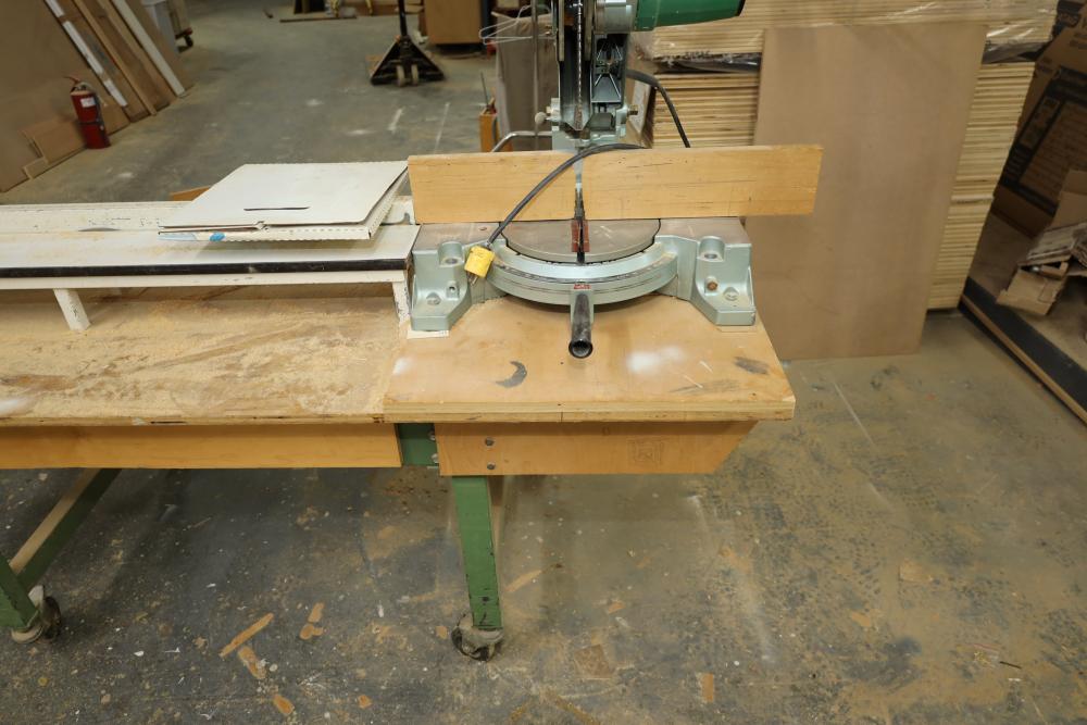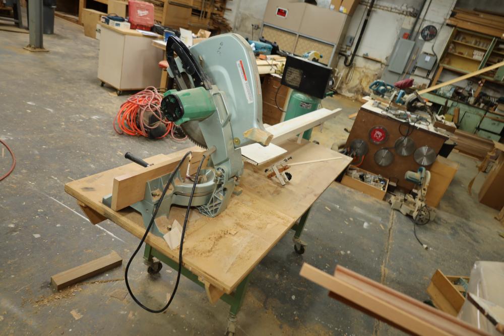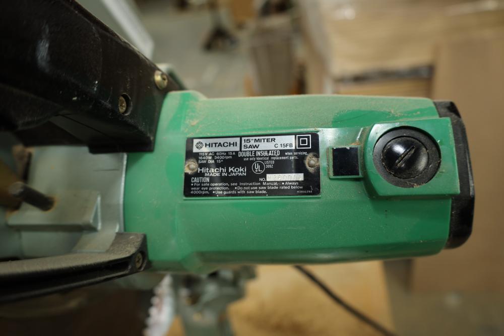 Hitachi 15 miter saw C 15FB no. H260006 with 8' table extension, spare blade, and mounted to rolling cart approx. 80 x 34 x 30 tall. Unknown if operational. Buyer must take all. Buyer is responsible for the proper and safe removal to the first disconnect including bringing all the proper tools, equipment, supplies, and help. There will NOT be any help or equipment onsite to assist in removal.