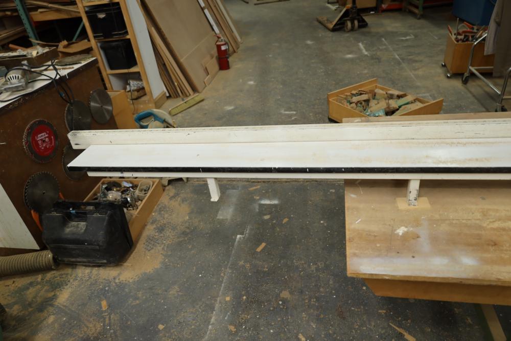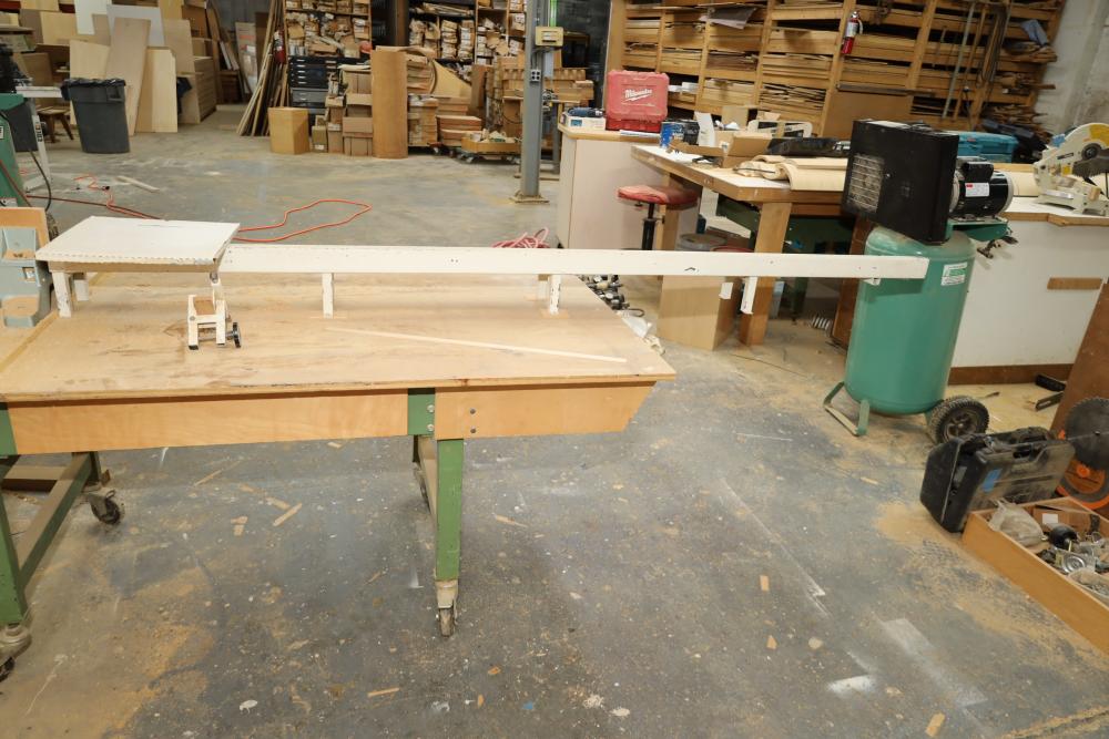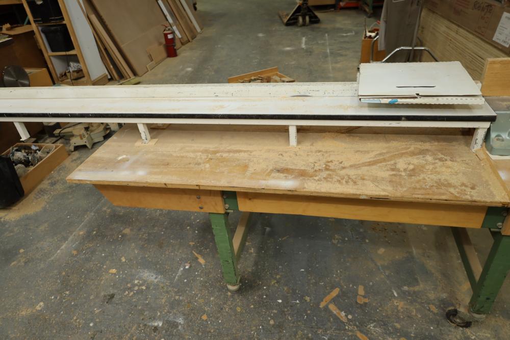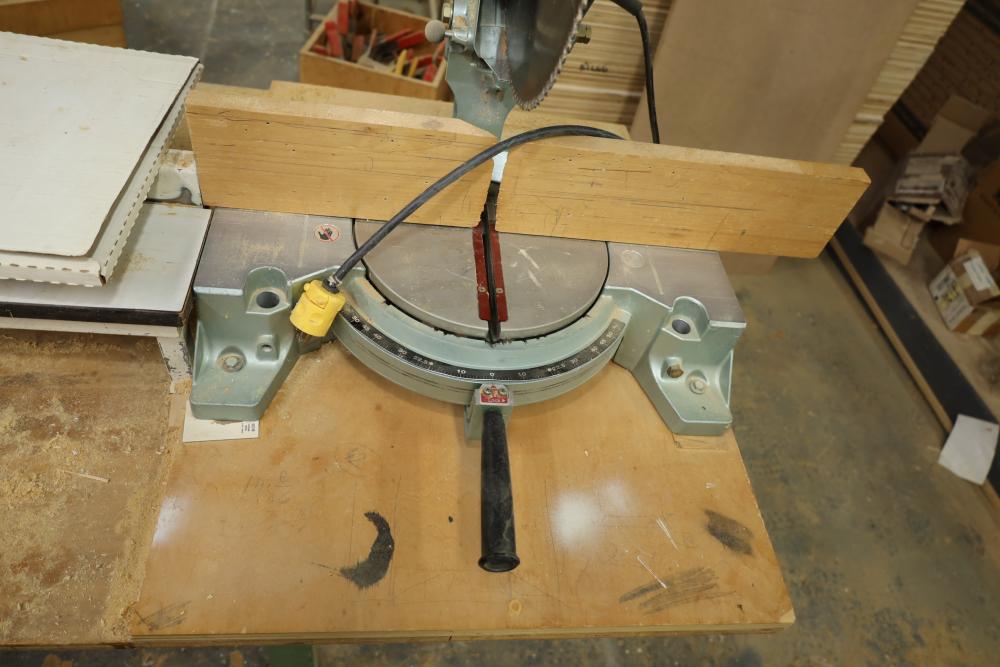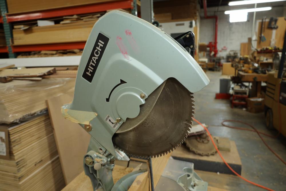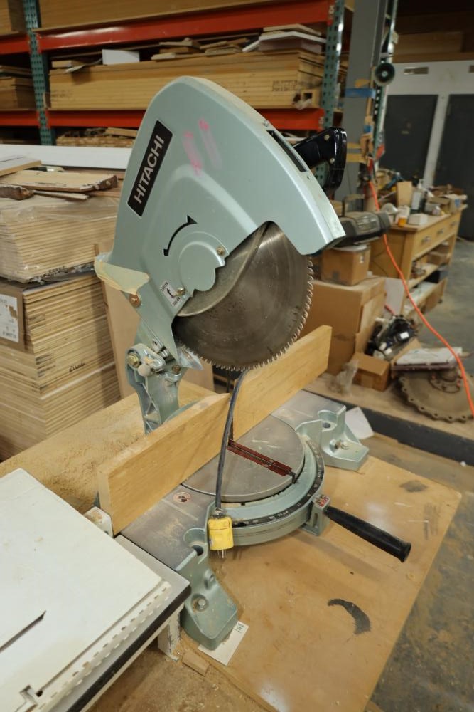 Hitachi 15 miter saw C 15FB no. H260006 with 8' table extension, spare blade, and mounted to rolling cart approx. 80 x 34 x 30 tall. Unknown if operational. Buyer must take all. Buyer is responsible for the proper and safe removal to the first disconnect including bringing all the proper tools, equipment, supplies, and help. There will NOT be any help or equipment onsite to assist in removal.