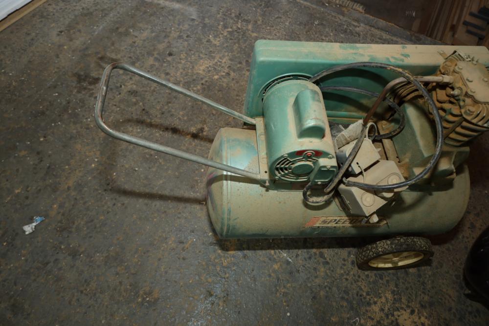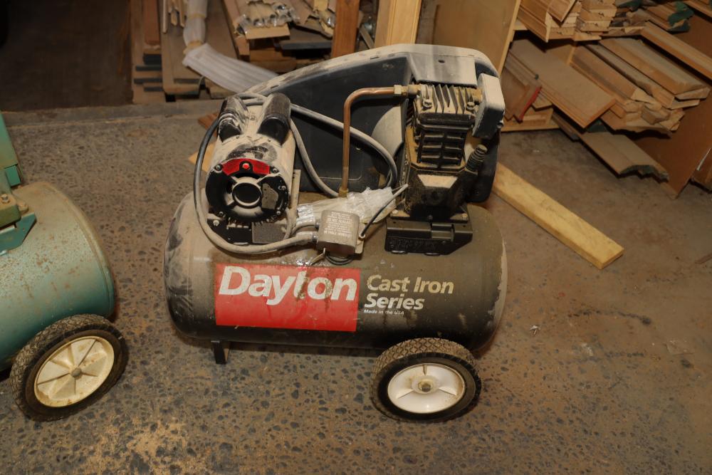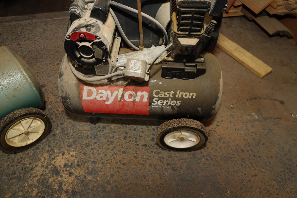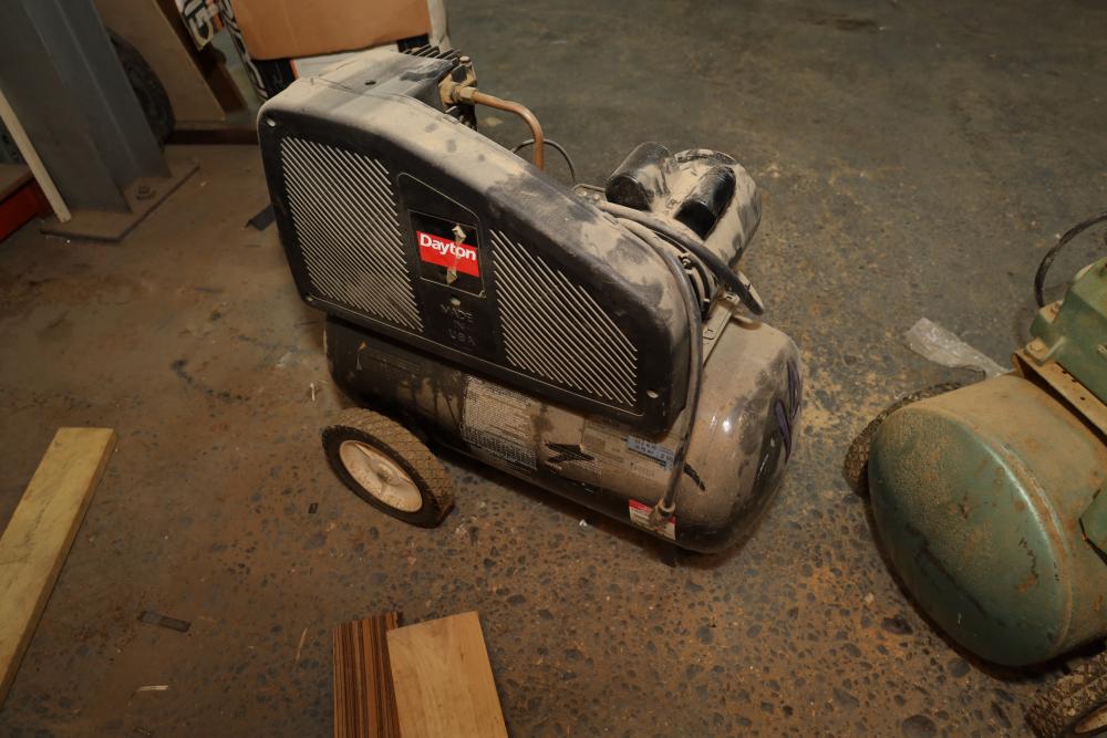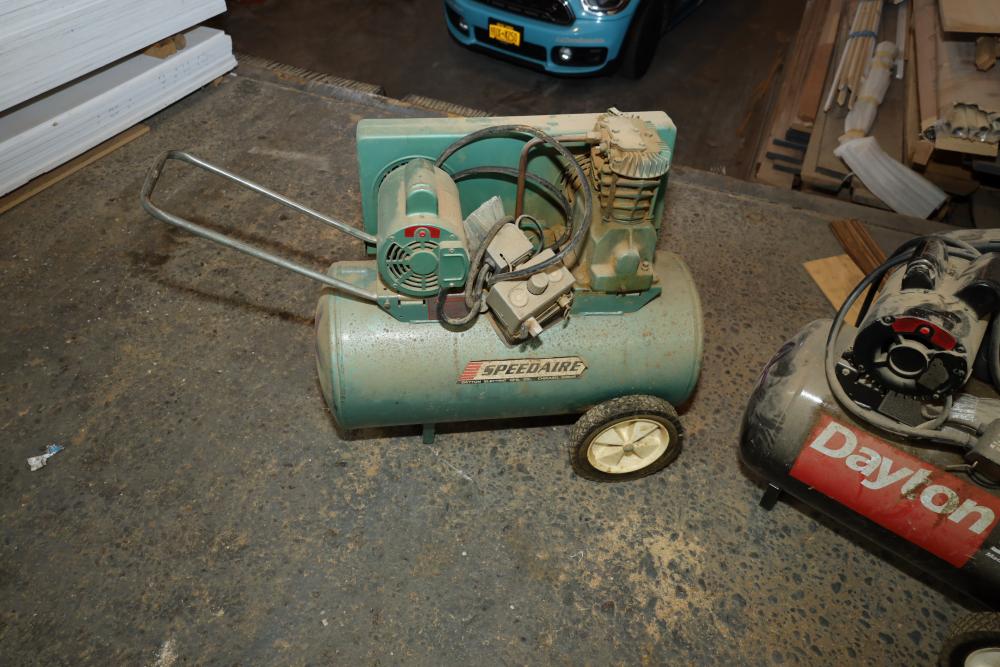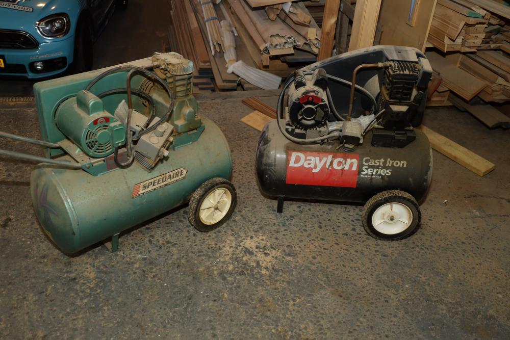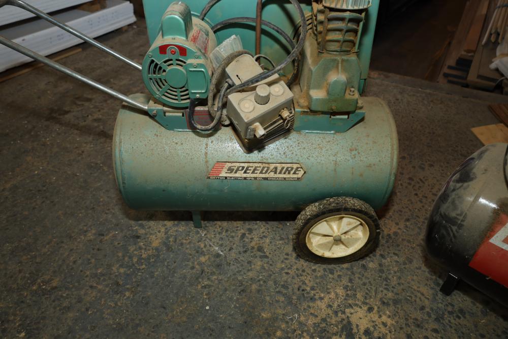 Two portable air compressors including Dayton cast iron series model 4B229 20 gallon, and Speedaire compressor approx. 20 gallons. Both unknown if operational. Buyer must take all. Buyer is responsible for the proper and safe removal to the first disconnect including bringing all the proper tools, equipment, supplies, and help. There will NOT be any help or equipment onsite to assist in removal.