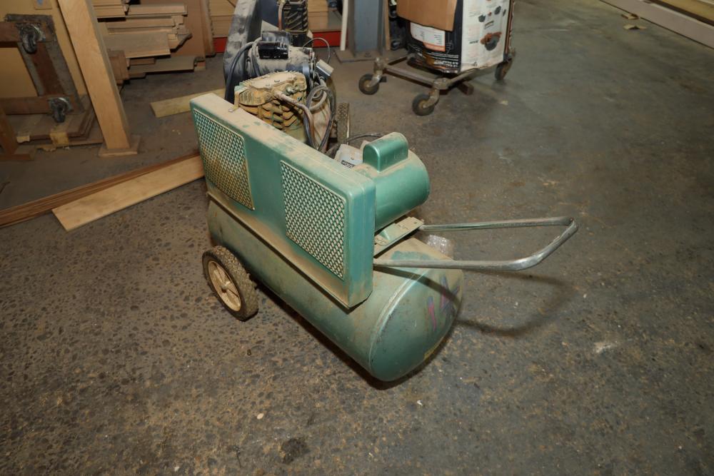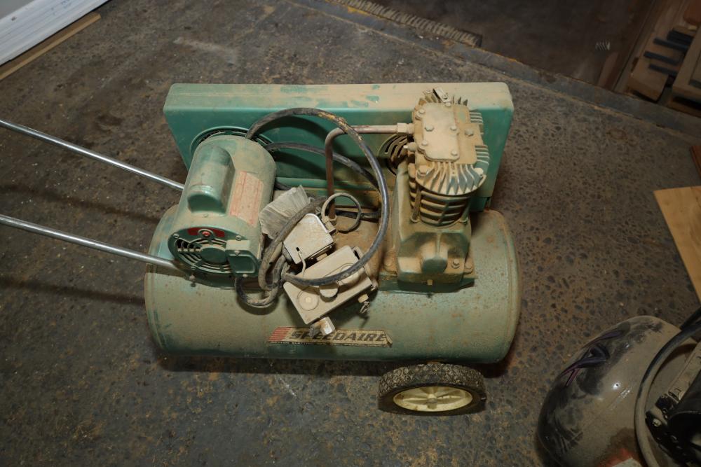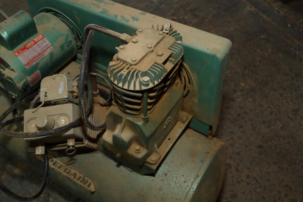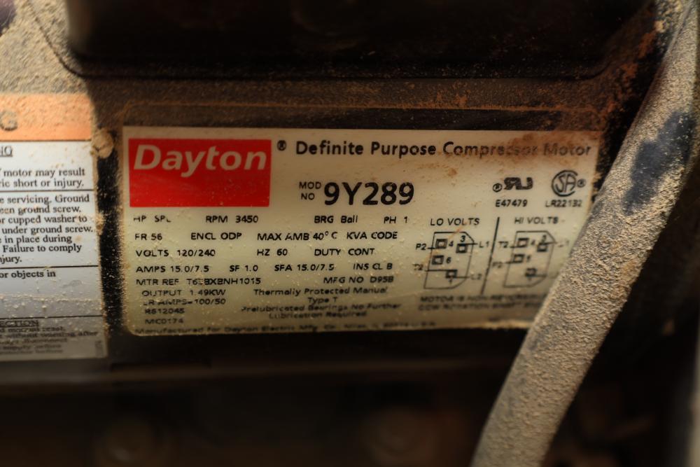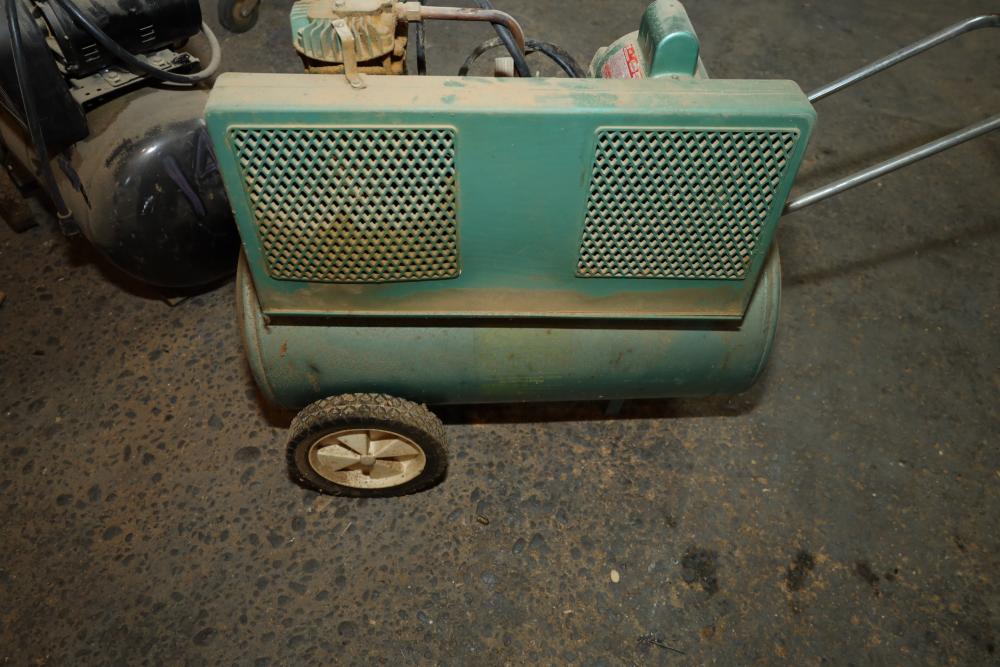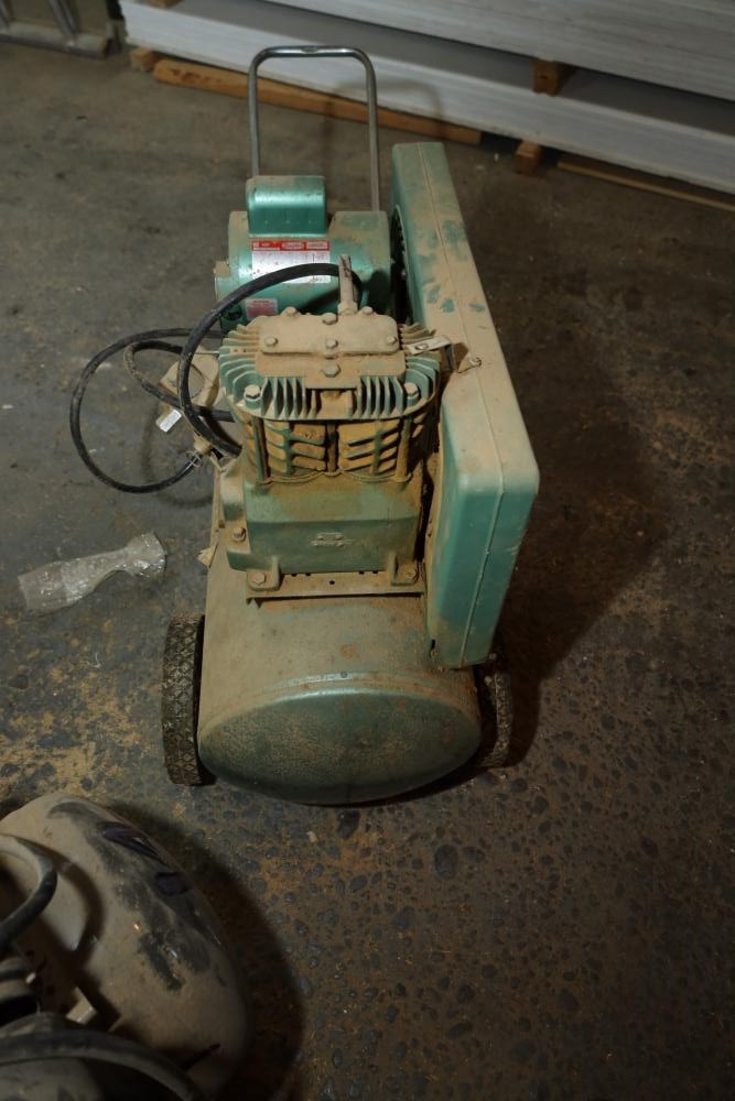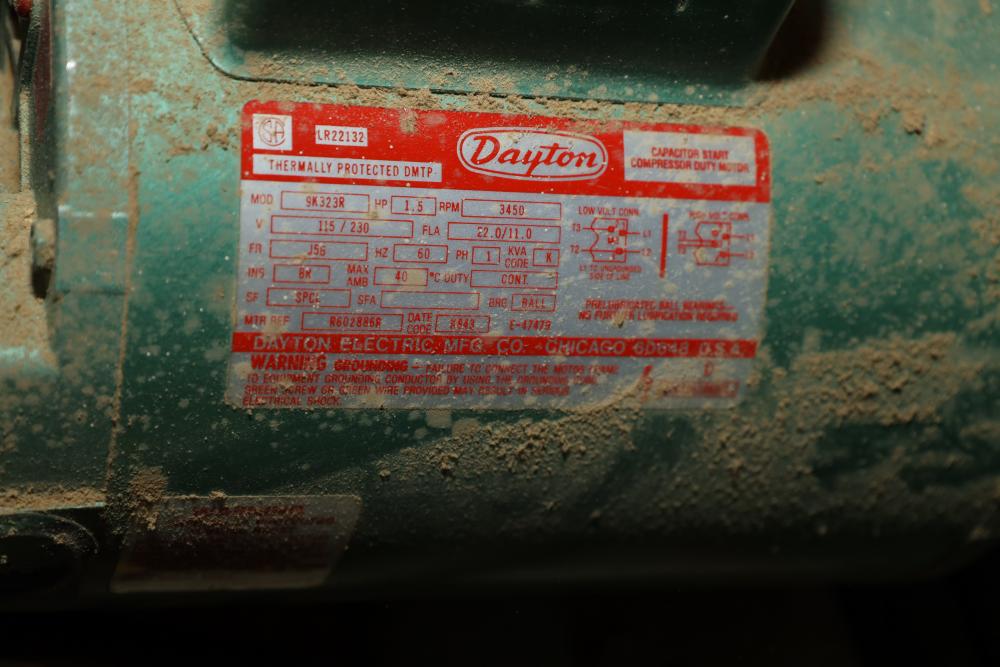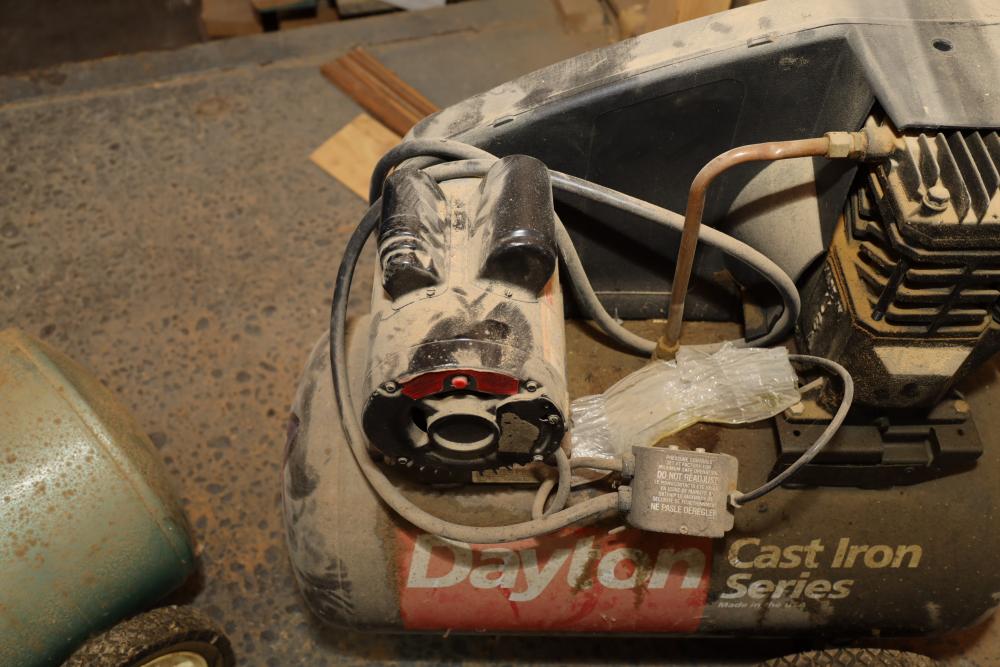 Two portable air compressors including Dayton cast iron series model 4B229 20 gallon, and Speedaire compressor approx. 20 gallons. Both unknown if operational. Buyer must take all. Buyer is responsible for the proper and safe removal to the first disconnect including bringing all the proper tools, equipment, supplies, and help. There will NOT be any help or equipment onsite to assist in removal.