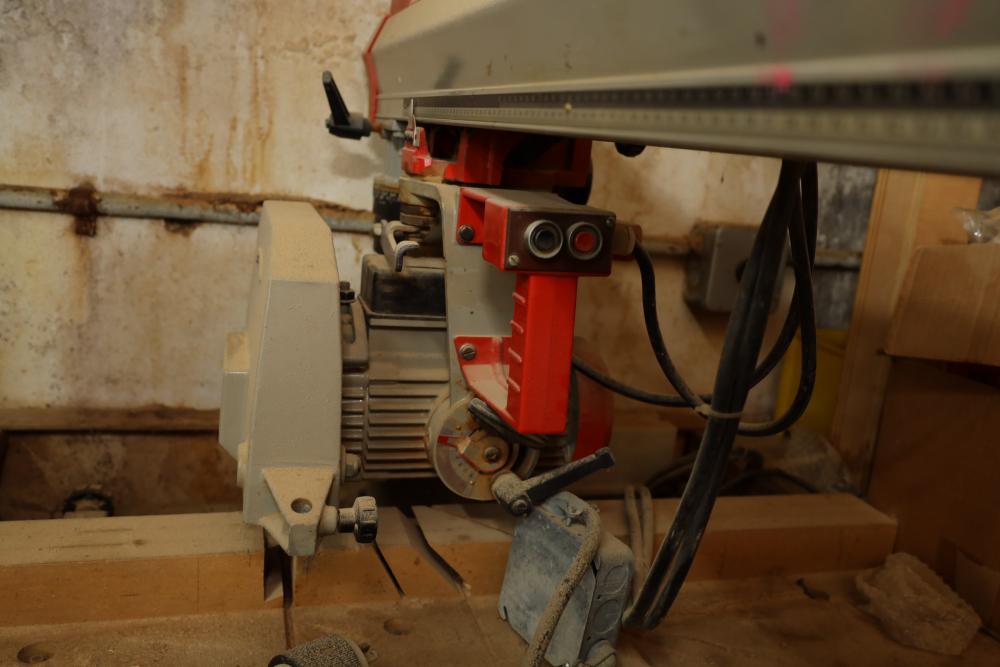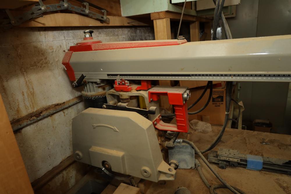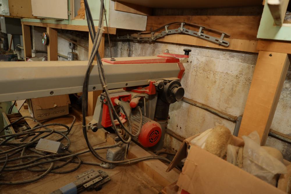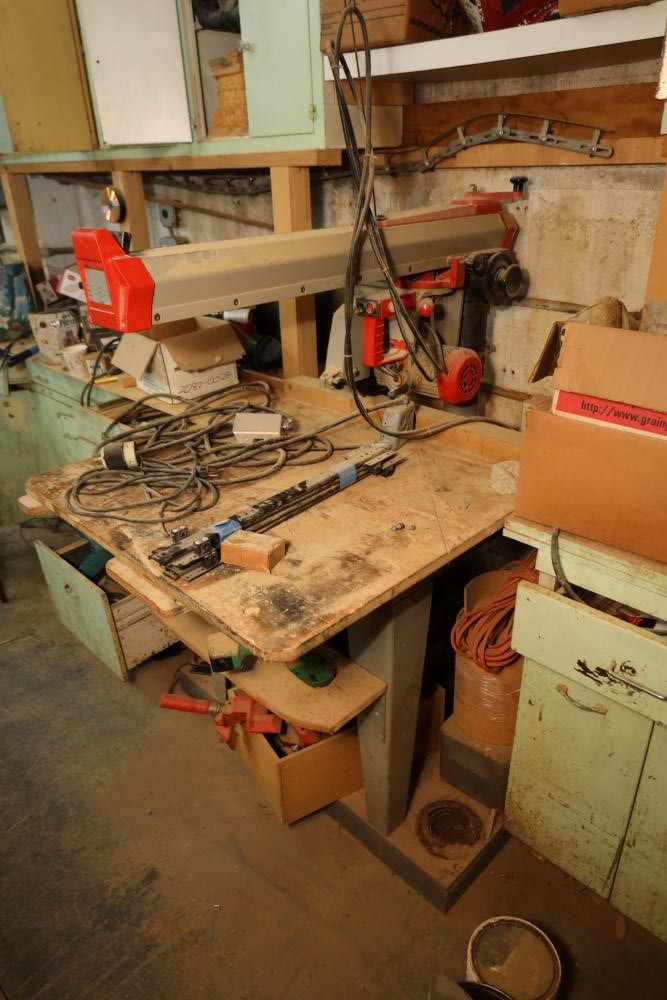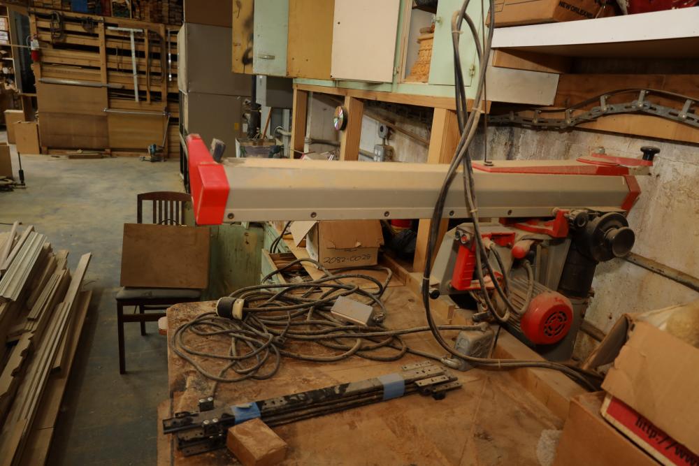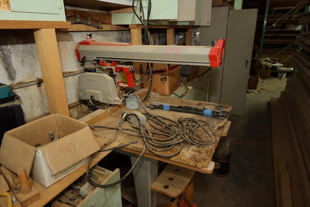 Radial arm saw with 5 HP motor, no visible model or maker. Unknown if operational. 36 x 47 x 58 tall. Buyer must take all. Buyer is responsible for the proper and safe removal to the first disconnect including bringing all the proper tools, equipment, supplies, and help. There will NOT be any help or equipment onsite to assist in removal.