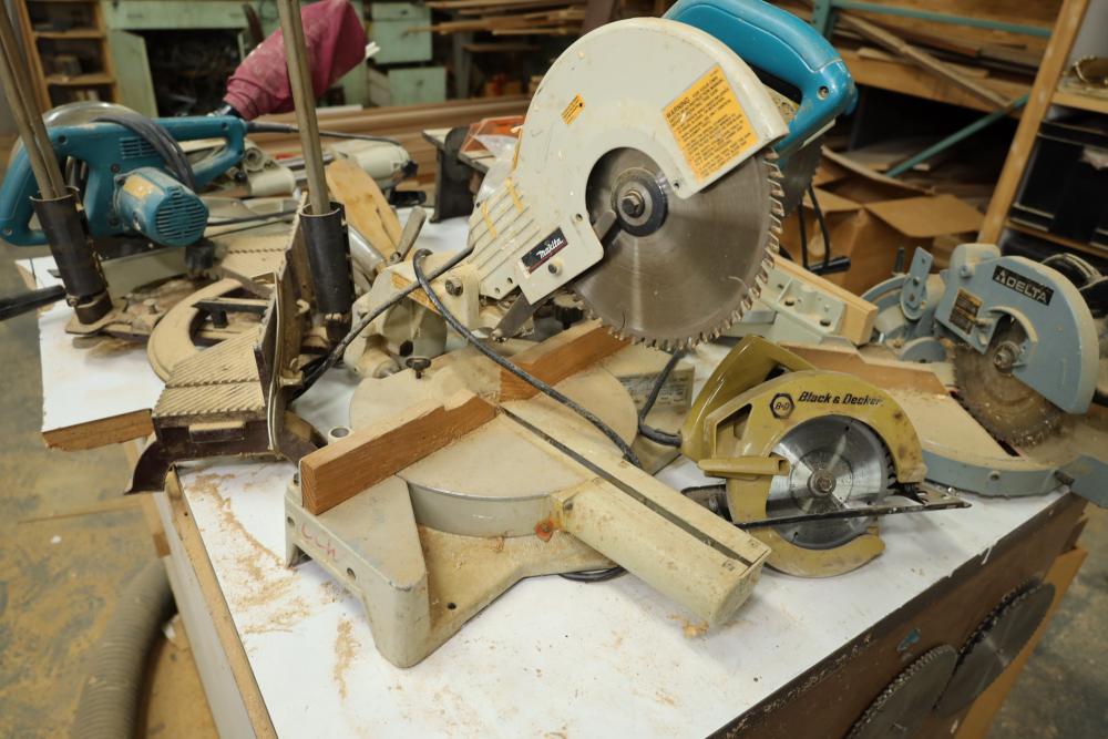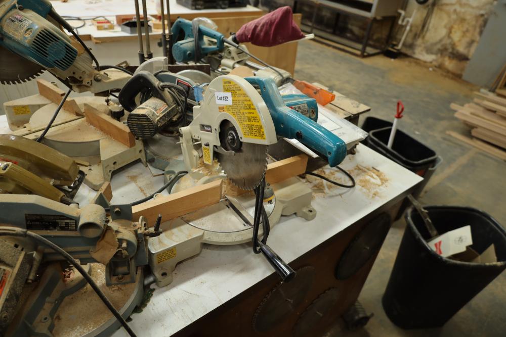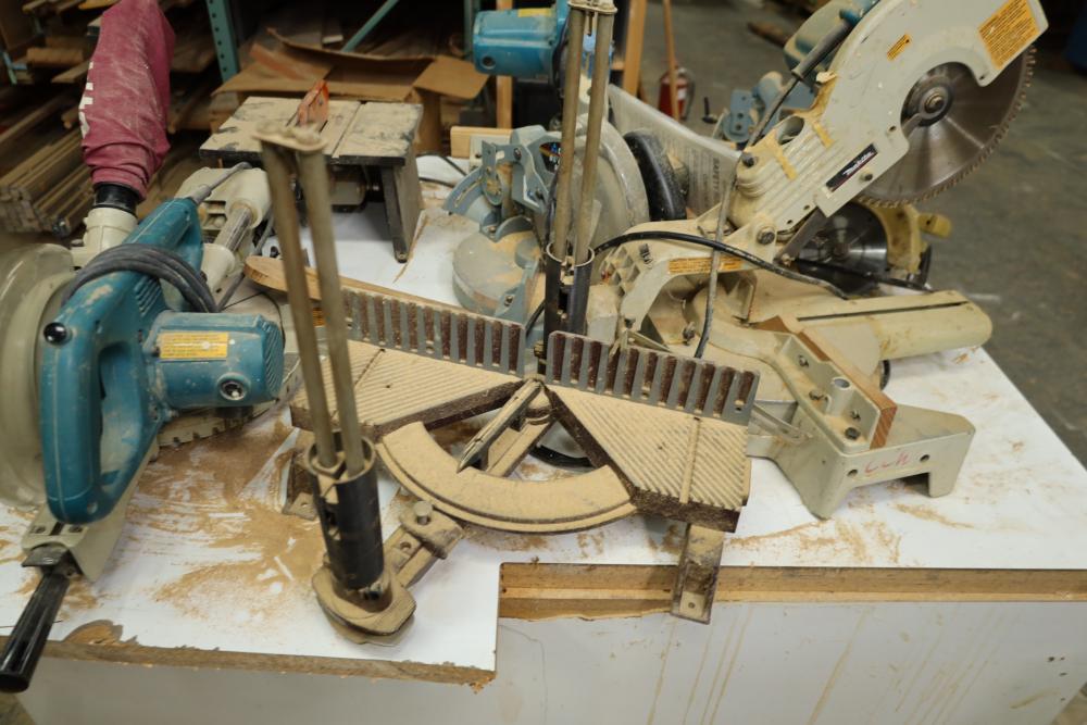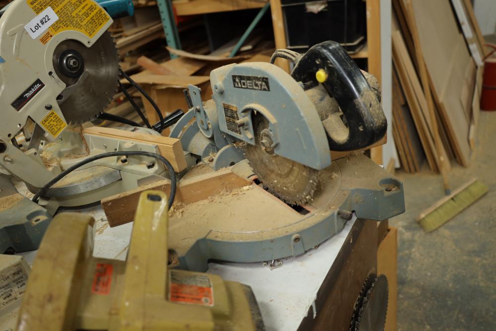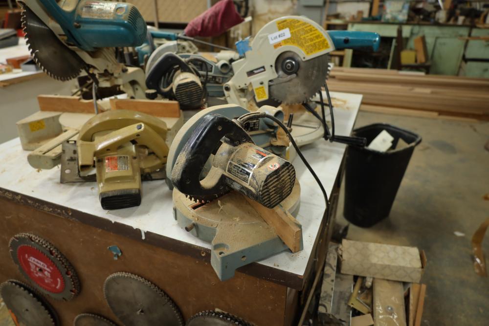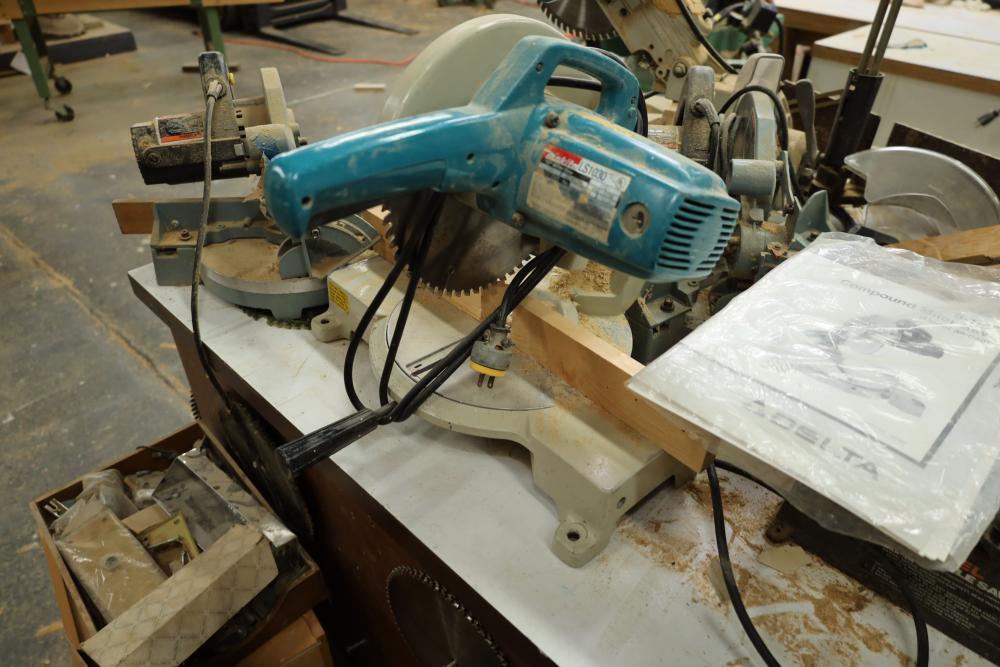 Three miter saws, two sliding miter saws, one Drexel 4 table saw, one Black and Decker circular saw, makes and models including Makita LS1011, Delta 36.040, Makita LS1030, Delta 36-040, also including assorted saw blades. All unknown if operational. Buyer must take all. Buyer is responsible for the proper and safe removal to the first disconnect including bringing all the proper tools, equipment, supplies, and help. There will NOT be any help or equipment onsite to assist in removal.