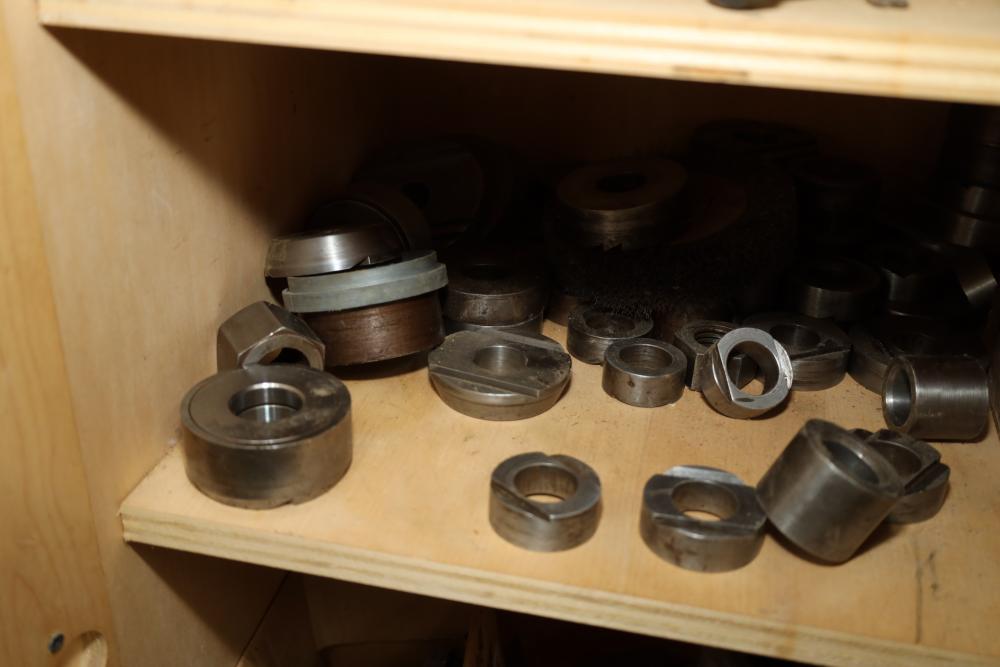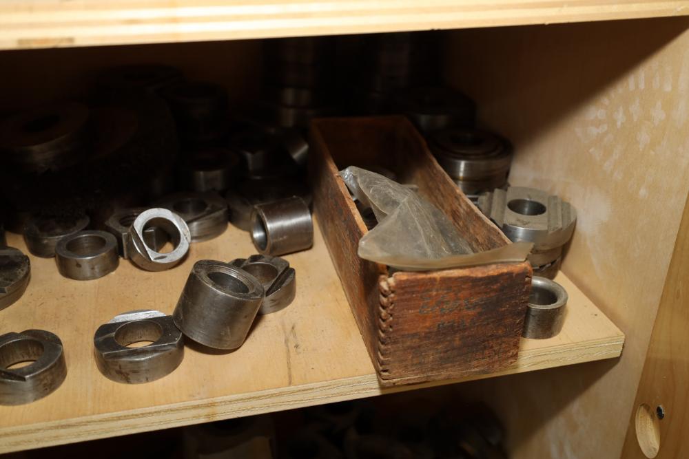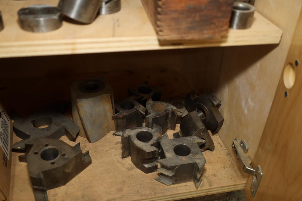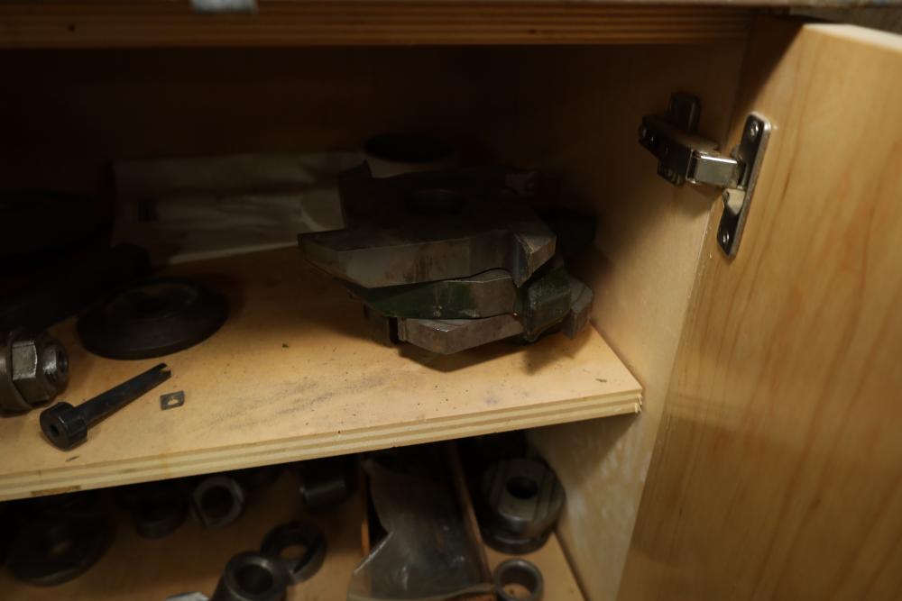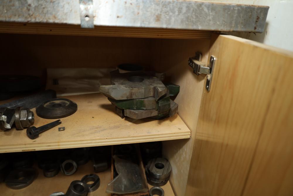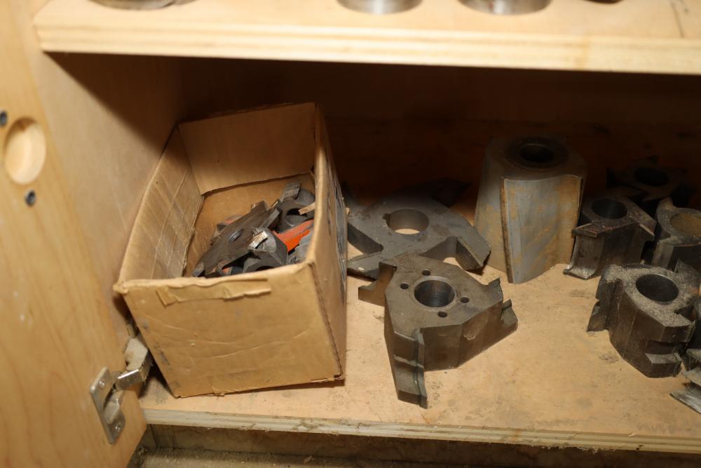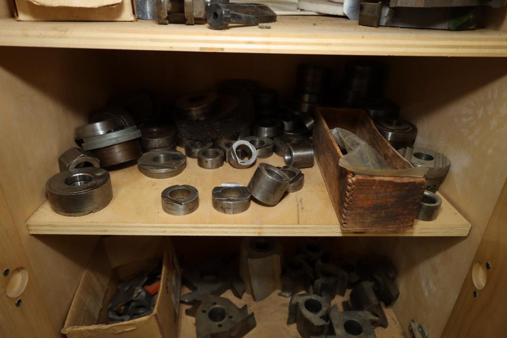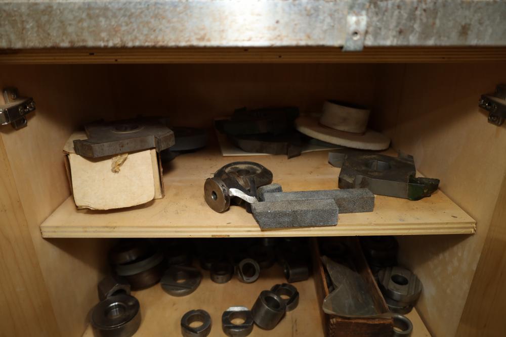 Contents of cabinet including assorted shaper cutting heads, winged cutters, wire wheel, etc. largest dia approx. 7.5. Buyer must take all. Buyer is responsible for the proper and safe removal to the first disconnect including bringing all the proper tools, equipment, supplies, and help. There will NOT be any help or equipment onsite to assist in removal.