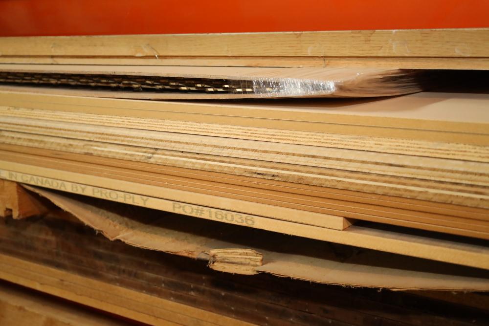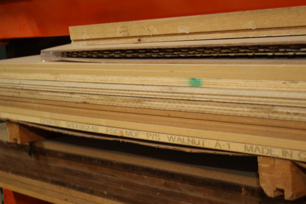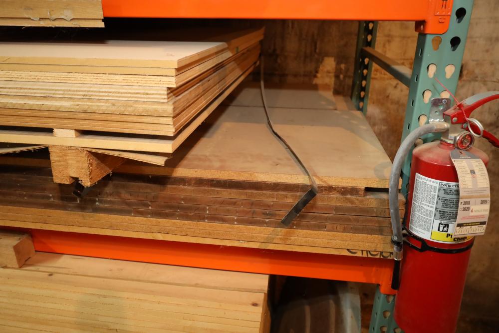 Contents of pallet shelf including the items leaning on front of it including plywood, MDF largest piece 4'x10', thickest pieces measure 1 to thinnest 1/8. Buyer must take all. Buyer is responsible for the proper and safe removal to the first disconnect including bringing all the proper tools, equipment, supplies, and help. There will NOT be any help or equipment onsite to assist in removal.