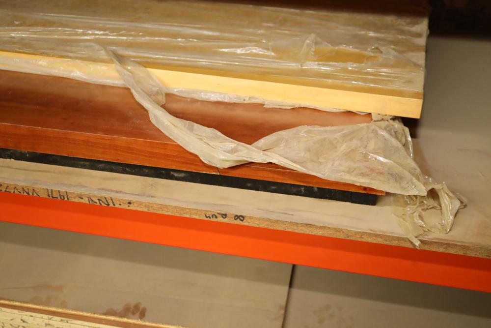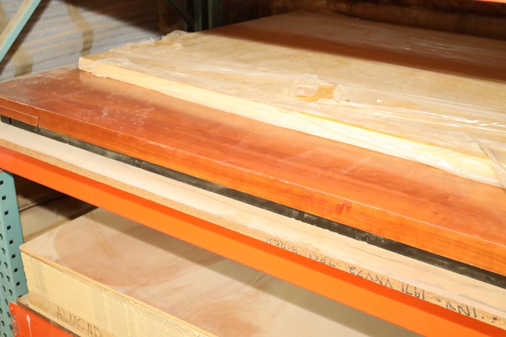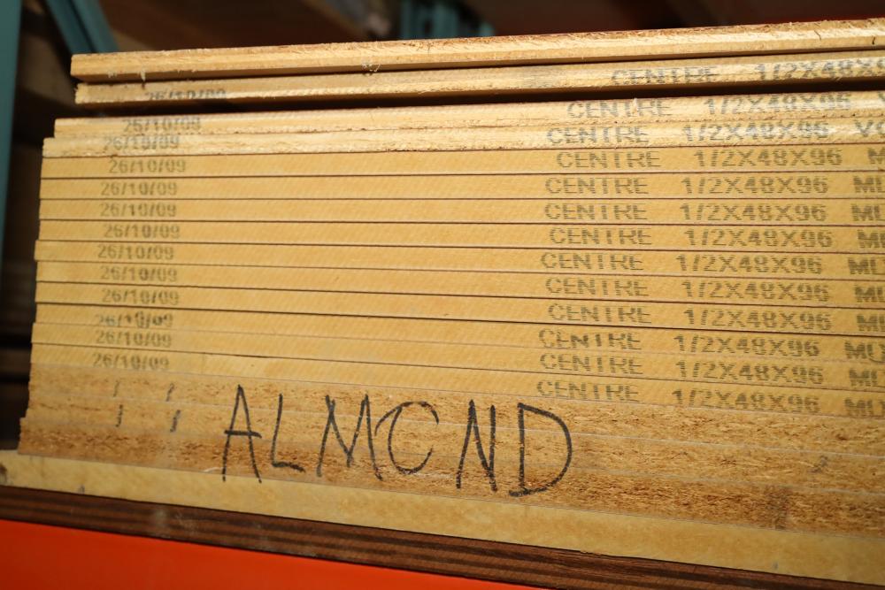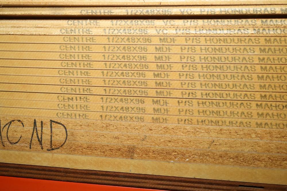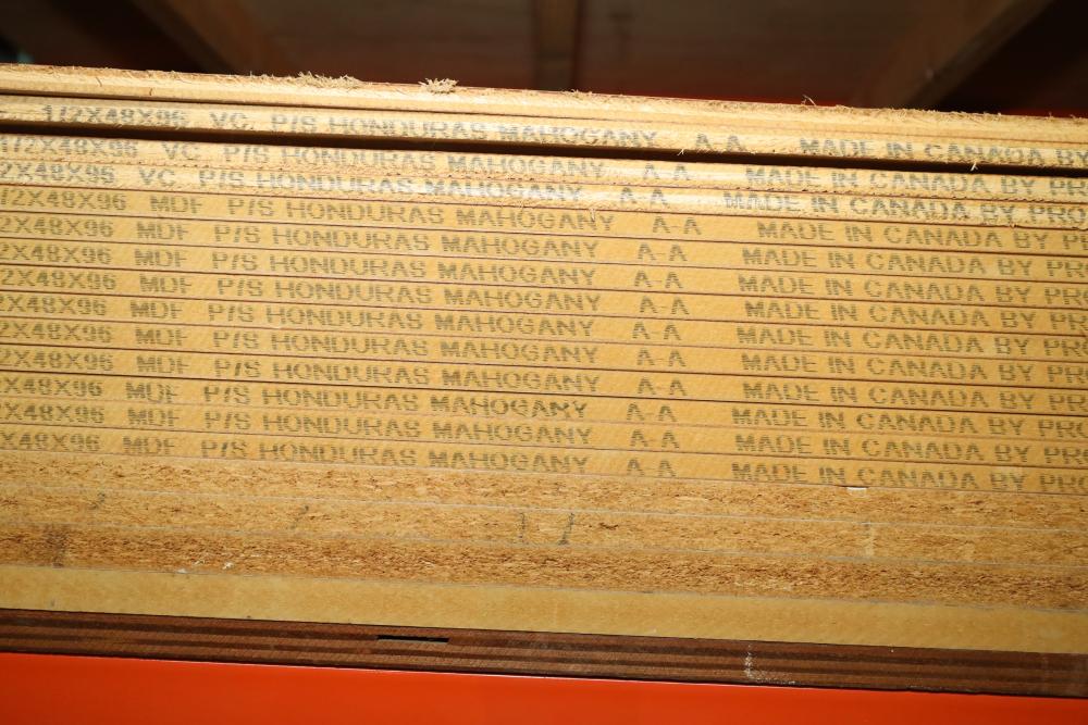 Contents of two pallet shelves including 4'x8'x1/2 MDF P/S Honduras mahogany, particle board, etc. Buyer must take all. Buyer is responsible for the proper and safe removal to the first disconnect including bringing all the proper tools, equipment, supplies, and help. There will NOT be any help or equipment onsite to assist in removal.