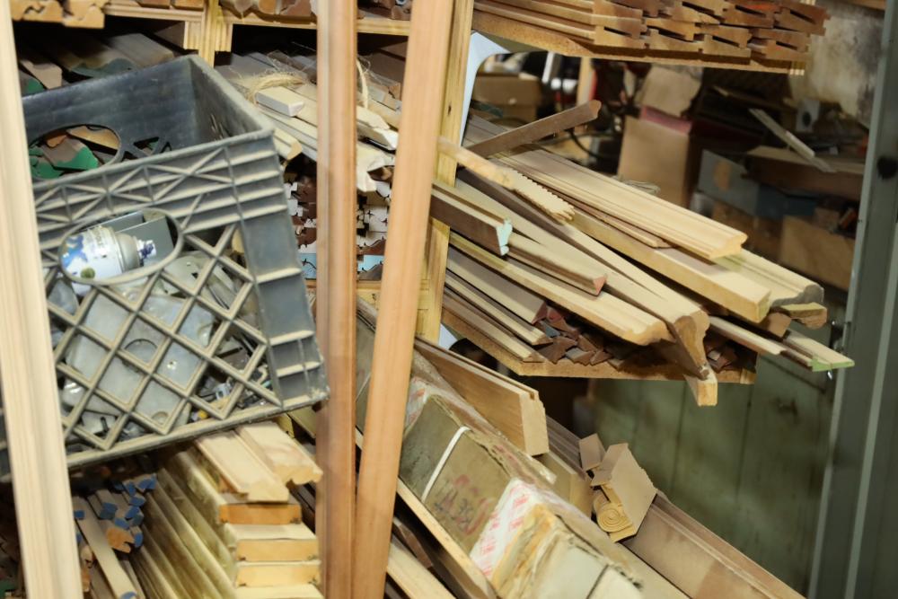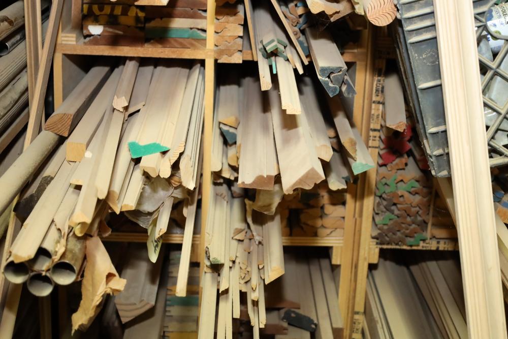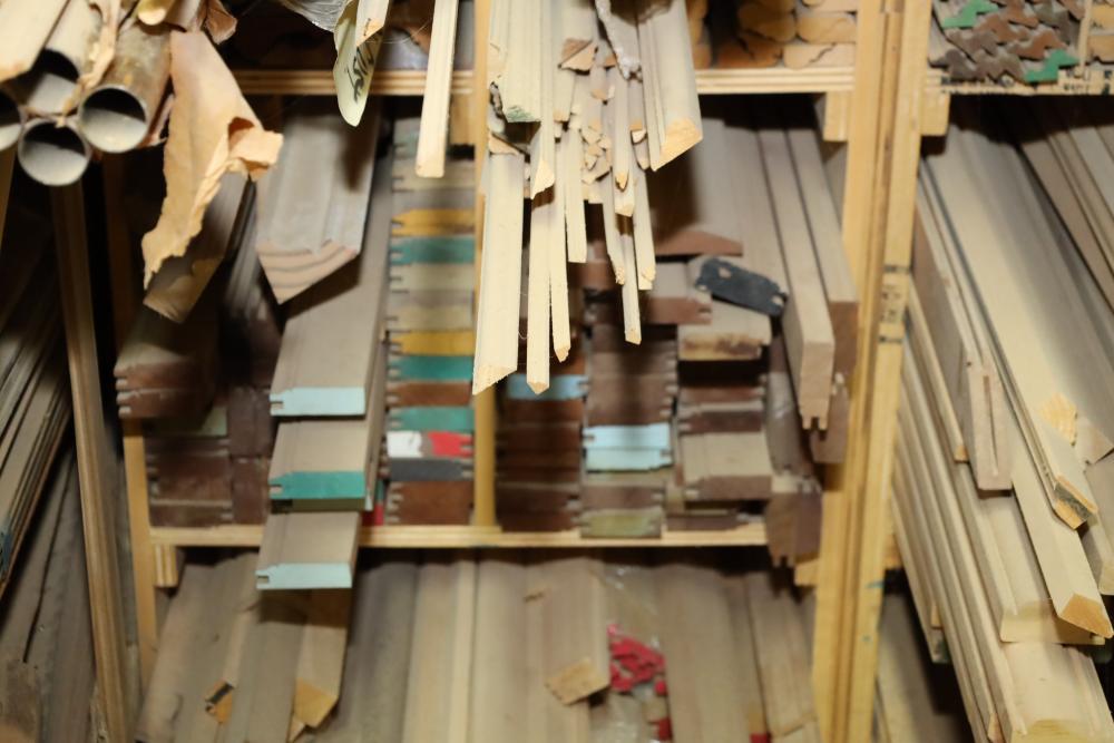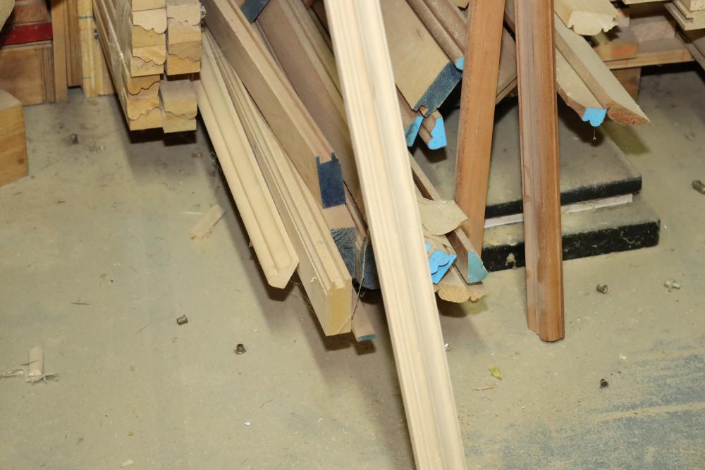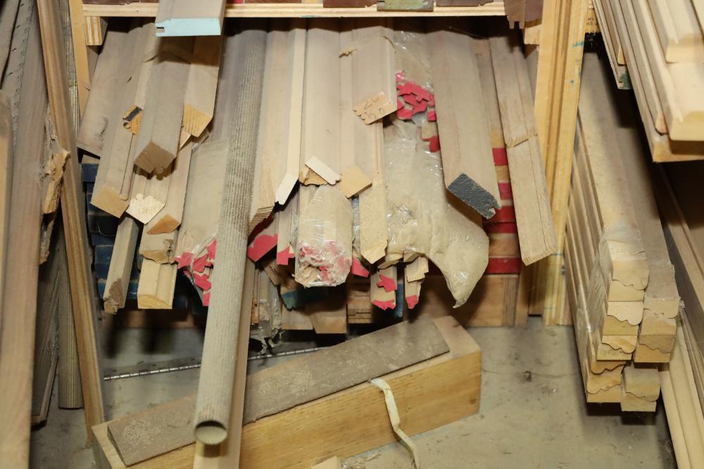 Remaining contents of molding shelving including trim, molding, decorative pieces, etc. Longest piece is approx. 14' long. Buyer may take as much or as little as they choose. Buyer is responsible for the proper and safe removal to the first disconnect including bringing all the proper tools, equipment, supplies, and help. There will NOT be any help or equipment onsite to assist in removal.