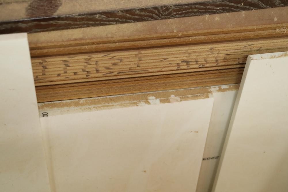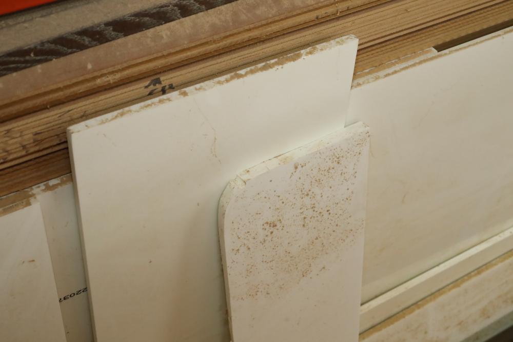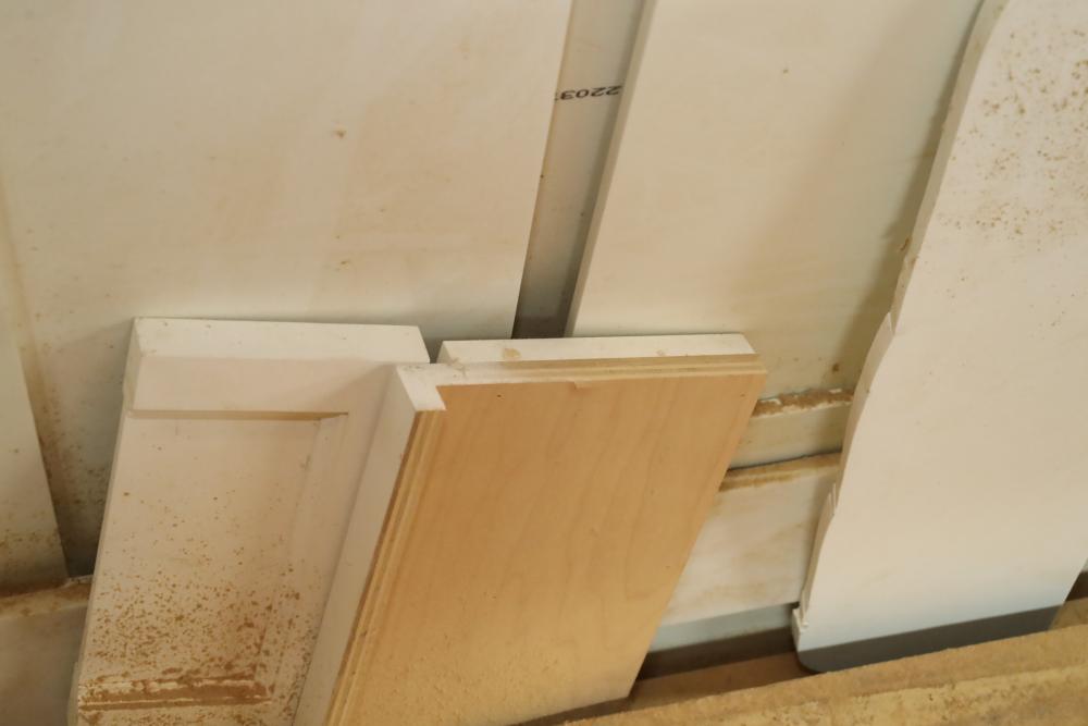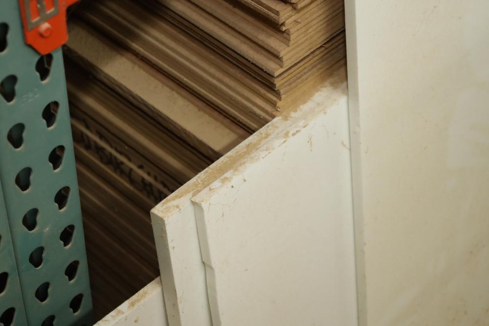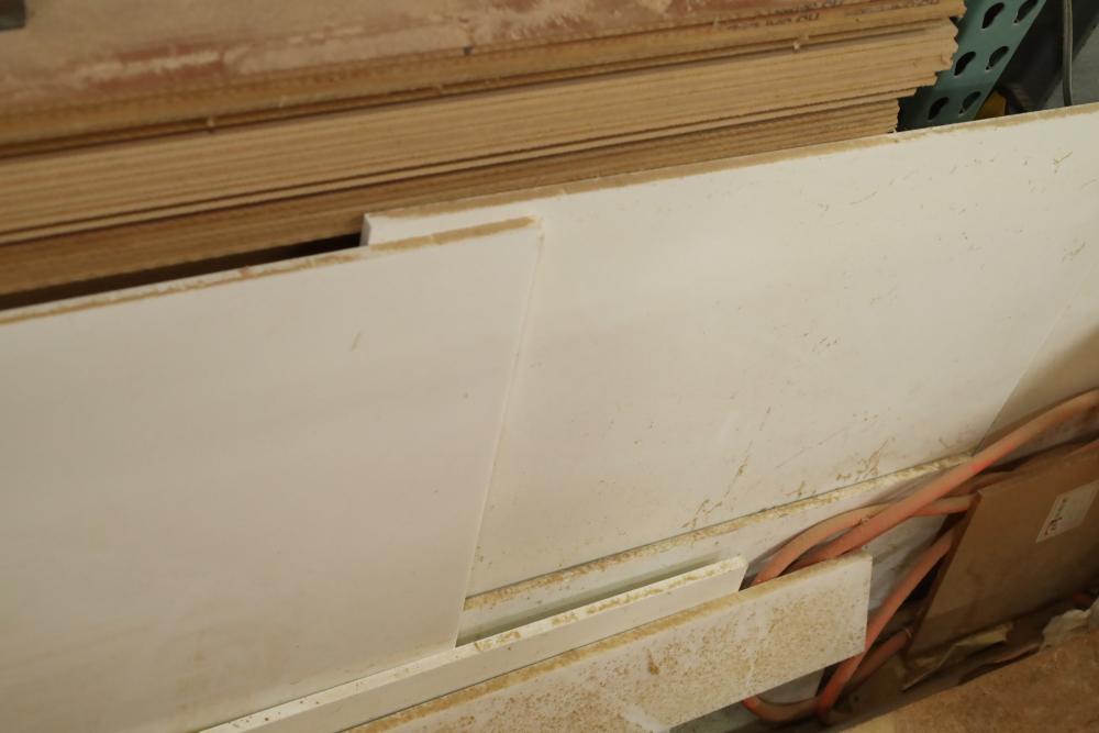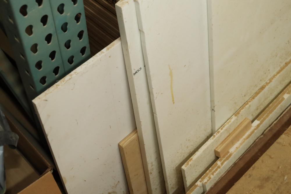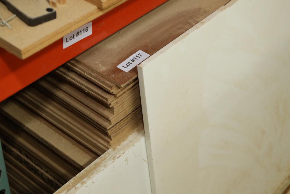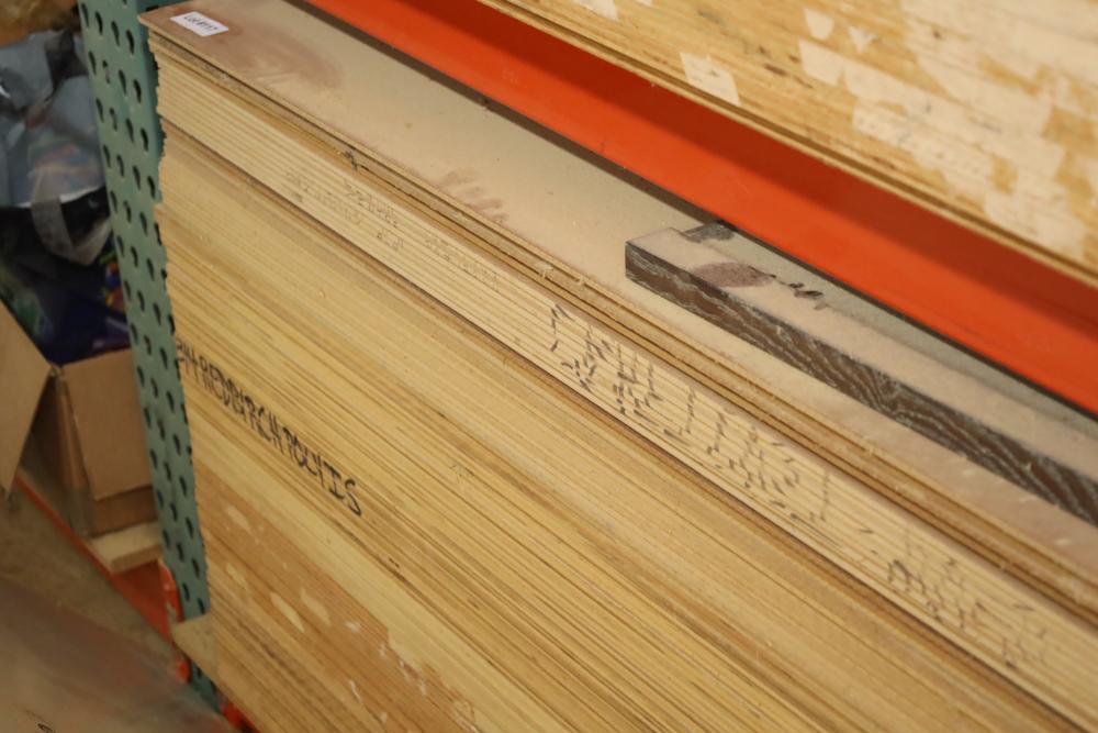 Contents of bottom pallet shelf including and items leaning against it including, DuPont Corian solid surface products stock, MDF and plywood ranging from 1/4 to 3/4. Approx. Pieces of plywood, approx. 32 pieces of MDF. Buyer must take all. Buyer is responsible for the proper and safe removal to the first disconnect including bringing all the proper tools, equipment, supplies, and help. There will NOT be any help or equipment onsite to assist in removal.