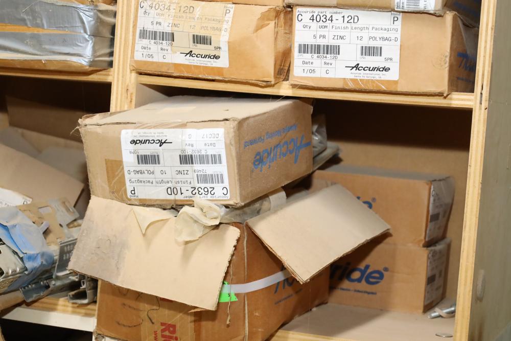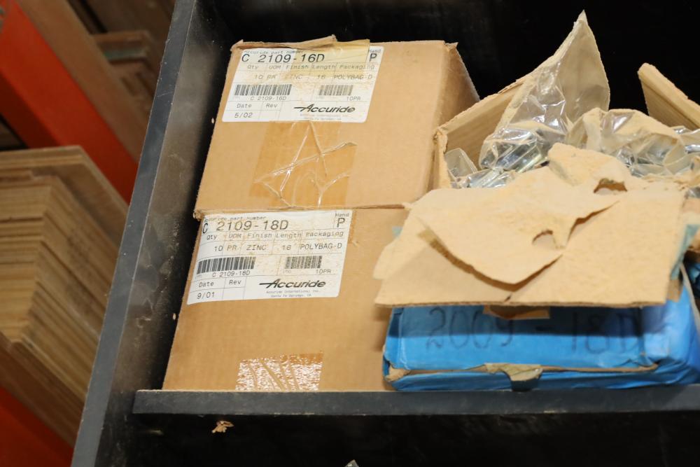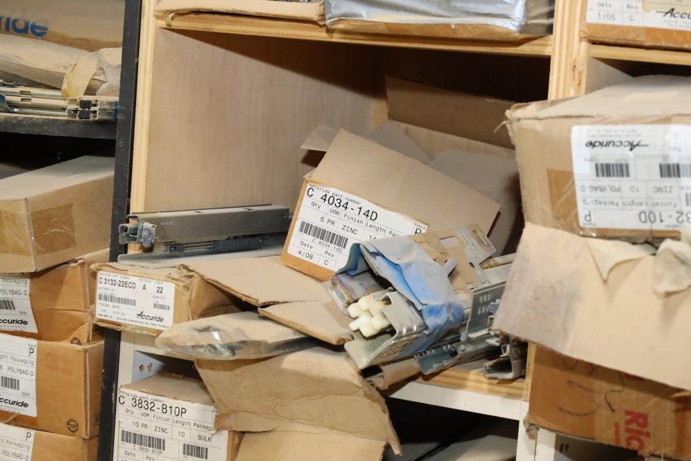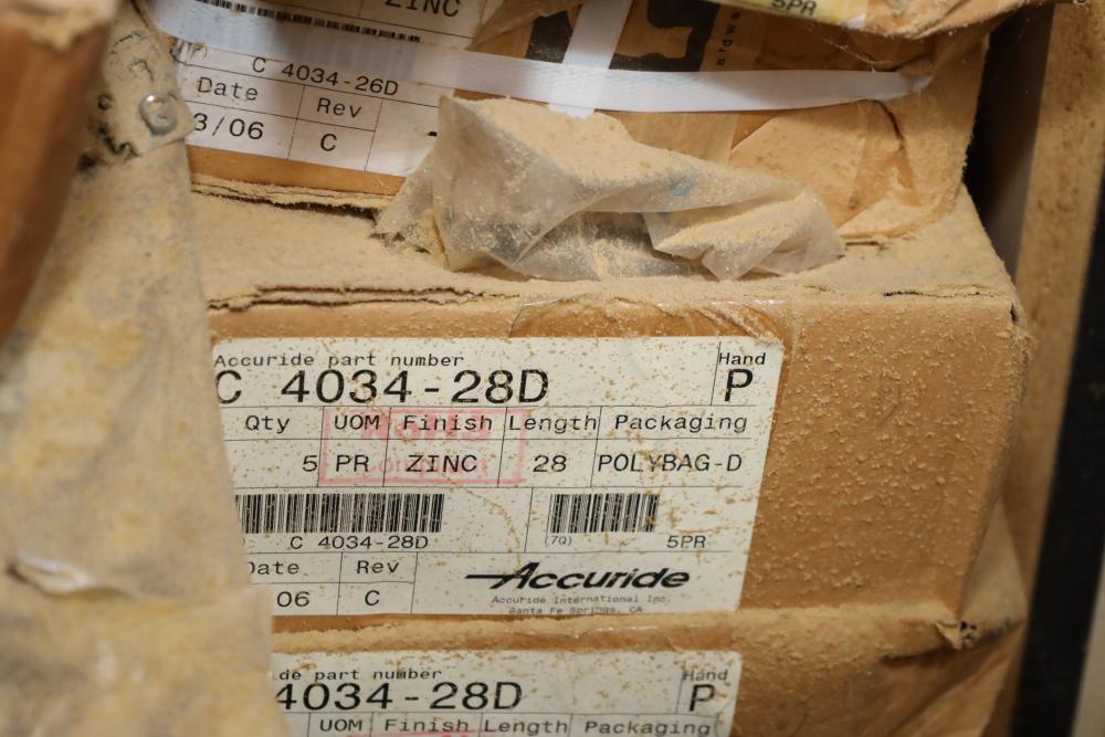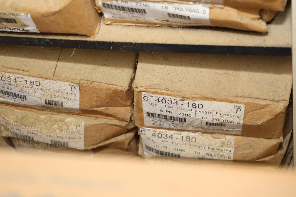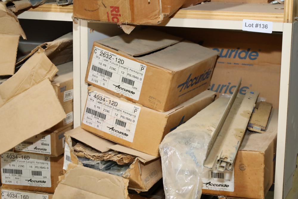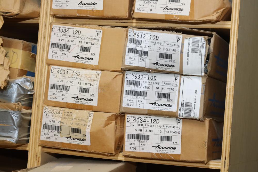 Large quantity of cabinetry hardware including accuride drawer slides part numbers include c3832-b20p, c7434-18d, 4034-18D, C3132-20ECD, etc. Buyer must take all. Buyer is responsible for the proper and safe removal to the first disconnect including bringing all the proper tools, equipment, supplies, and help. There will NOT be any help or equipment onsite to assist in removal.
