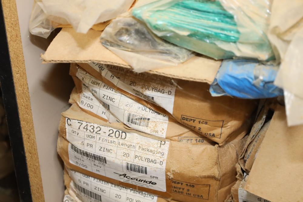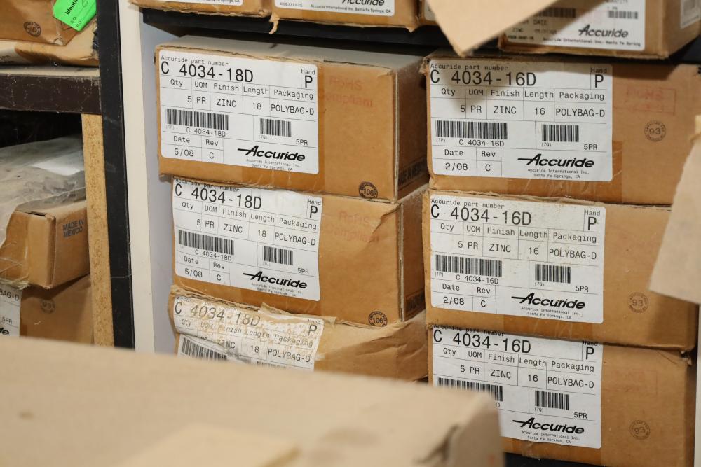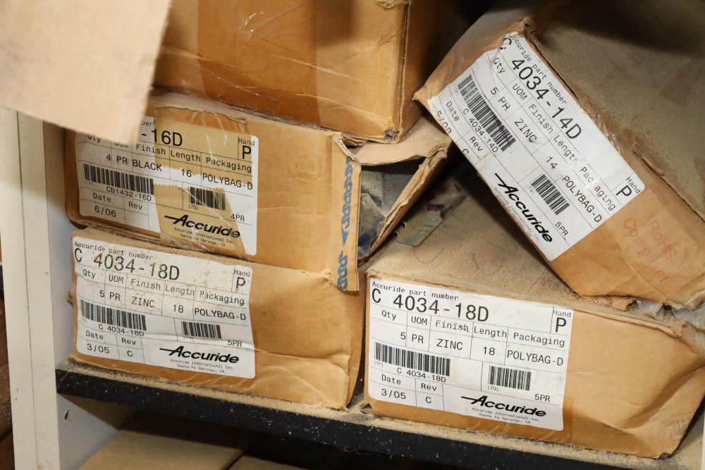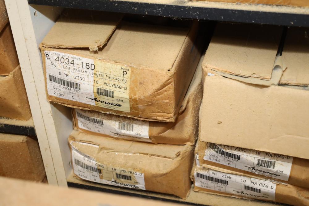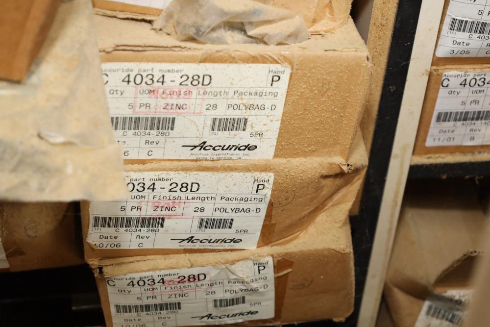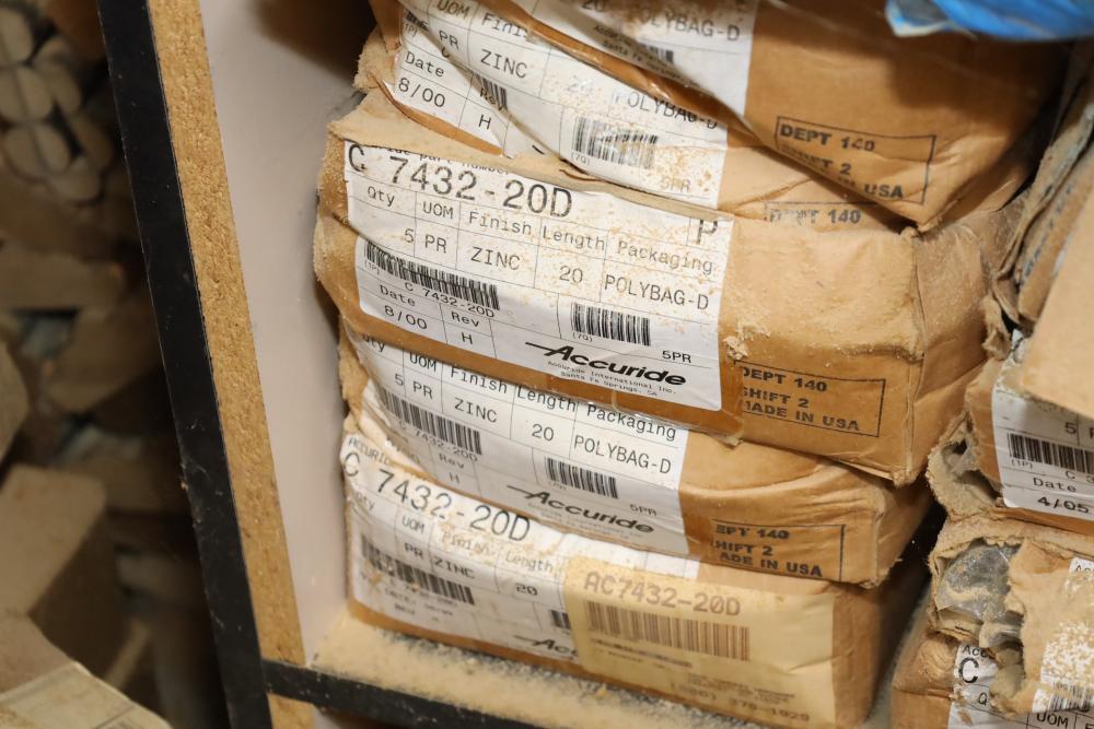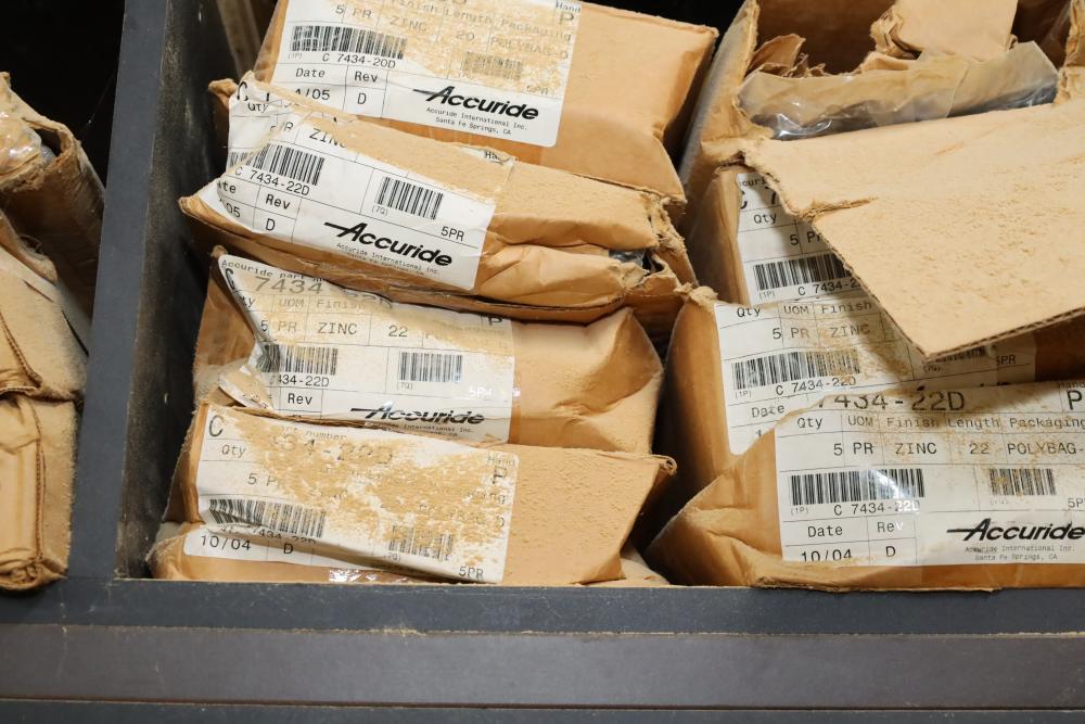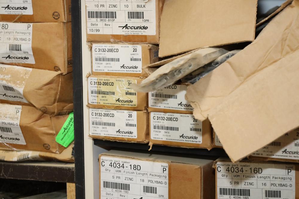 Large quantity of cabinetry hardware including accuride drawer slides part numbers include c3832-b20p, c7434-18d, 4034-18D, C3132-20ECD, etc. Buyer must take all. Buyer is responsible for the proper and safe removal to the first disconnect including bringing all the proper tools, equipment, supplies, and help. There will NOT be any help or equipment onsite to assist in removal.
